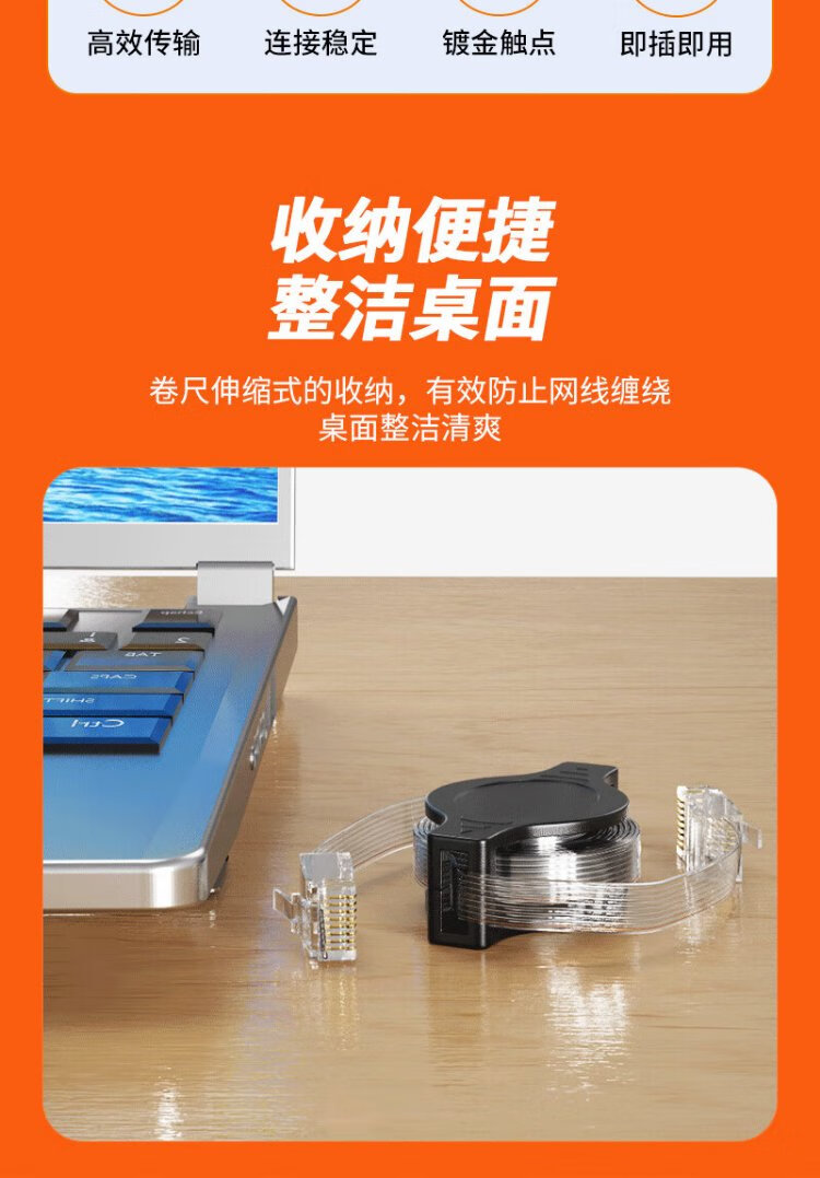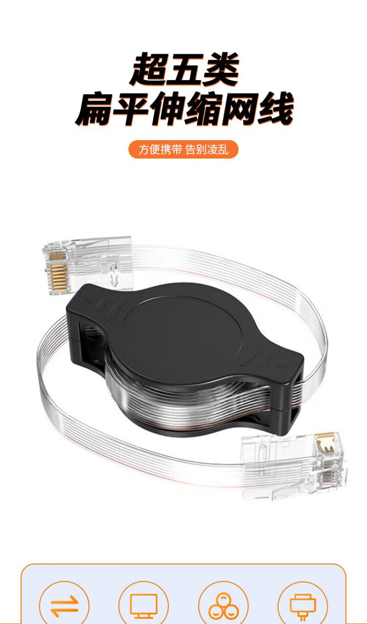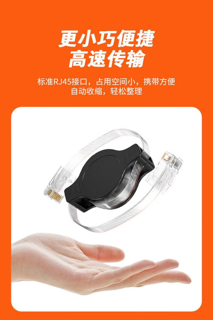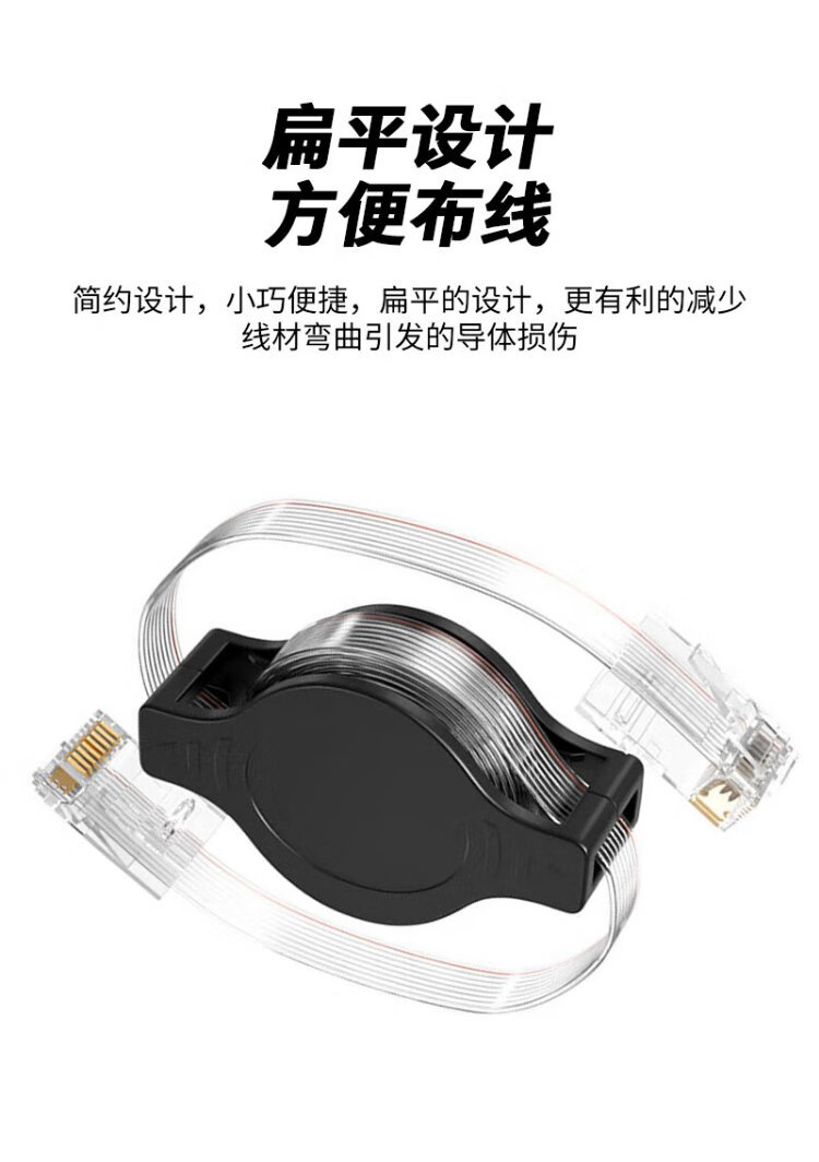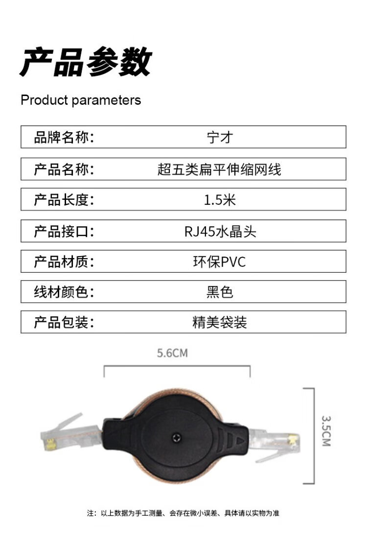 Ningcai (NINGCAI) retractable network cable 8-core Category 5e flat automatic shrinking network jumper NC-5E45-1.5M transparent cable body/black reel portable version 1.5 meters
