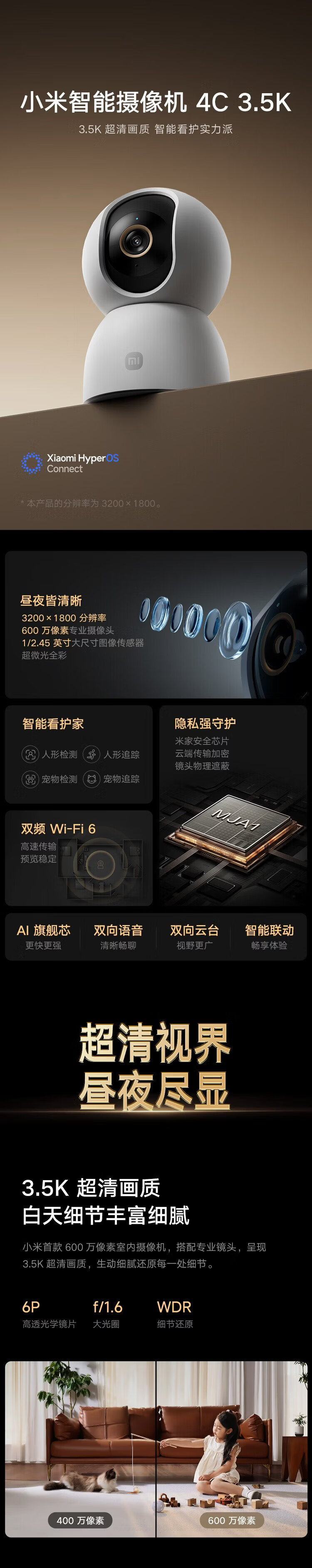 Xiaomi Smart Camera 4C 3.5K 6 Megapixel Ultra Low Light Full Color AI Humanoid Detection Mobile Phone Viewing Home Camera Baby Pet Caregiver Indoor Monitoring