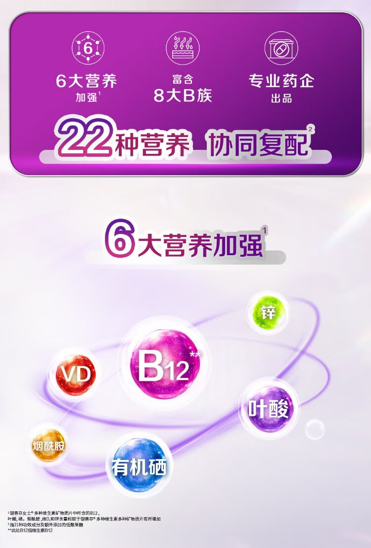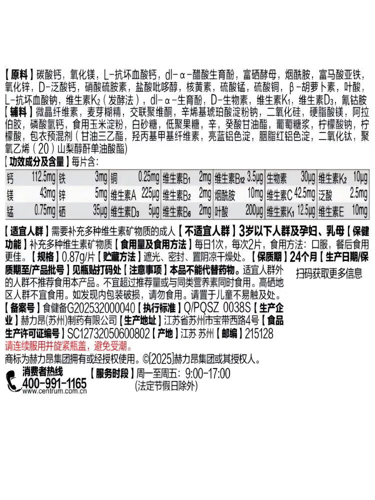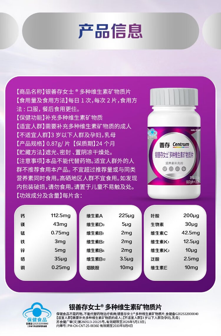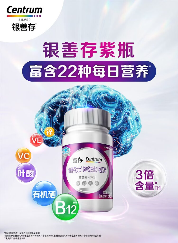 Centrum Women's Multivitamin Brain Bottle B Group Niacinamide Folic Acid VK2D3C Zinc Middle-aged and Elderly Silver Centrum 120*2