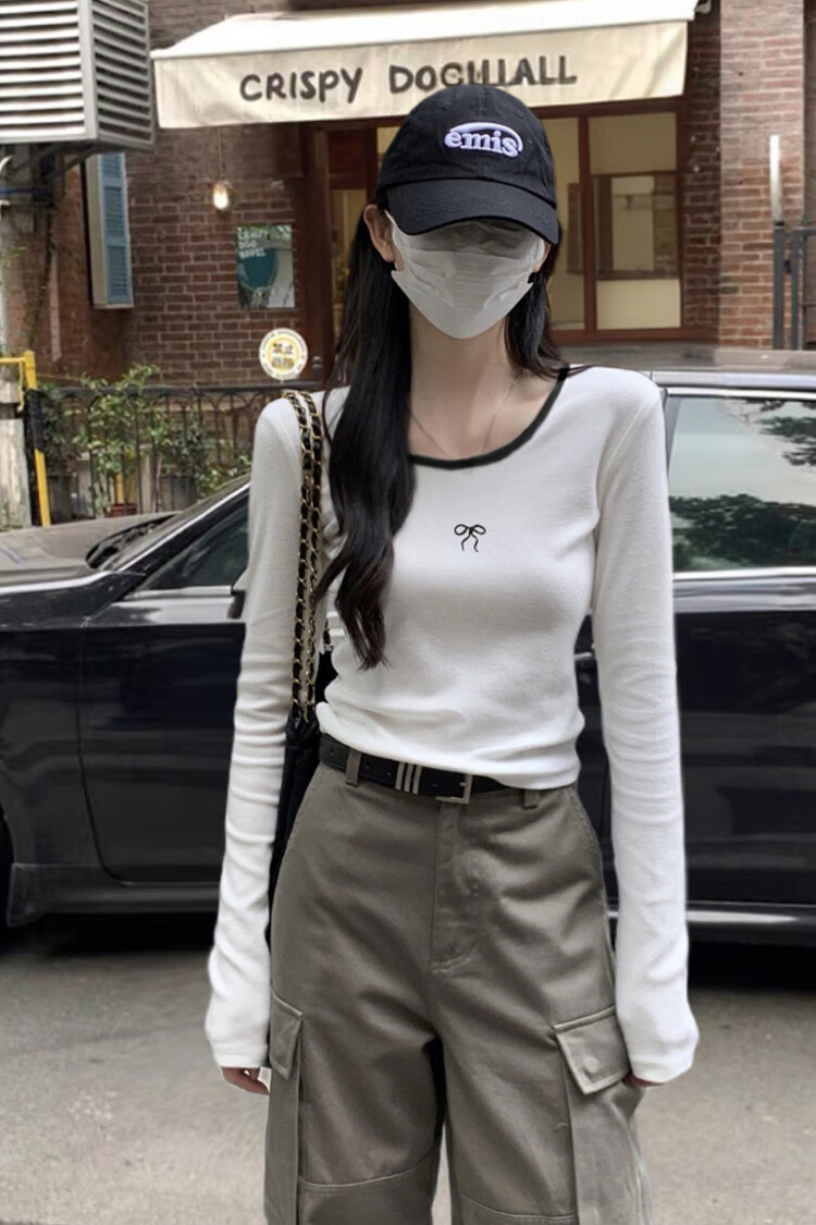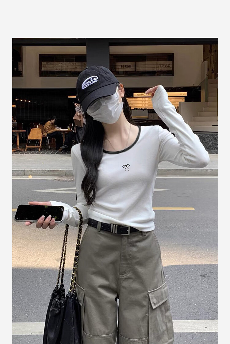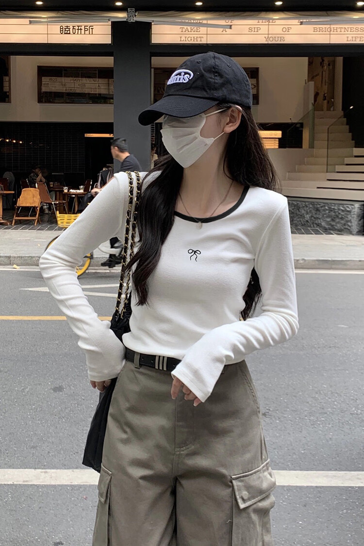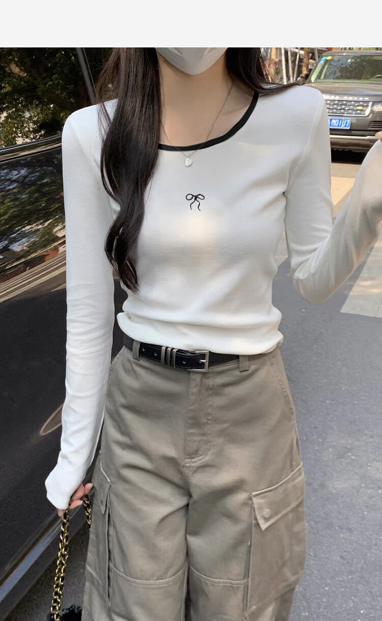 TonLion 2025 Autumn and Winter Women's Round Neck Collar Front Chest Pattern Long Sleeve Bottoming Shirt