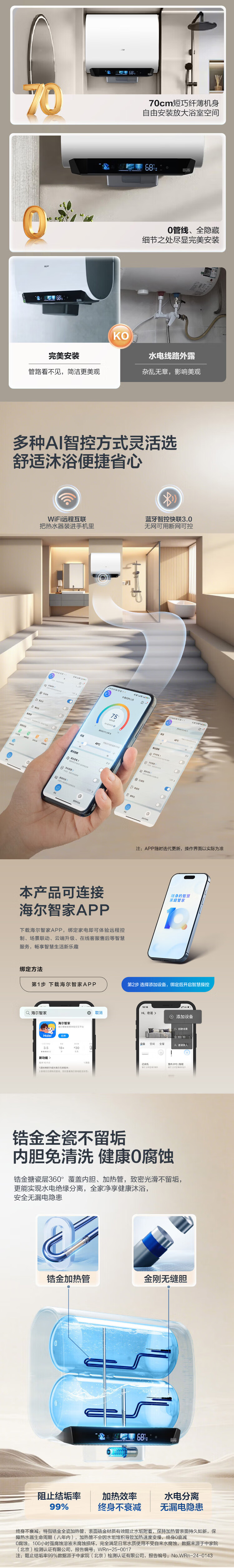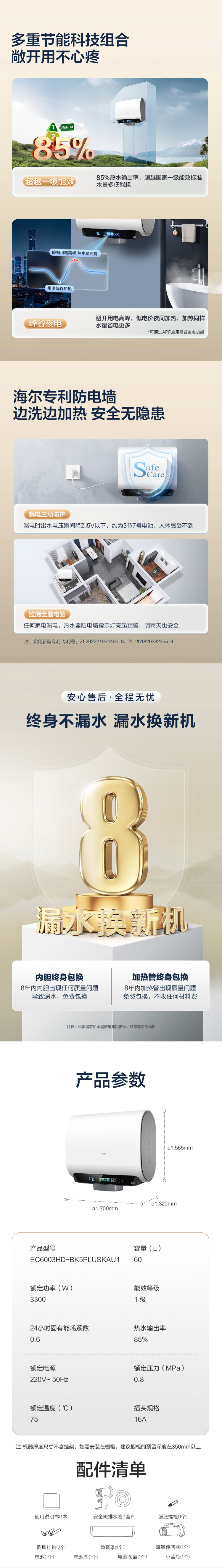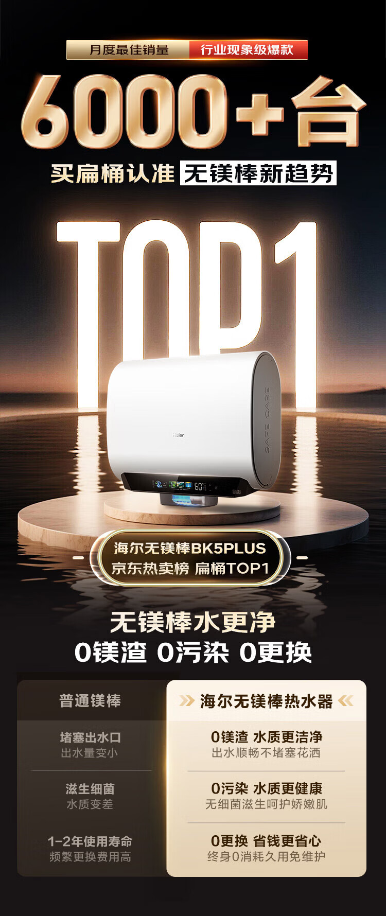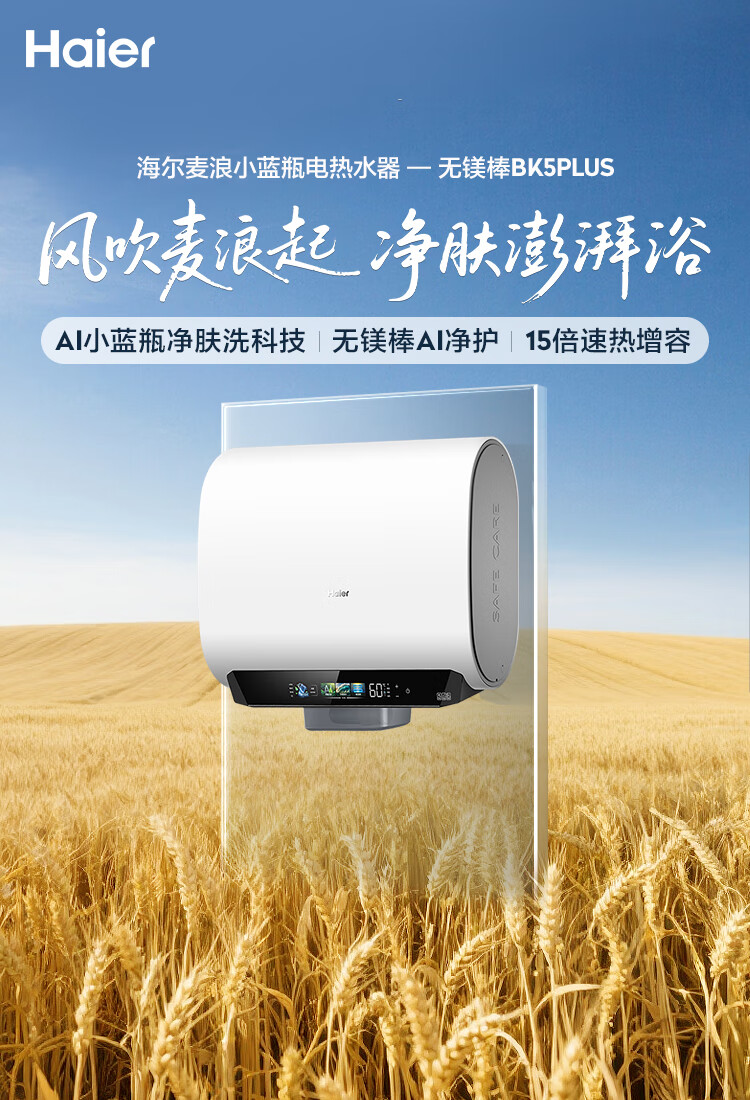 Haier Mailang series electric water heater, state-subsidized double-gallon flat barrel 60 liters BK5PLUS BK5 upgraded strontium-rich small blue bottle without magnesium rod 3300W fast heating first-class energy efficiency