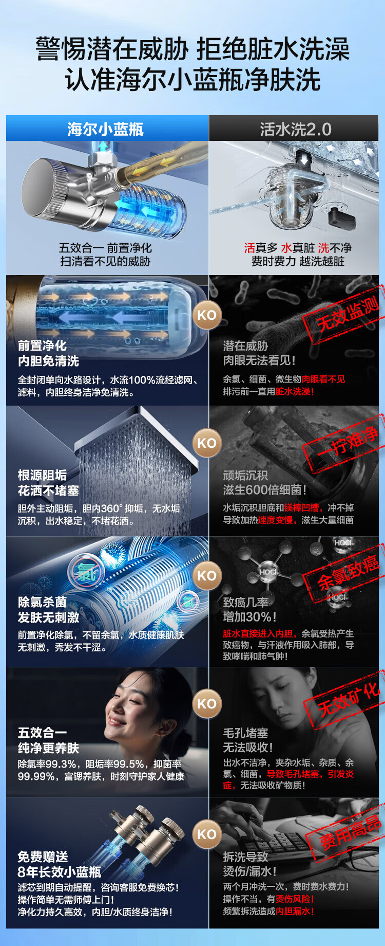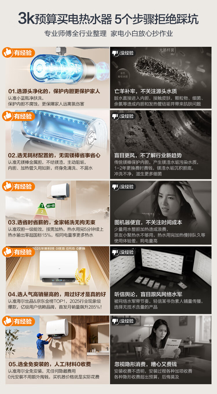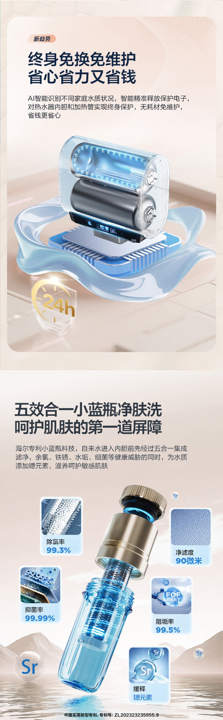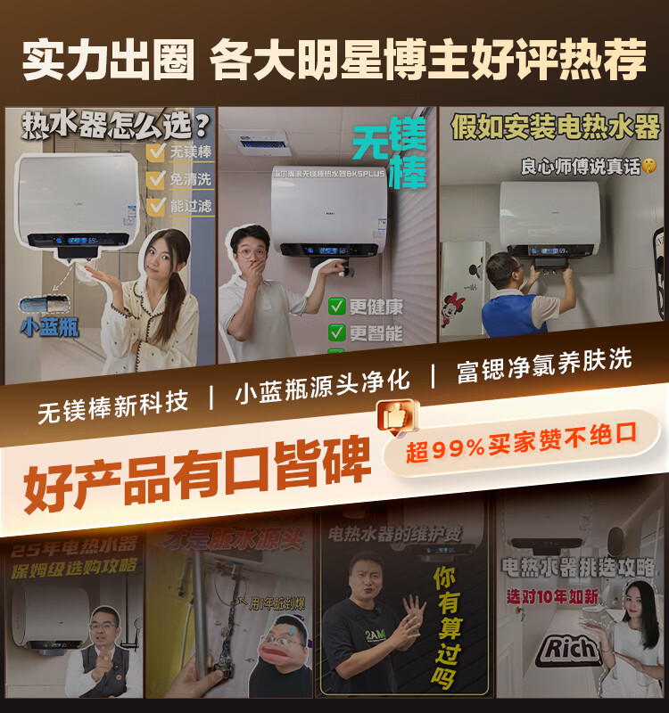 Haier Mailang series electric water heater, state-subsidized double-gallon flat barrel 60 liters BK5PLUS BK5 upgraded strontium-rich small blue bottle without magnesium rod 3300W fast heating first-class energy efficiency