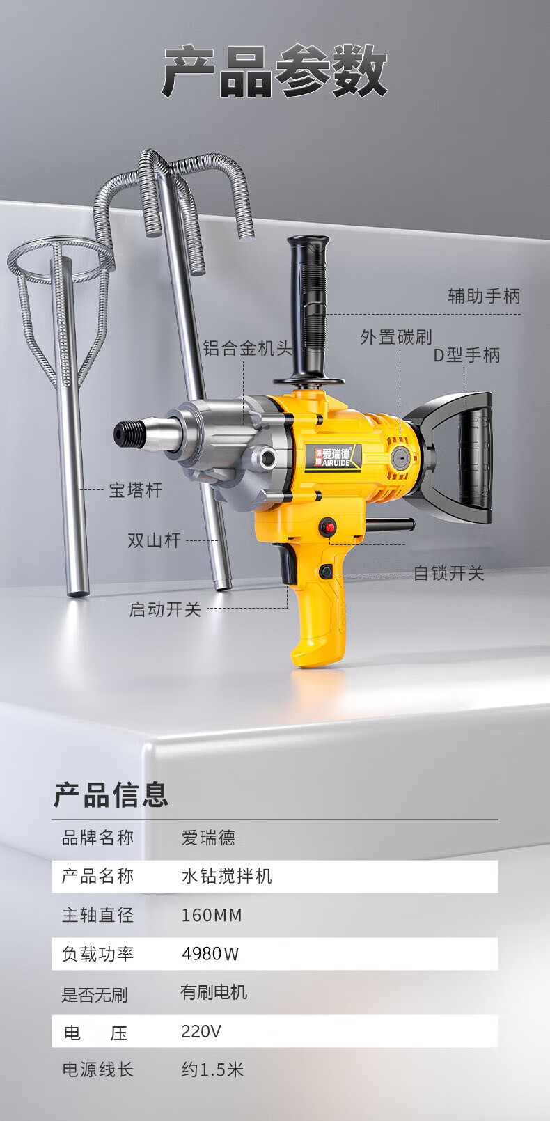 Aired Electric Mixer High Power Aircraft Drill Speed Adjustable Concrete Paint Cement Putty Powder Mixer 6-speed Speed Adjustment Upgrade (With Mixing Rod)