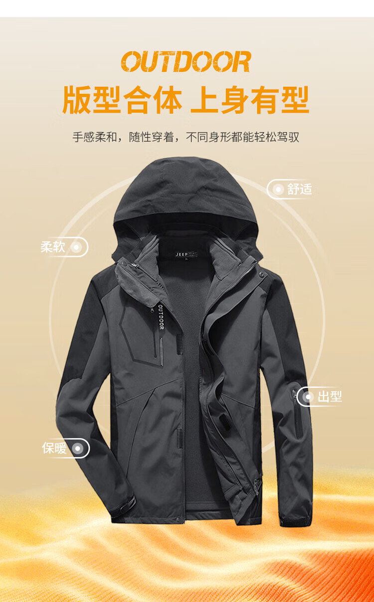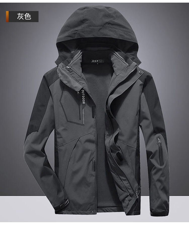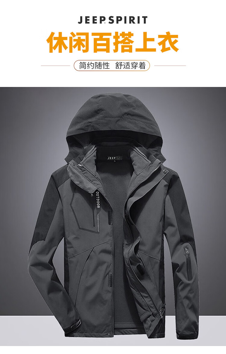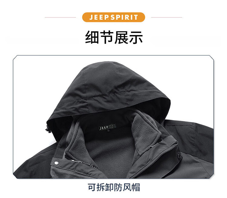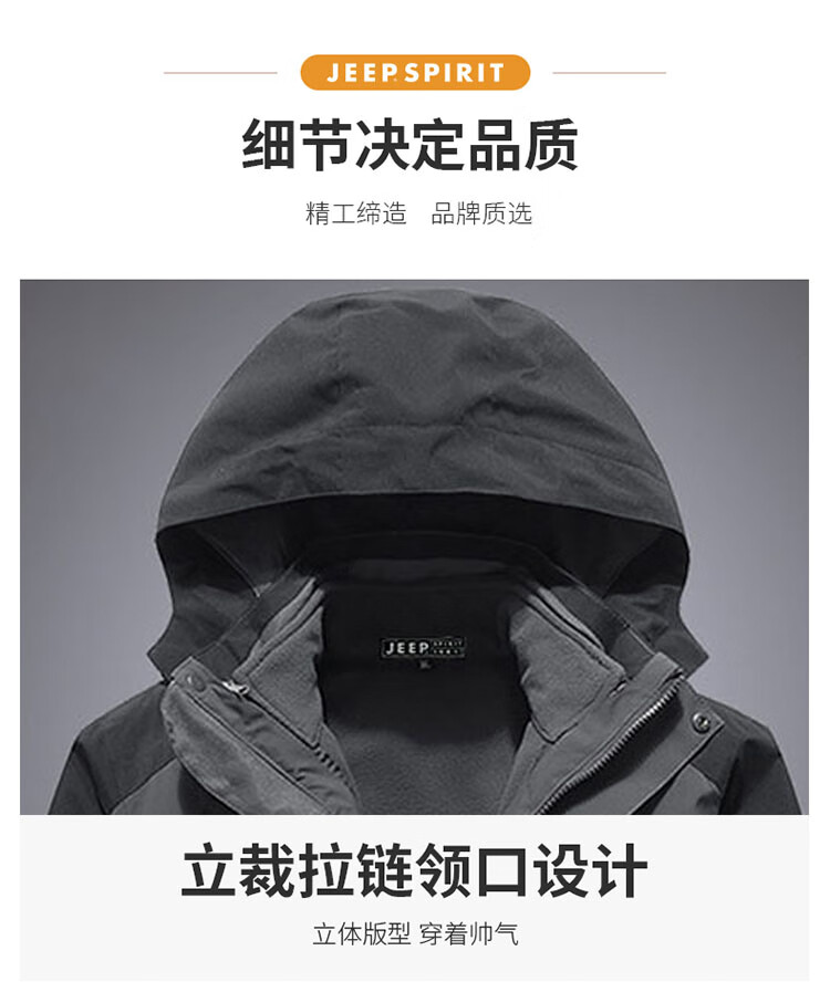 JEEP SPIRIT Jeep Jacket Men's Jacket Autumn and Winter Three-in-One Removable Thickened Windproof Mountaineering Jacket Gray 2XL