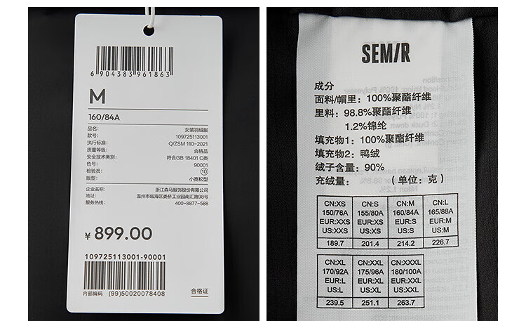 Semir Chen Duling | 90 down jacket women's 25 winter long three-proof anti-static hooded jacket 109725113001