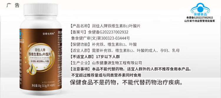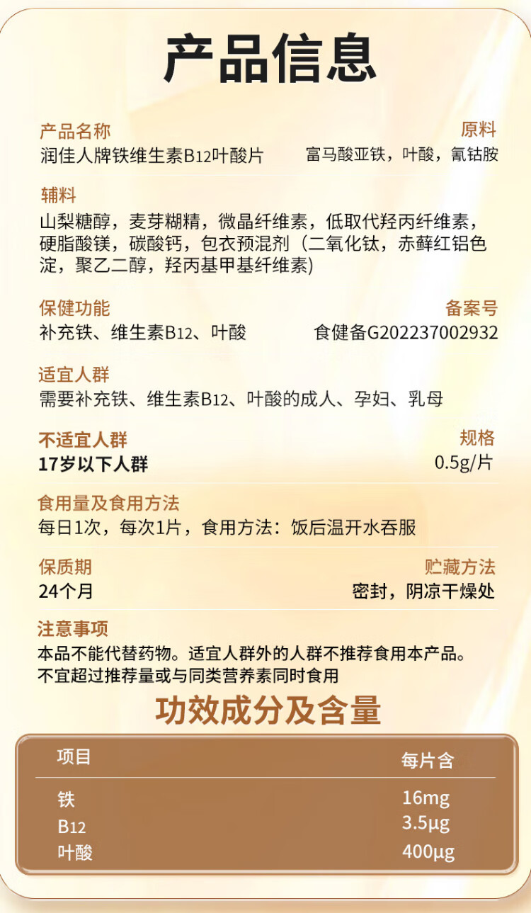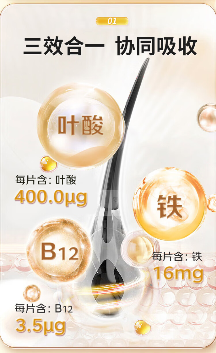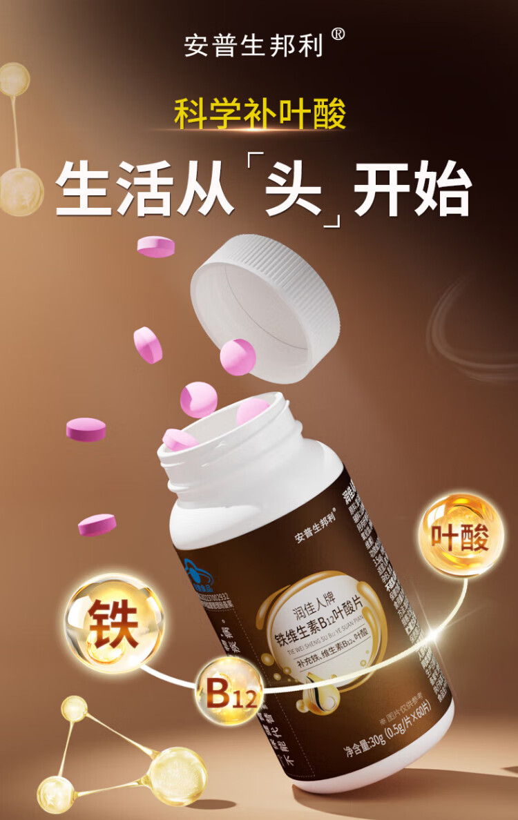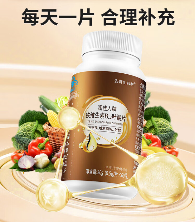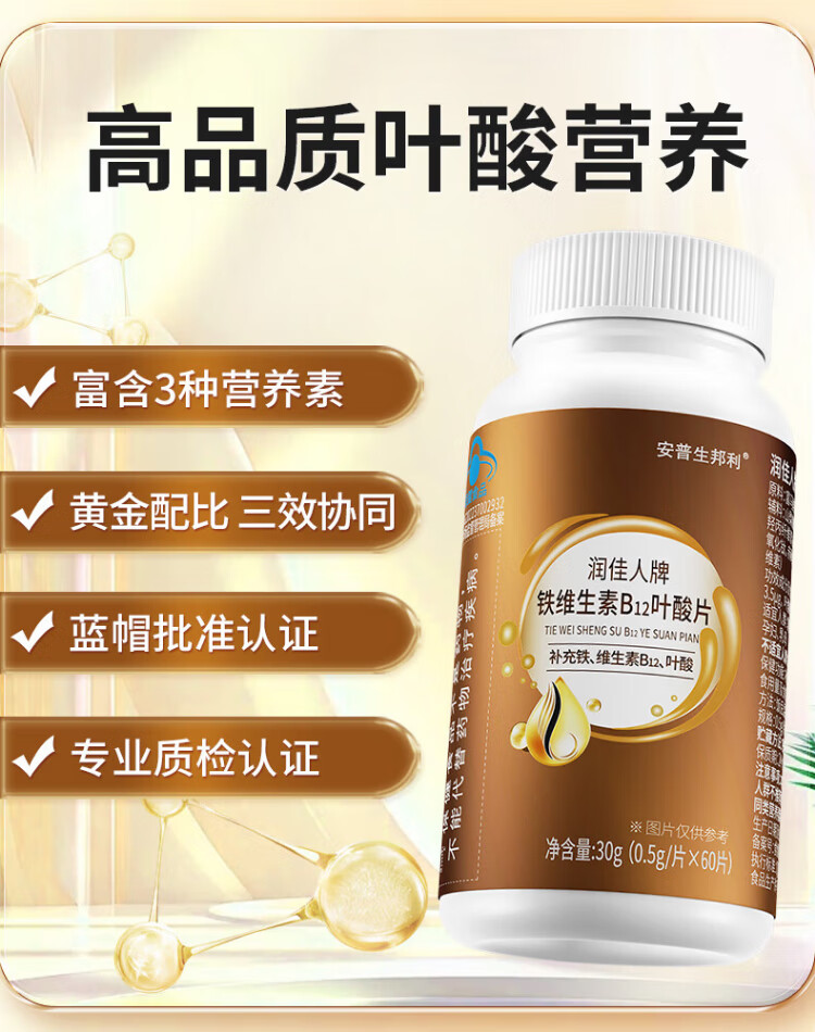 Ambrosin Bangli Iron Vitamin B12 Folic Acid 60 tablets for adults, men and women, middle-aged and elderly white hair and black hair active products for pregnant women to prepare for pregnancy