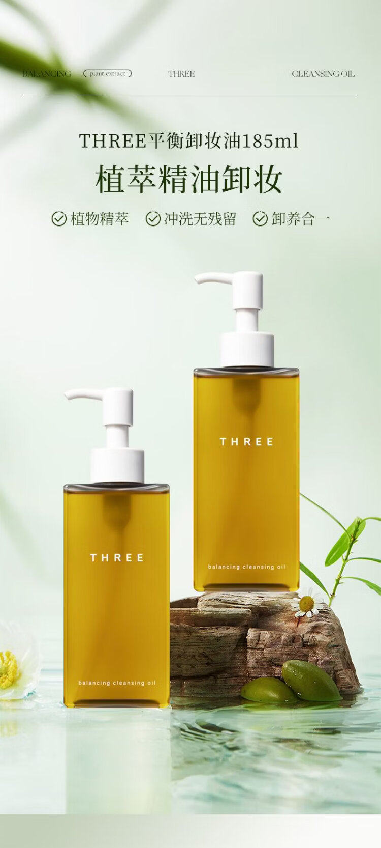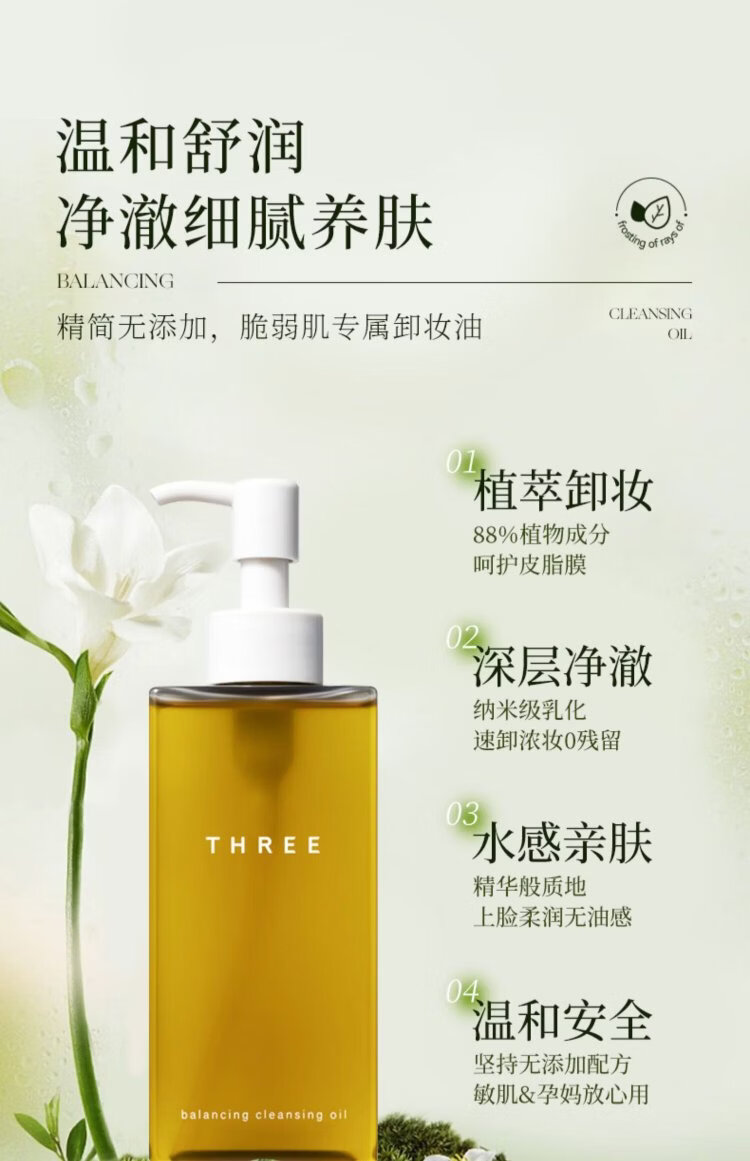 THREE Balanced Cleansing Oil 185ml deep cleansing, natural, non-irritating, gentle skin nourishing