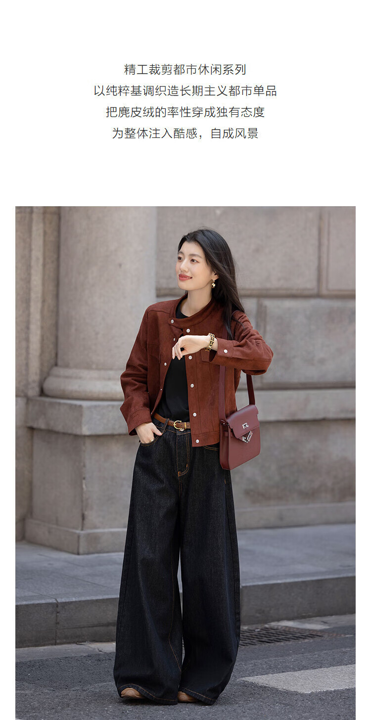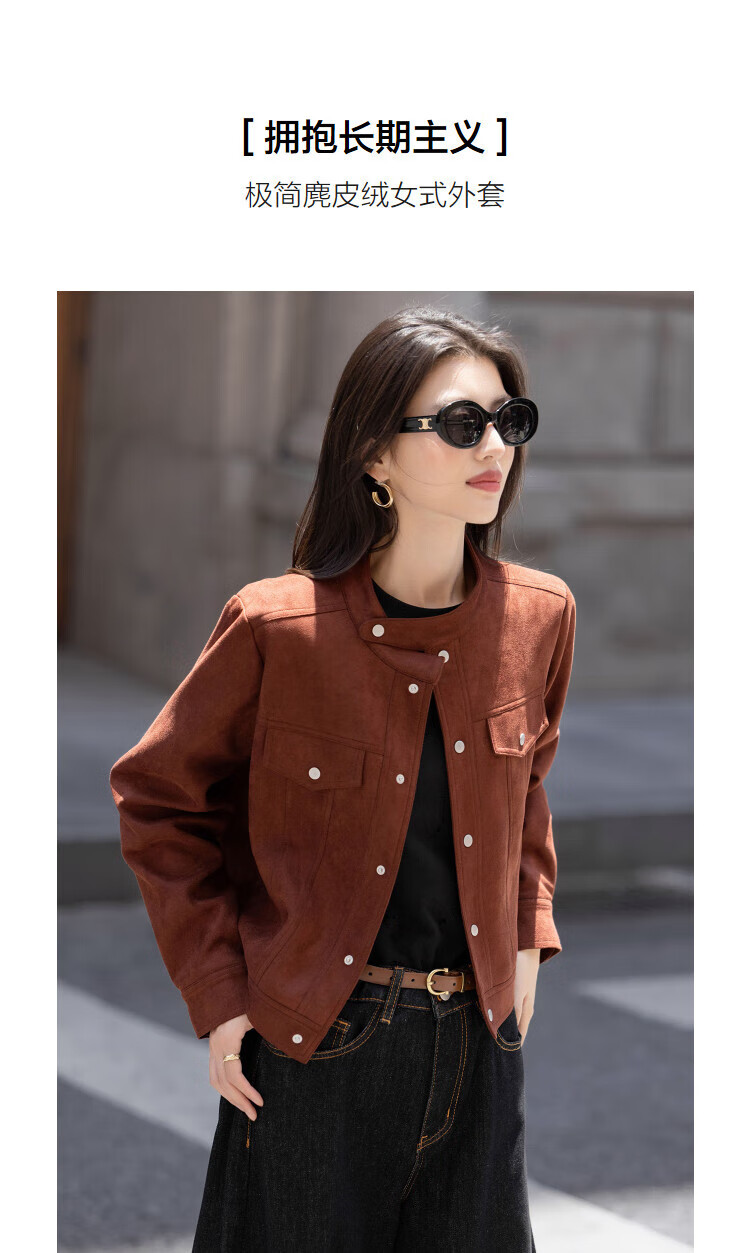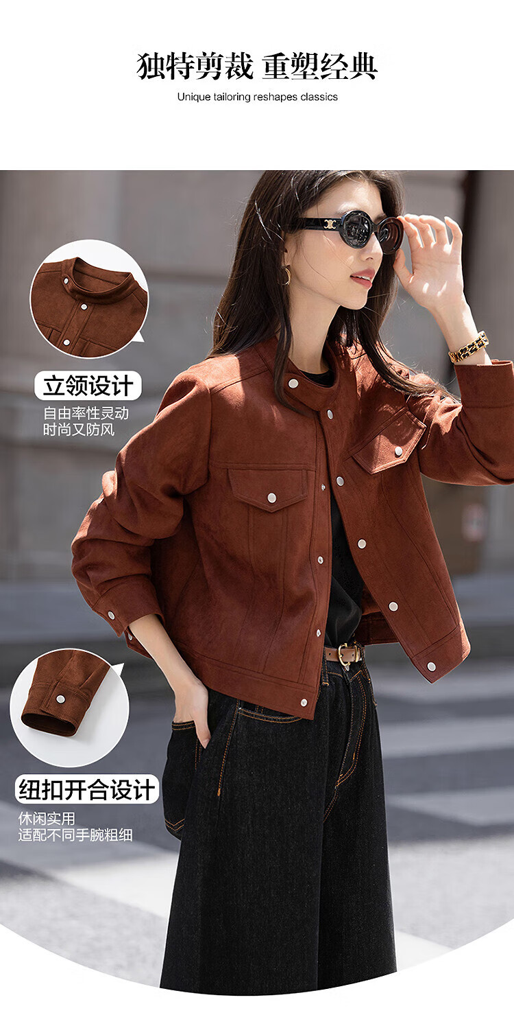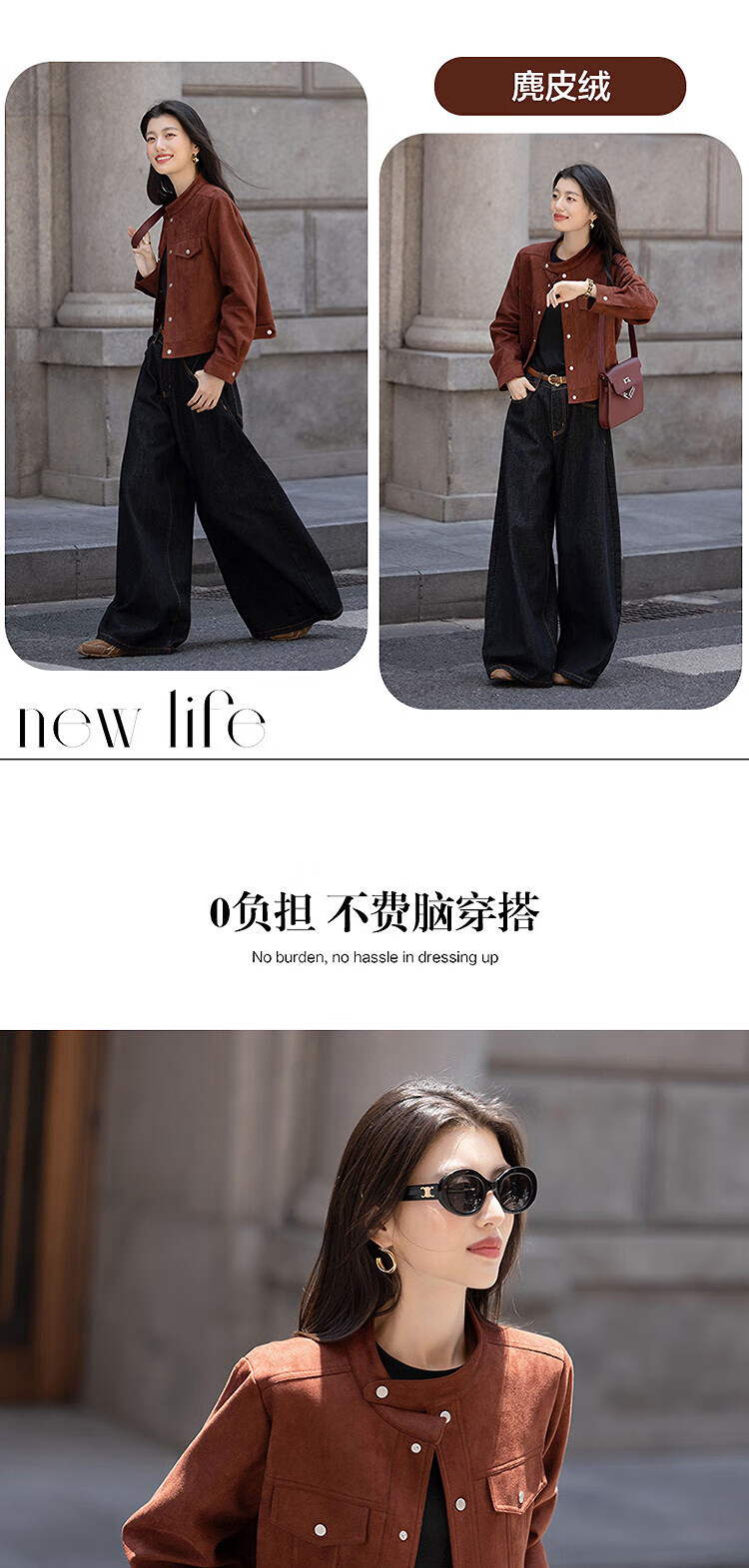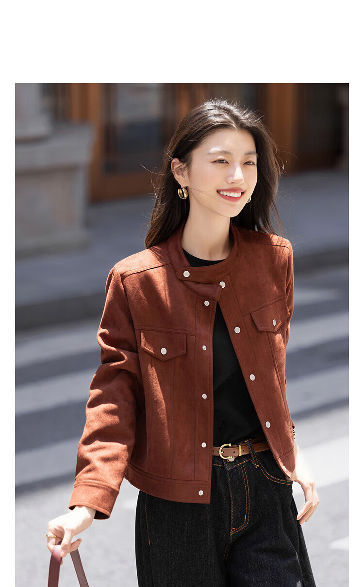 De Mana embraces long-termism, autumn minimalist style suede small stand-up collar fake pockets loose temperament women's jacket