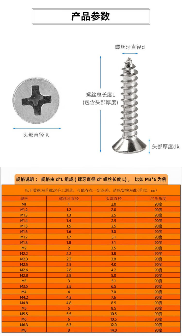 Tianli 304 stainless steel self-tapping screws, cross countersunk head flat head screws, extended KA wood screws
