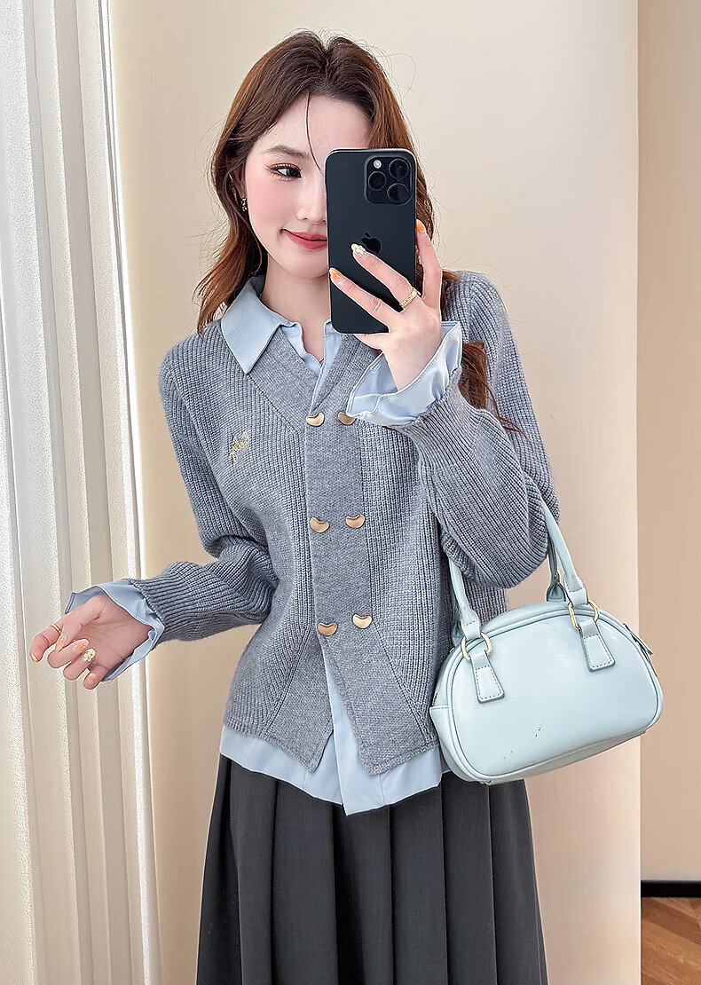 TonLion 2025 autumn and winter woven splicing lapel double-breasted fake two-piece women's cardigan sweater