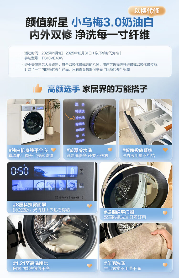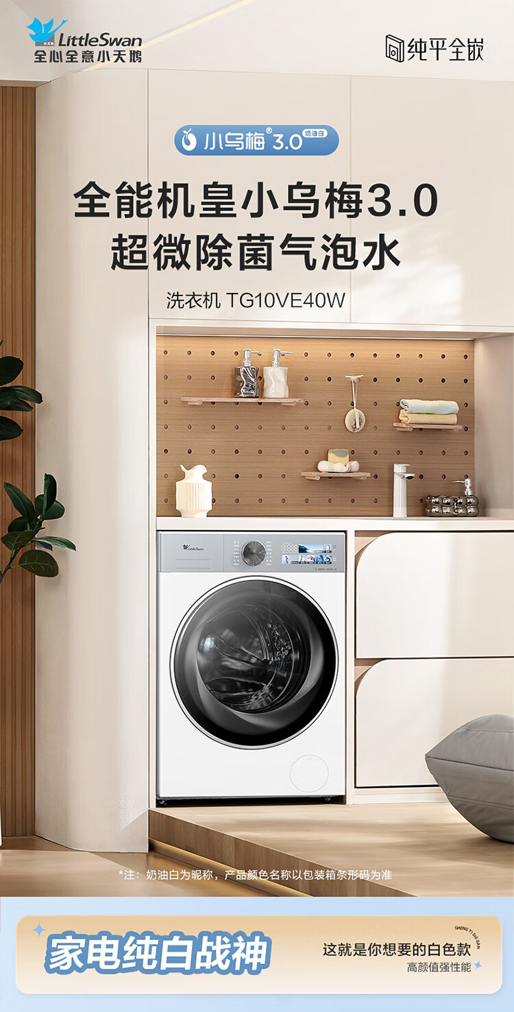LittleSwan Xiaowumei 3.0 cream white drum washing machine fully automatic 10kg ultra-thin large diameter flat screen TG10VE40W trade-in national subsidy JD.com self-operated