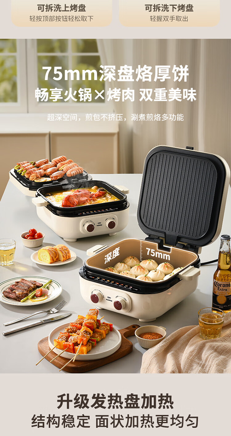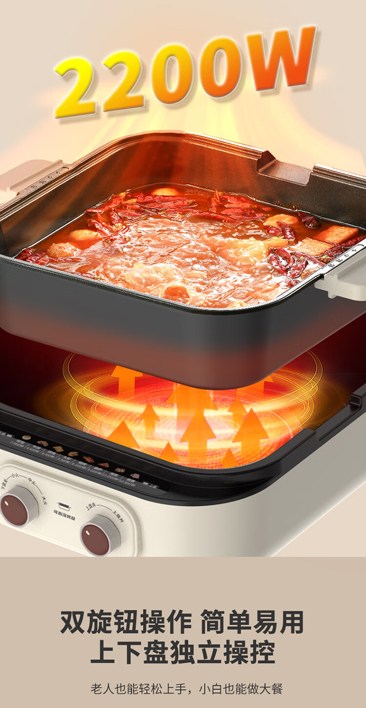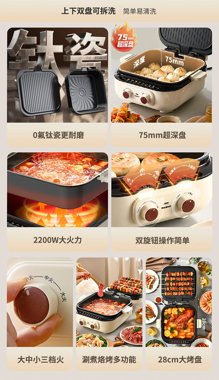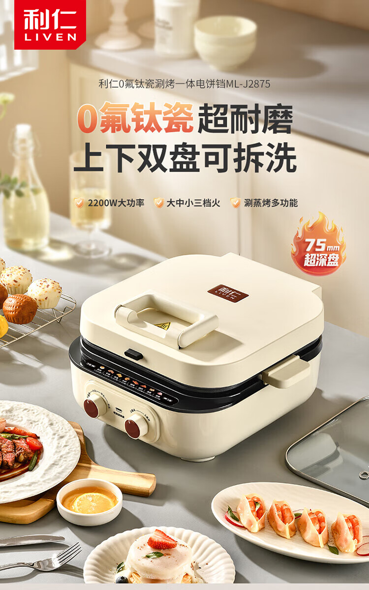 Liven 2025 New Xiaodundun Electric Cake Pan 0 Fluorine Titanium Porcelain Upper and Lower Plate Removable Household Shabu-shabu Integrated Pot Larger and Deeper 2200W Multifunctional Electric Hot Pot Breakfast Machine ML-J2875