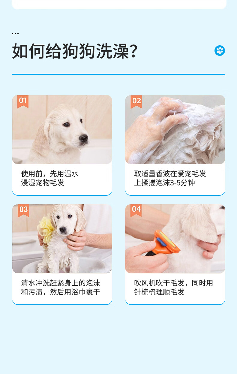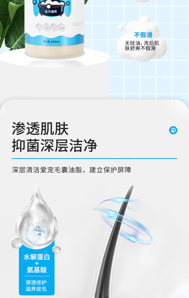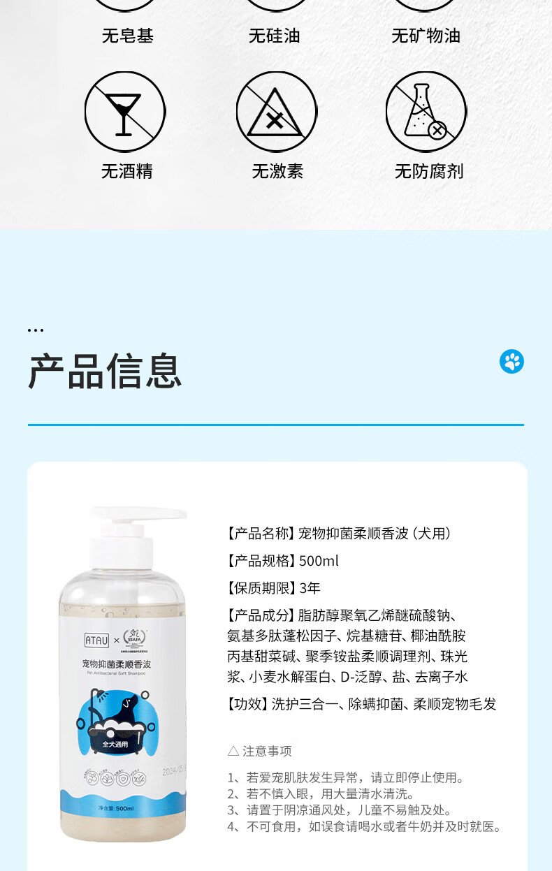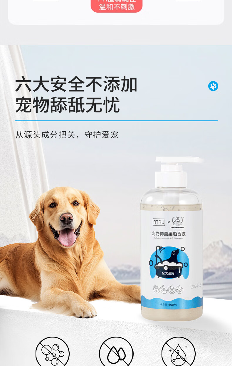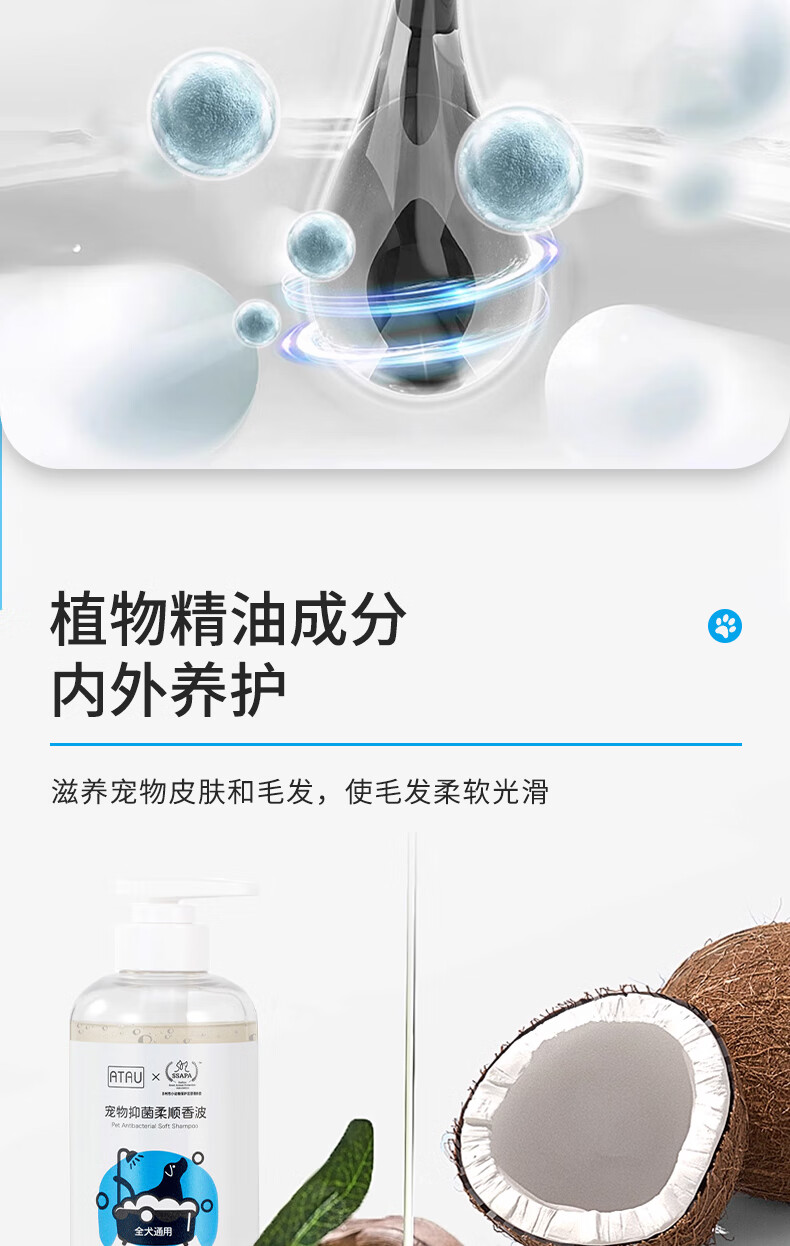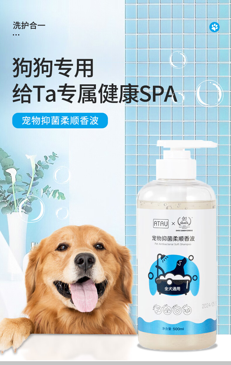 ATAU dog-specific shower gel is antibacterial, removes mites, and deodorizes shampoo and shower gel, protects hair, leaves fragrance, relieves itching, is gentle, smooth, and removes stains