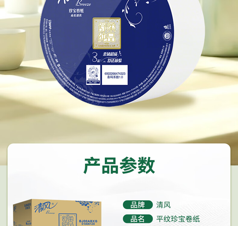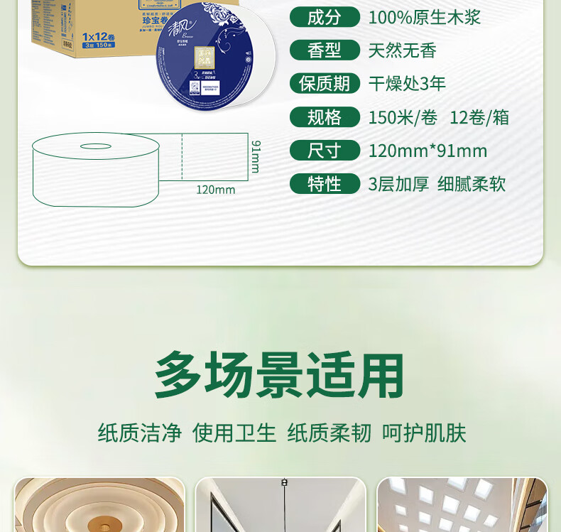 Qingfeng Jumbo Roll Paper Commercial Core Large Tissue Paper Toilet Paper Toilet Paper Hotel Shopping Mall Catering Restroom Property Office Paper 3 Layers 150 Meters * 12 Rolls Full Box BJ00ABXG