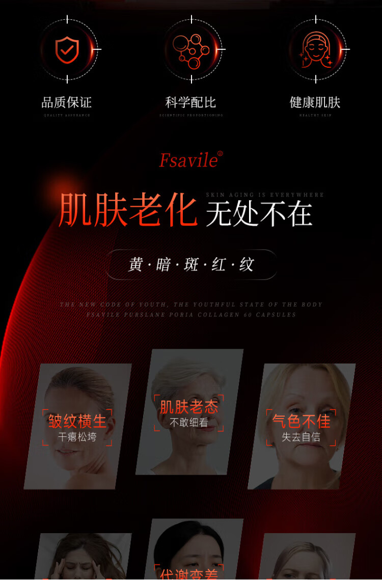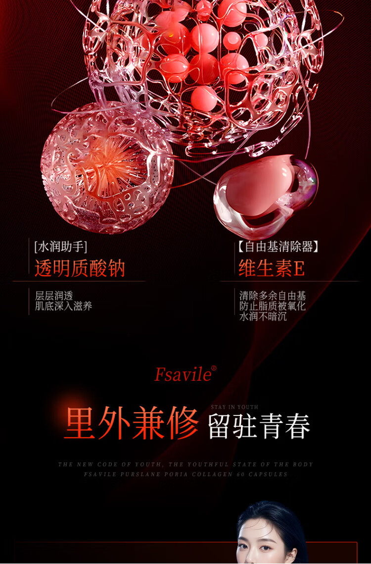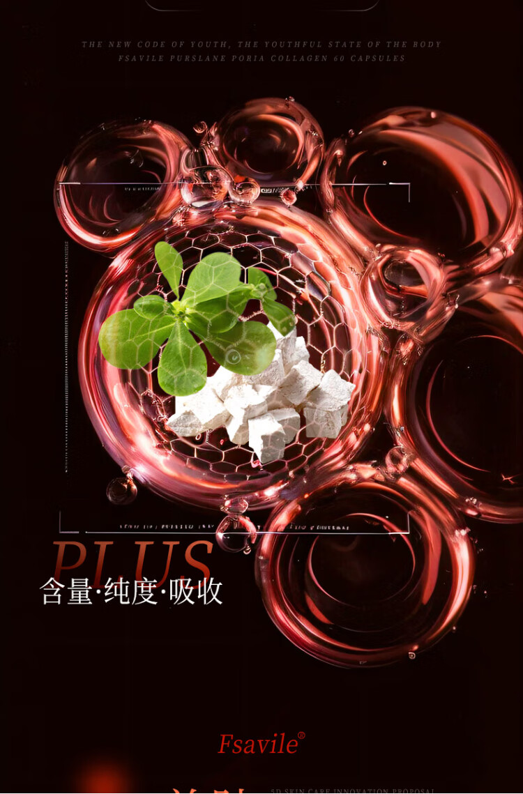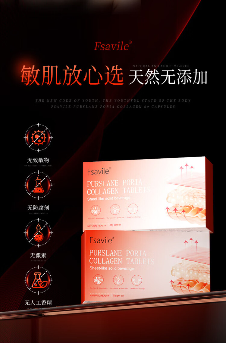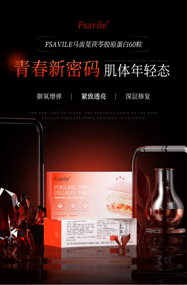 FSAVILE Purslane, Poria, Collagen Peptide, Firming Skin, Anti-Aging Beauty, Focusing on Skin Aging 60 Tablets