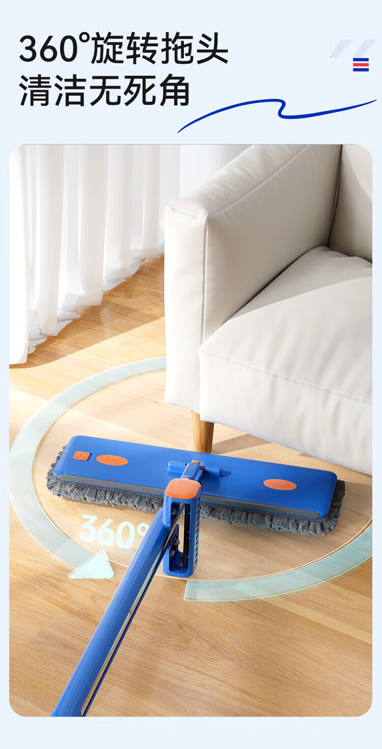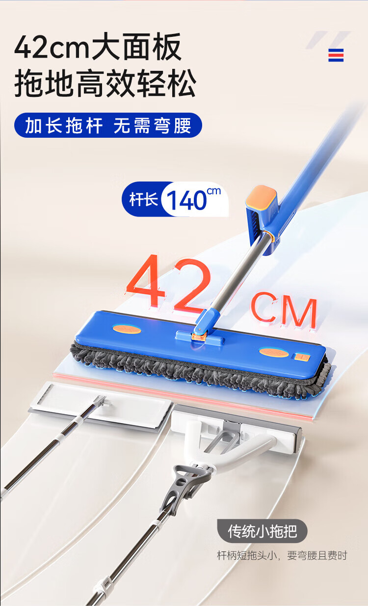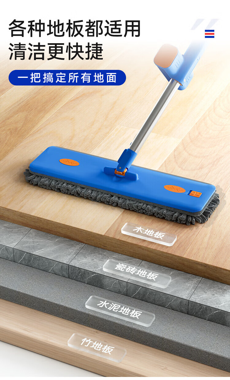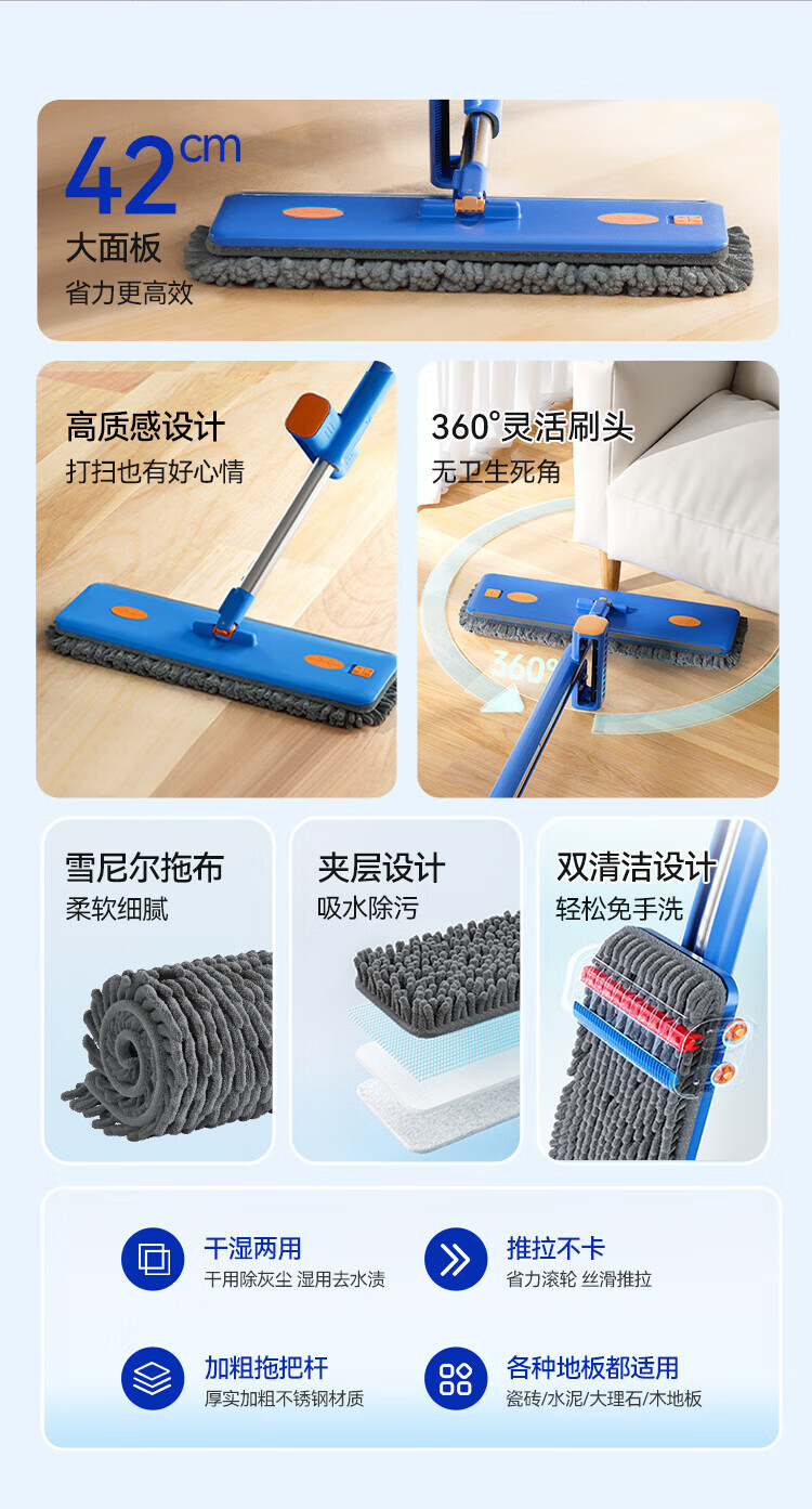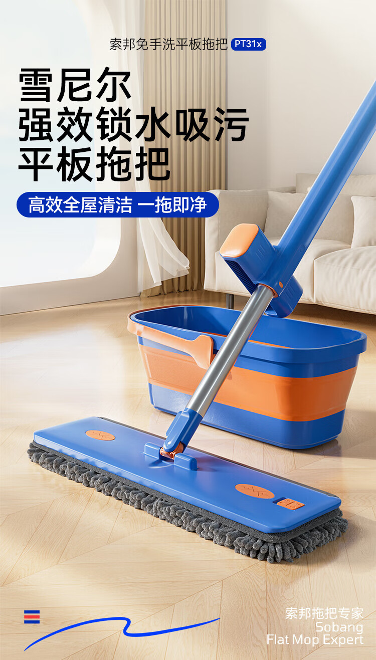 Sorbonne flat mop 42cm 4 cloth household one-mop hand-free chenille mop mopping artifact with bucket set