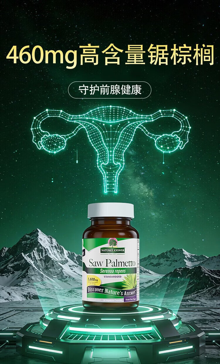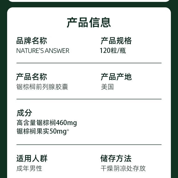 NATURE S ANSWER SINCE 1972 New Ansi imported saw palmetto prostate frequent urination urgent urination incomplete urination perineal hyperplasia hypertrophy calcification 120 capsules