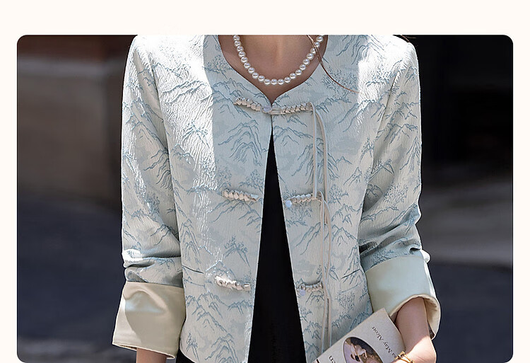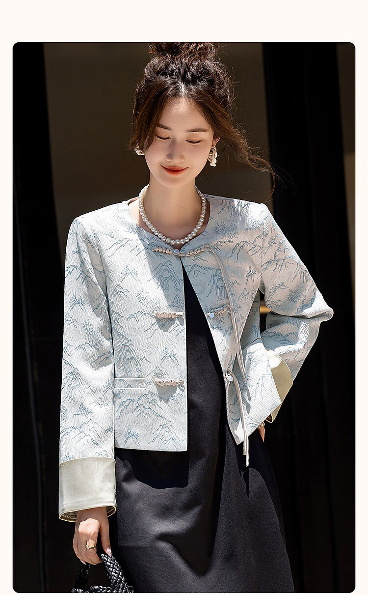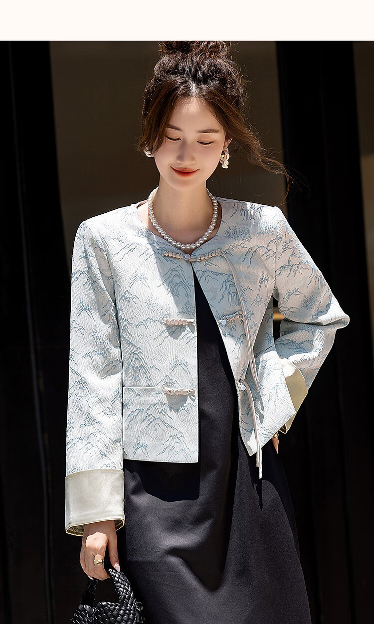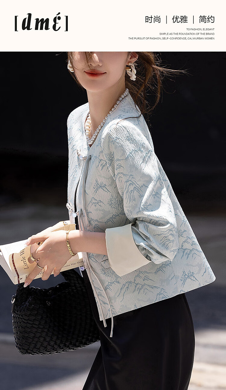 De Mana (dme) Cool White Tea Spring and Autumn Chinese Style New Chinese Style Round Neck Jacquard Double Placket Tassel Button Hidden Meat Jacket Women's Short Style