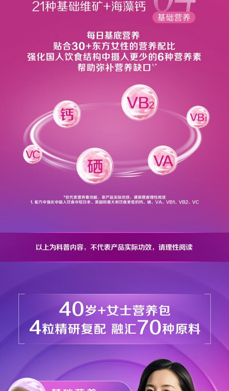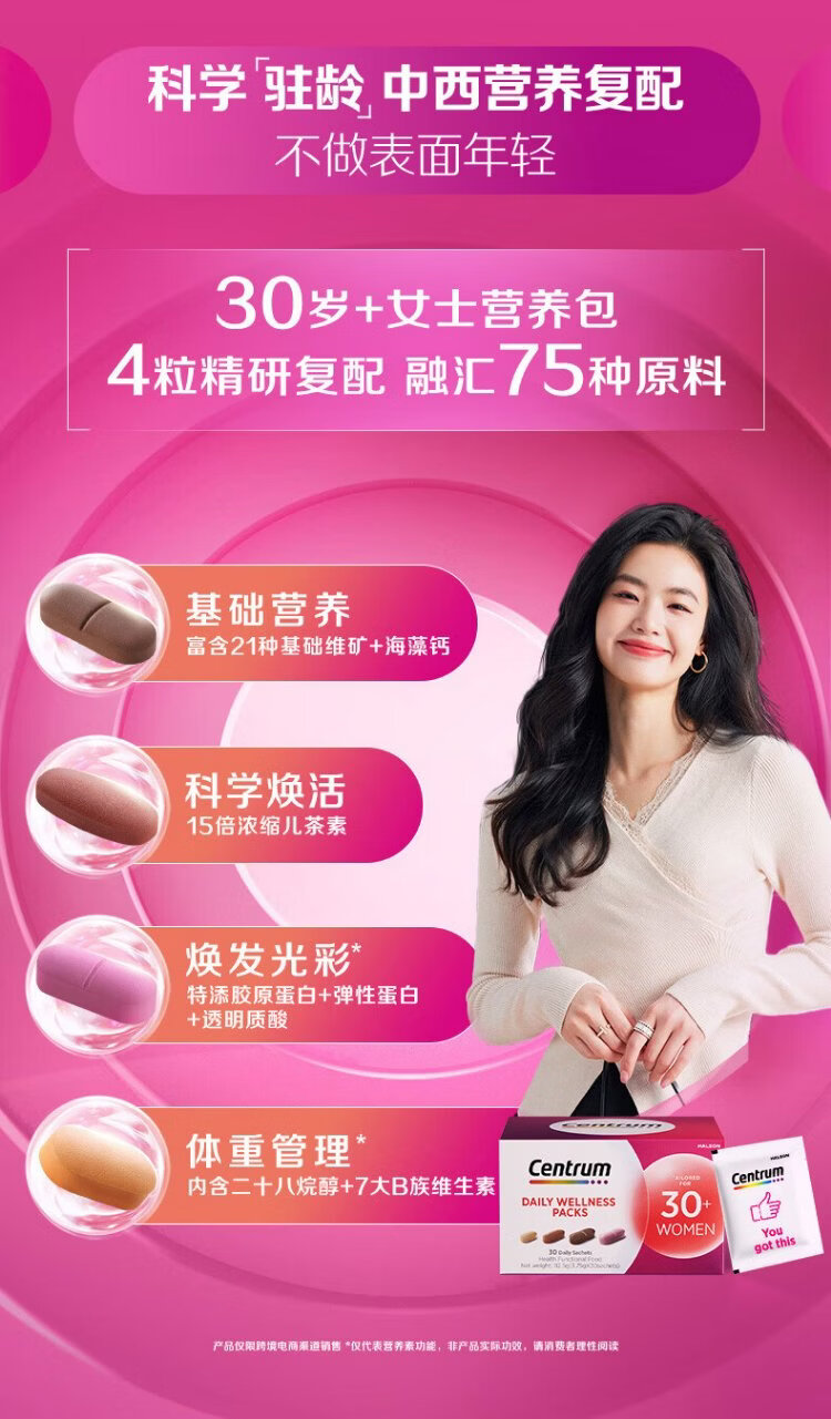 Centrum Overseas Daily Nutrition Pack for Women aged 30+, Vitamin B Complex VC Calcium Iron Niacinamide Replenishes Qi and Protects Oxygen 30 packs/box*3