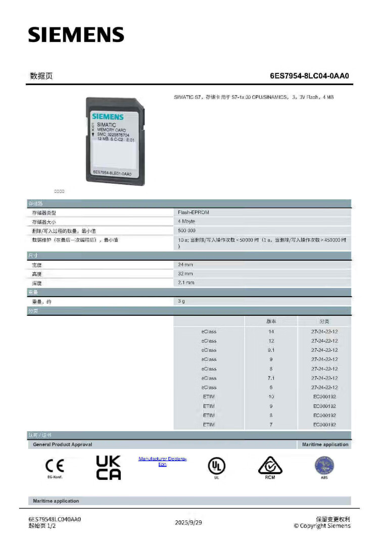 Siemens SIMATIC S7 memory card 6ES7954-8LC04-0AA0, 3V Flash / 4 MB
