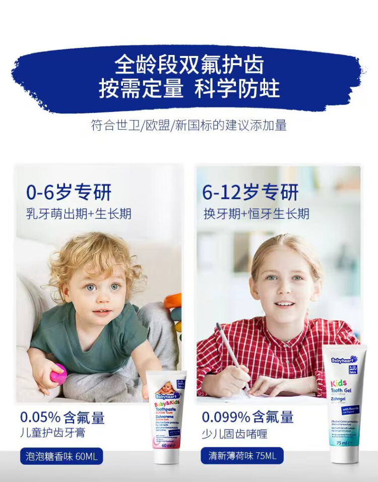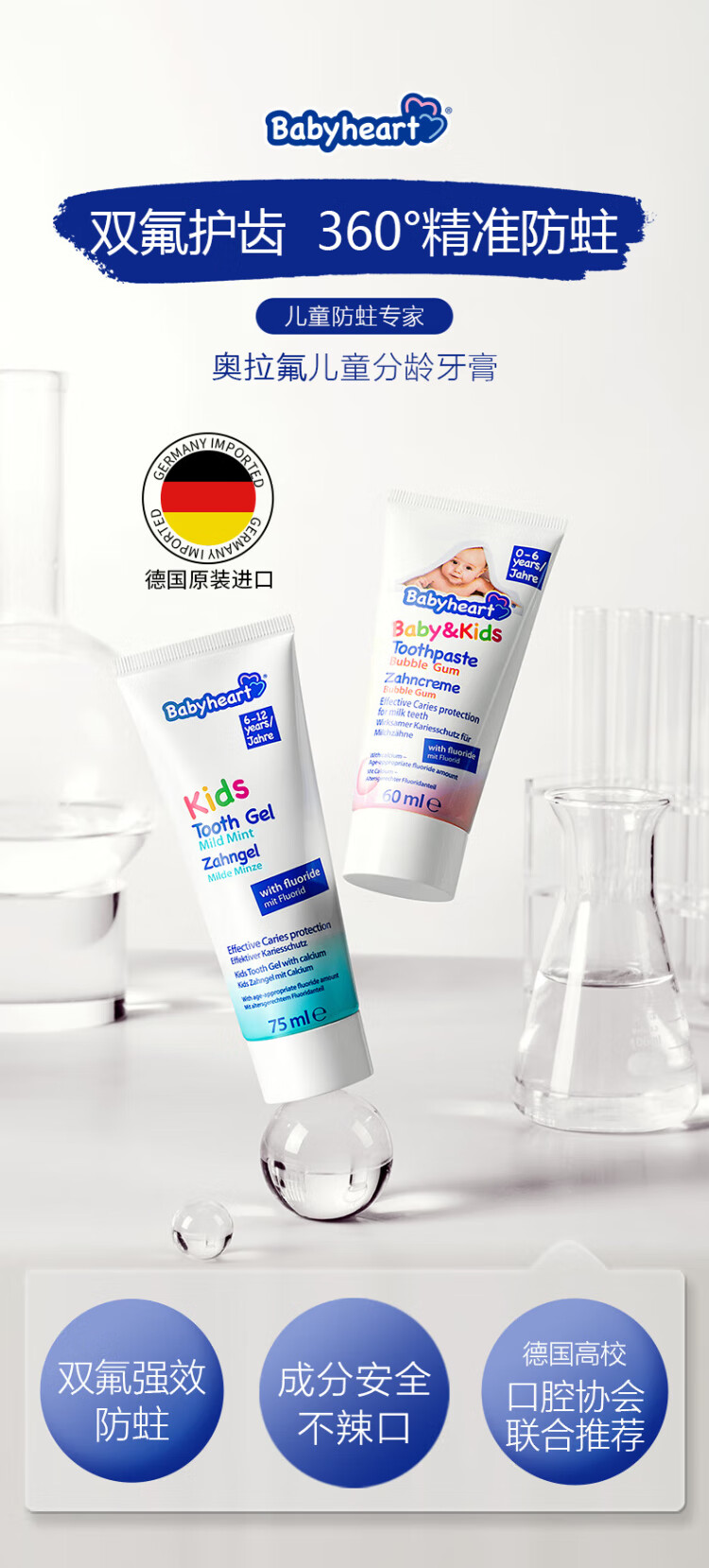Babyheart German imported children's toothpaste 0 to 6 years old contains fluoride for teething period baby infant anti-cavities anti-caries deciduous teeth period