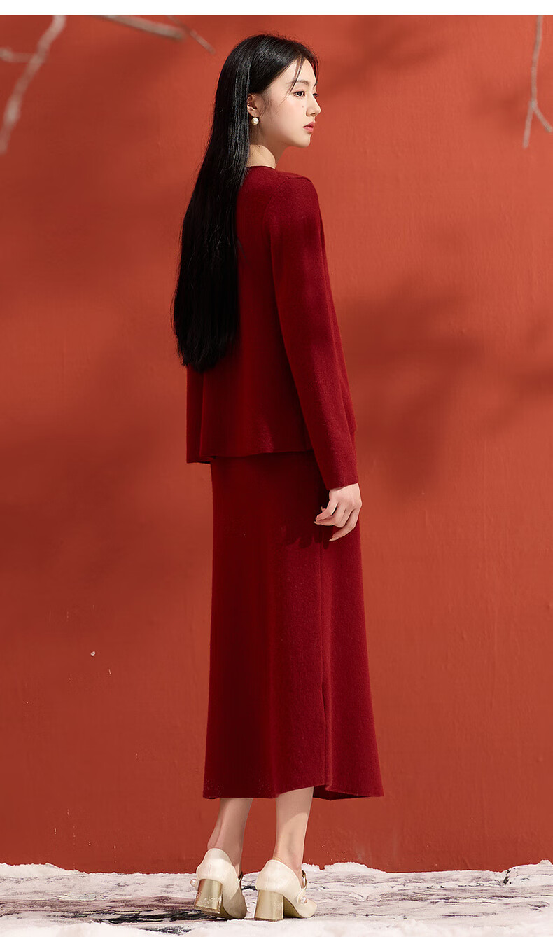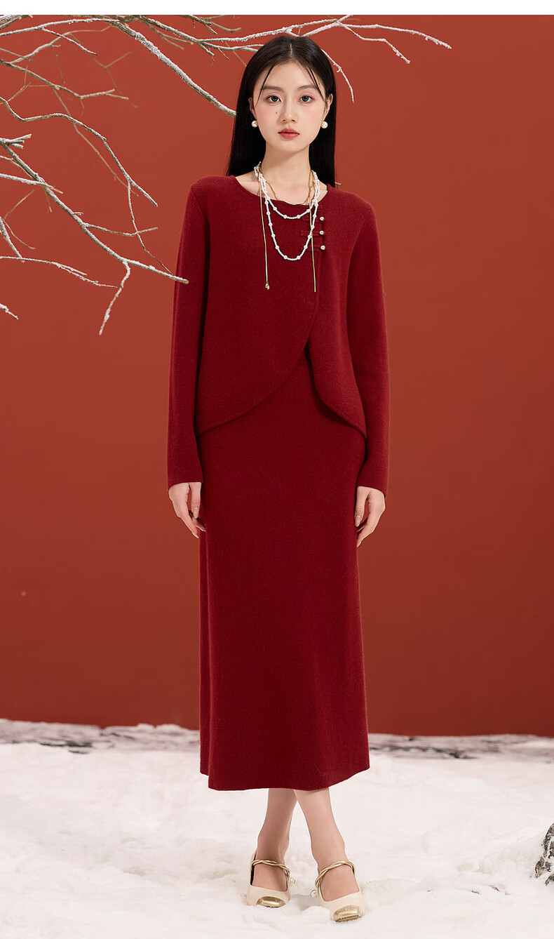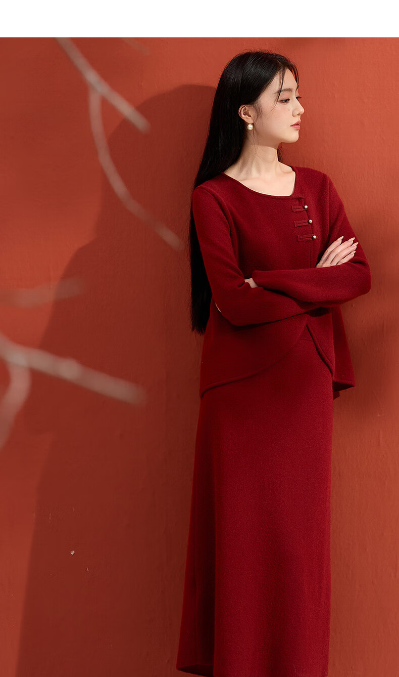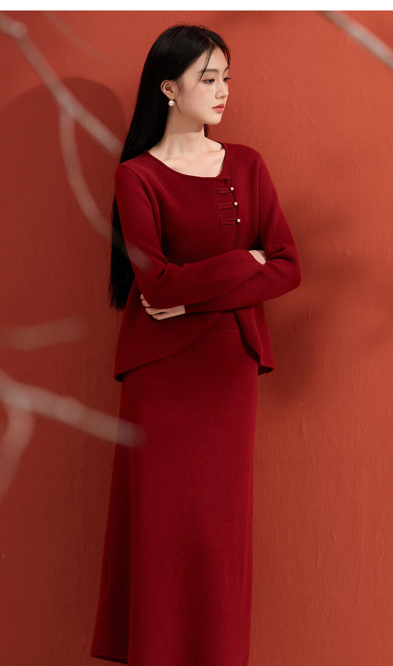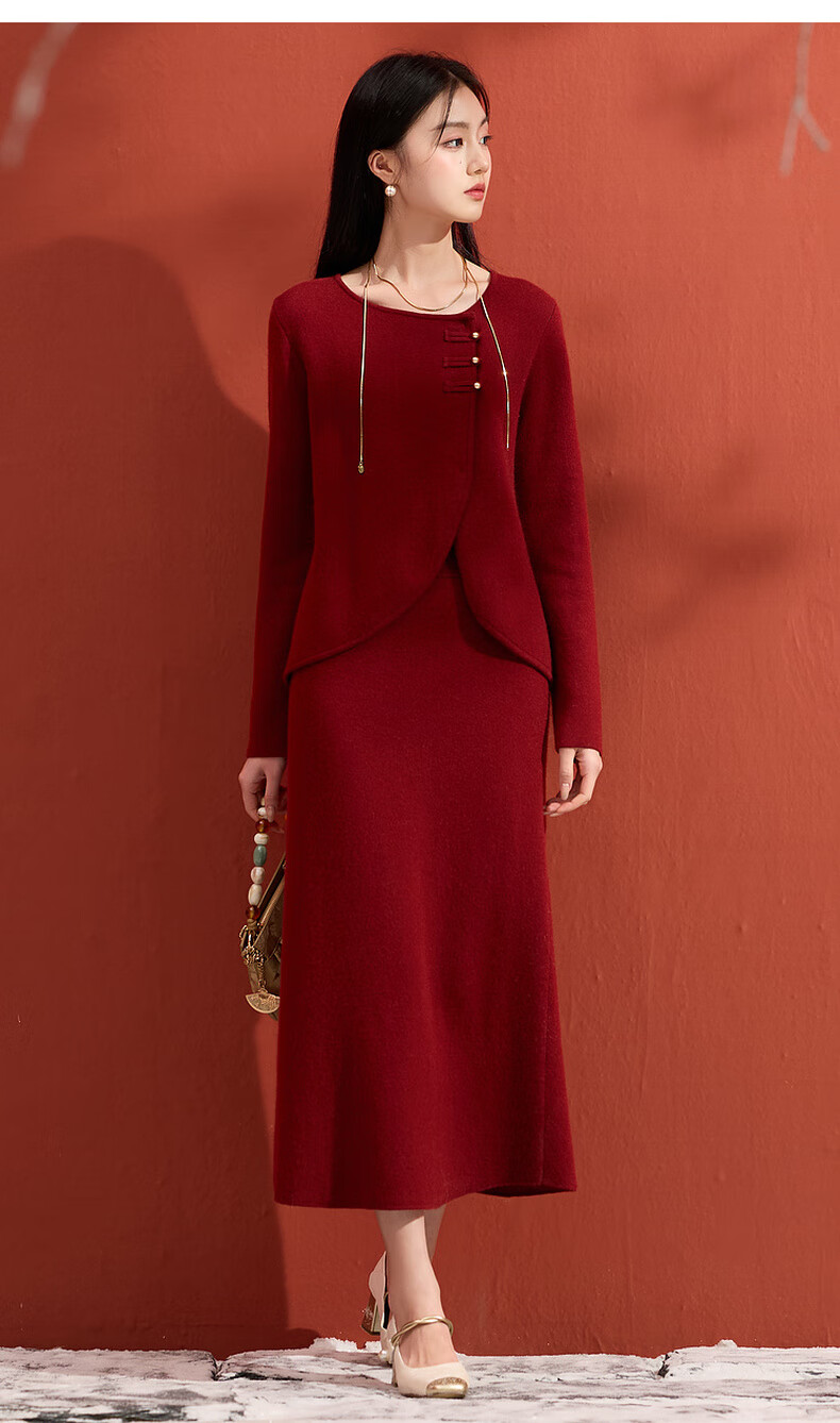 Sancai 2025 winter new Chinese style lucky red knitted suit sweater high waist skirt two-piece set M