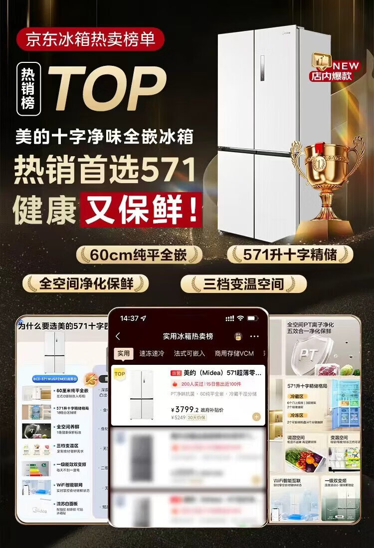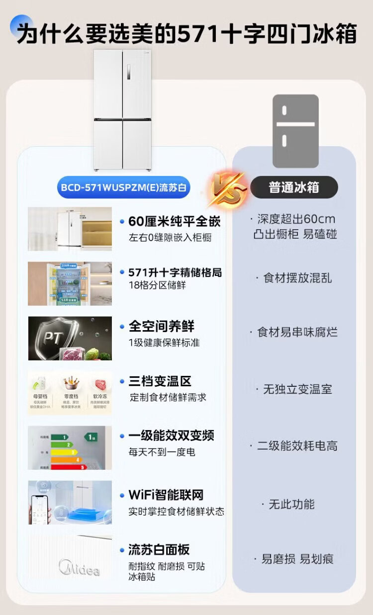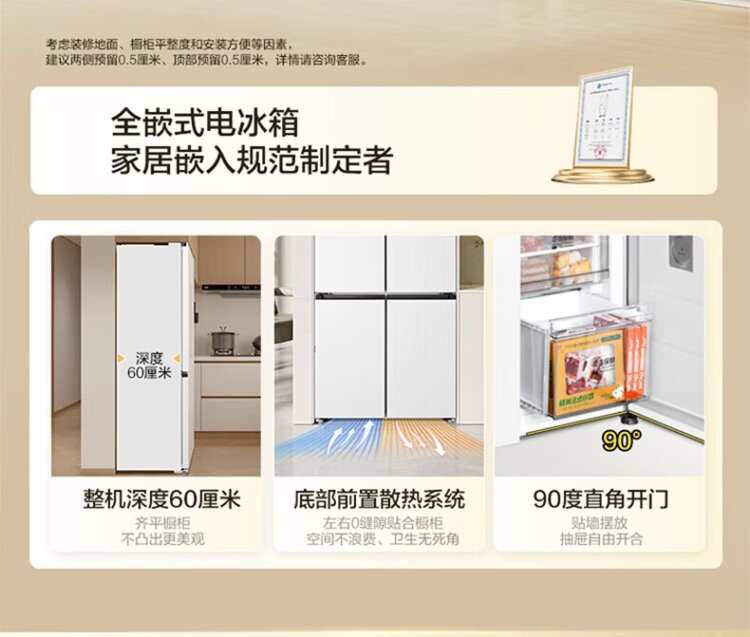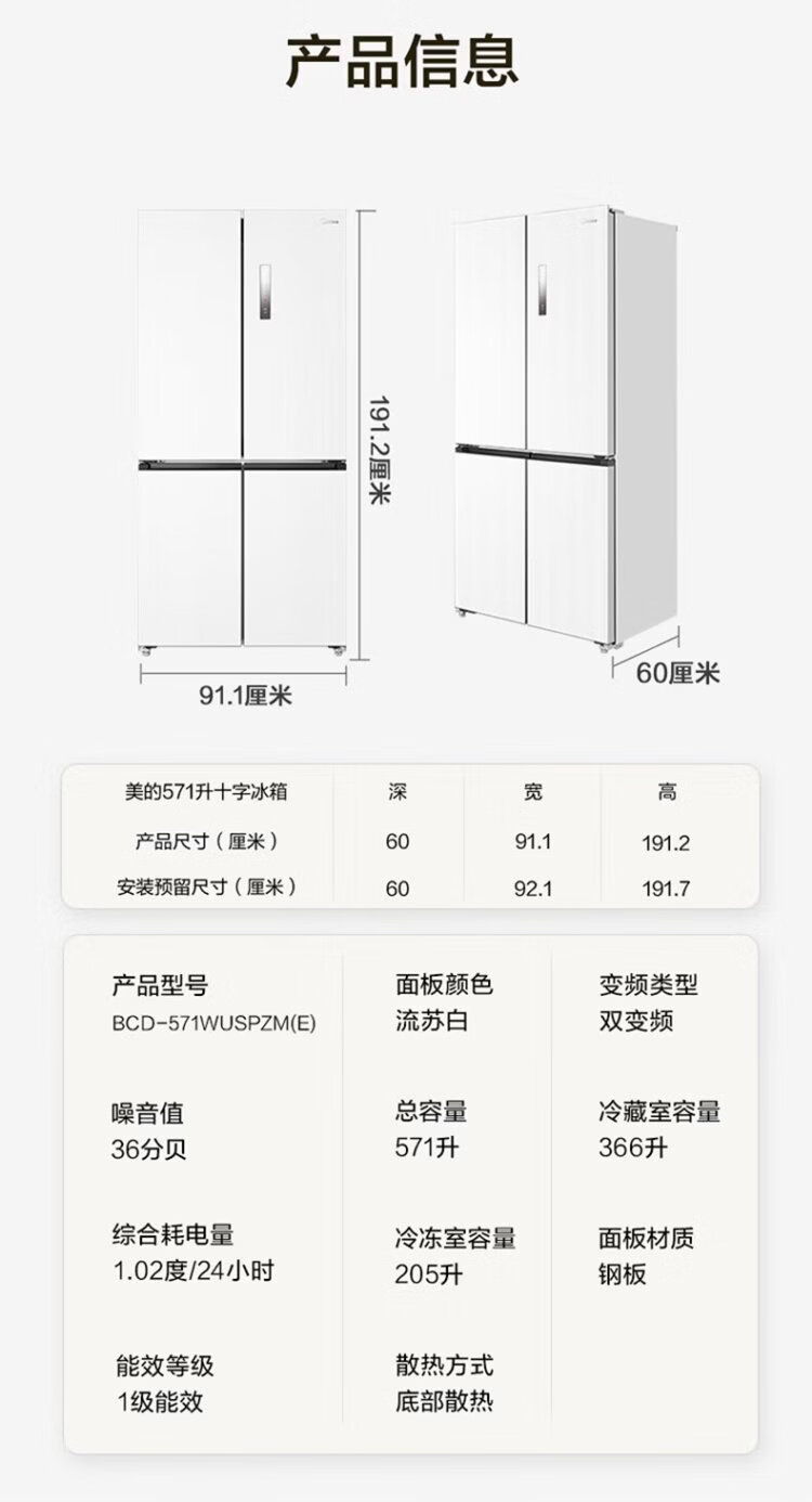 Midea 571 flat-screen fully embedded cross-fold four-door first-class energy-efficiency air-cooled frost-free bottom cooling large-capacity household refrigerator BCD-571WUSPZM (E) renewal subsidy