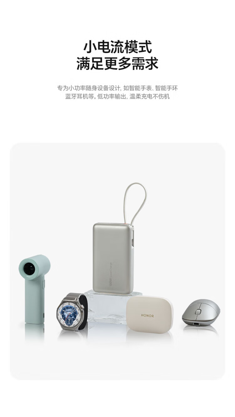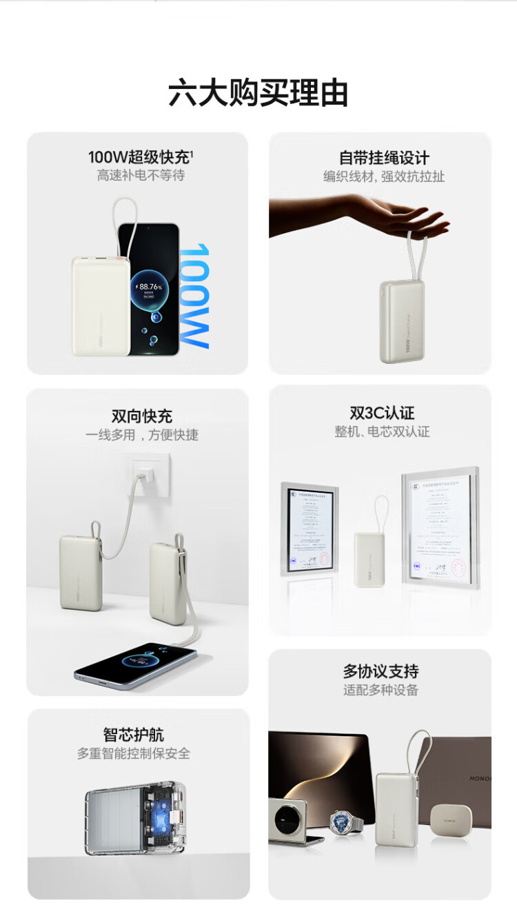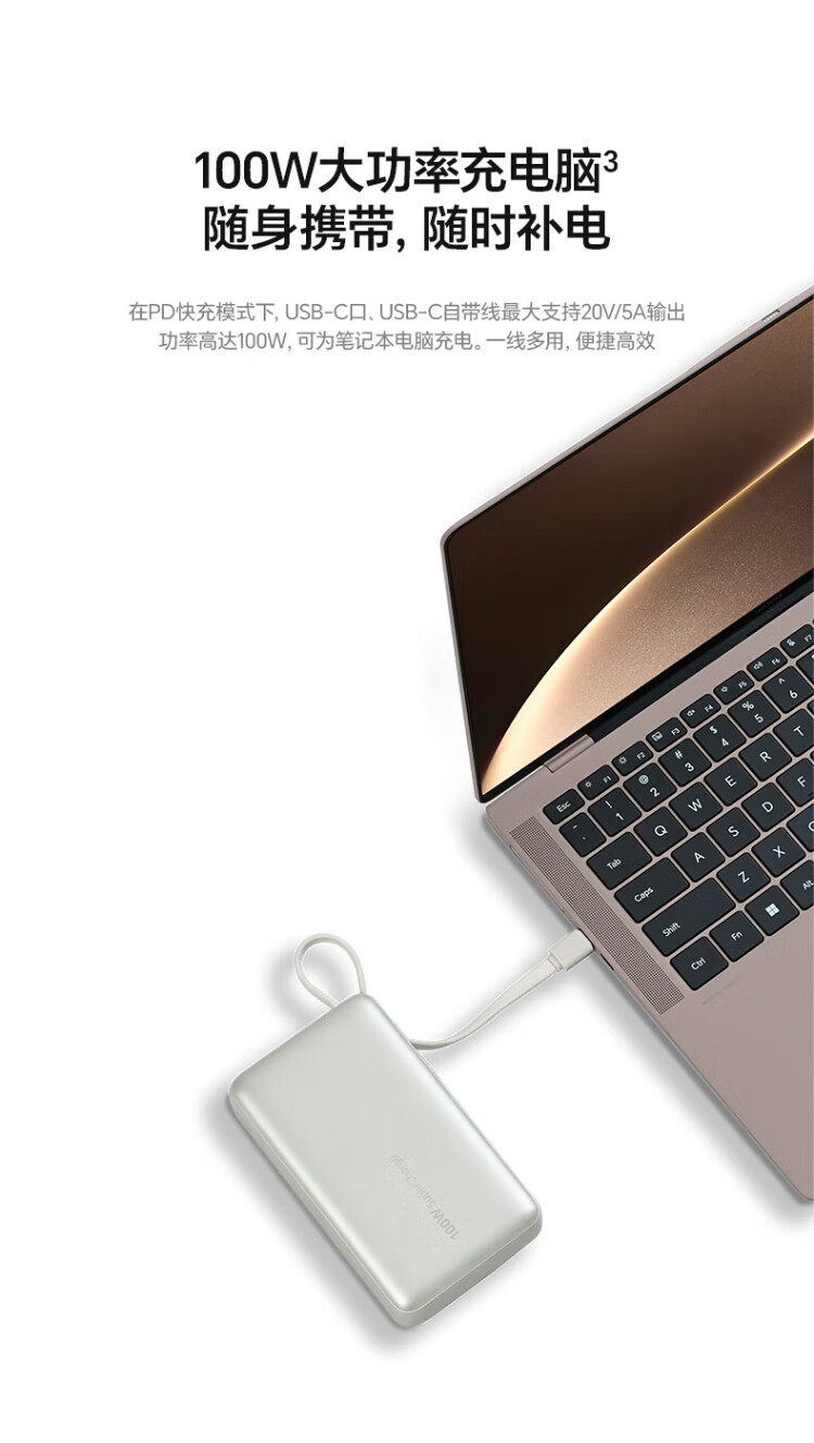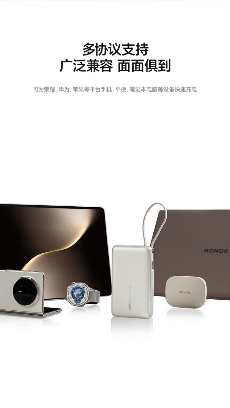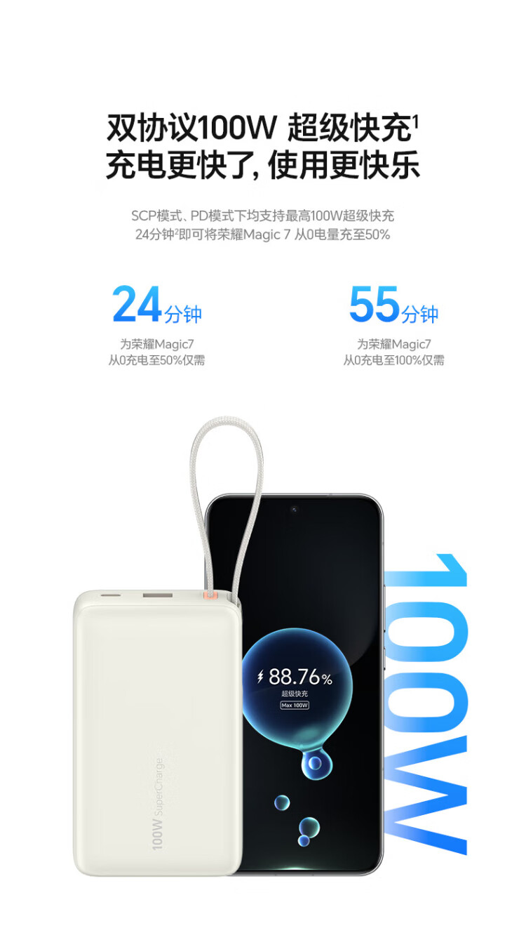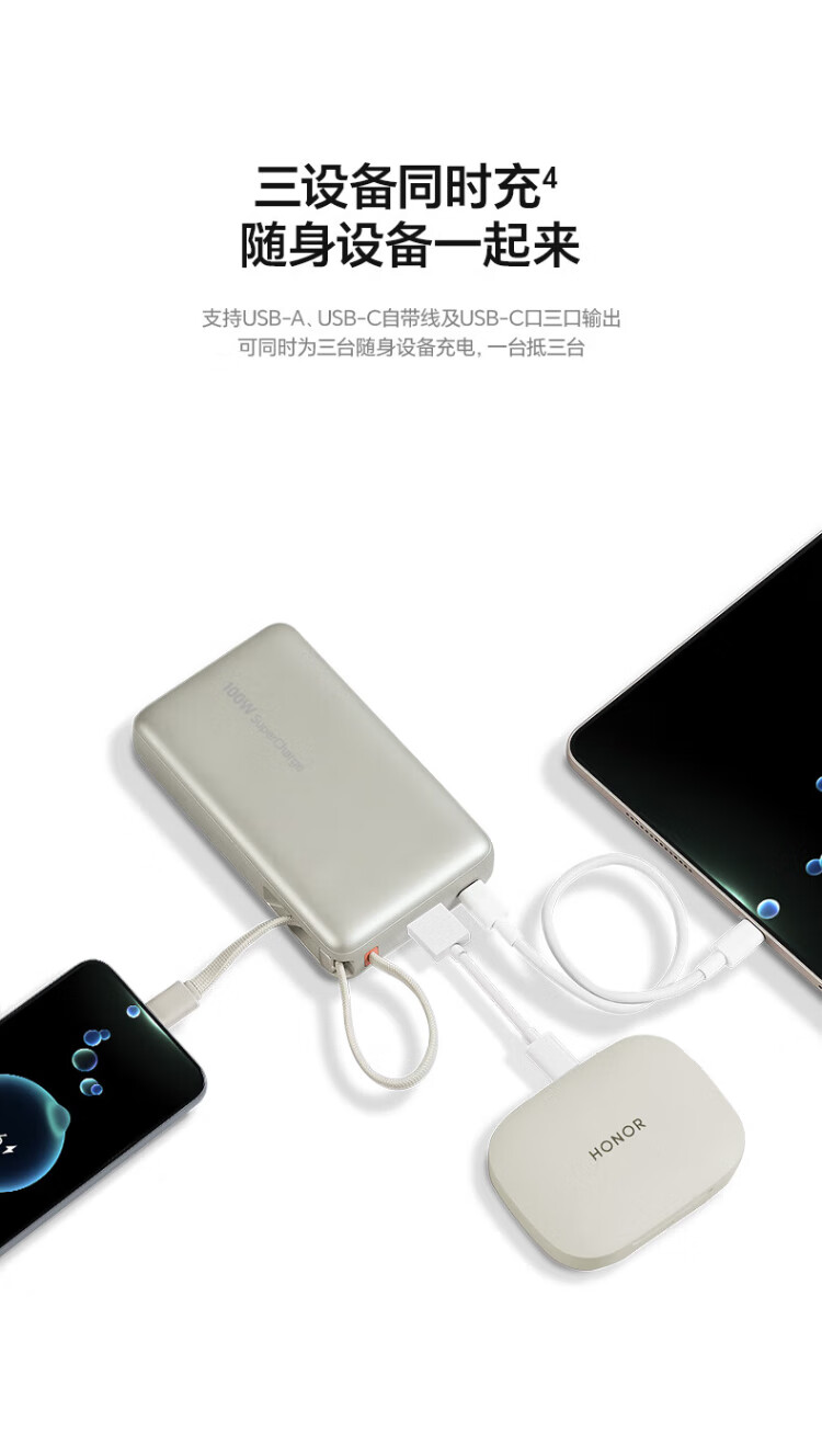 Honor personally selected power bank 100W with built-in cable version 20000mAh 3C certified, can be used on airplanes, can charge Honor Huawei, Apple phones and tablets, two-way fast charging, titanium gold