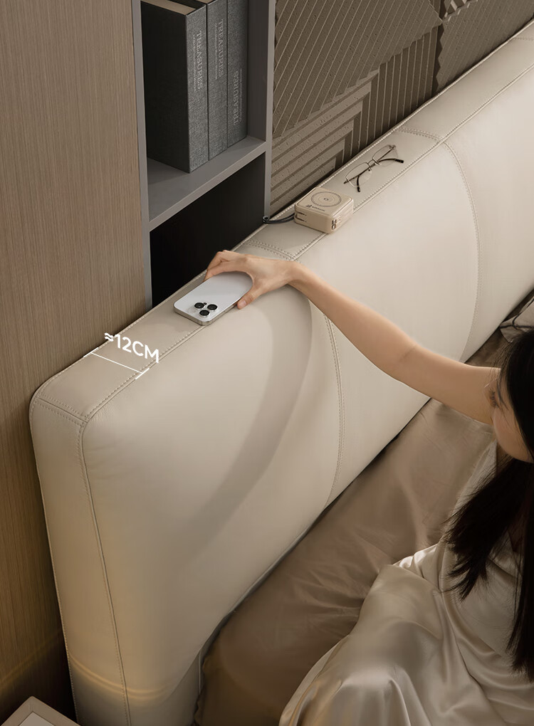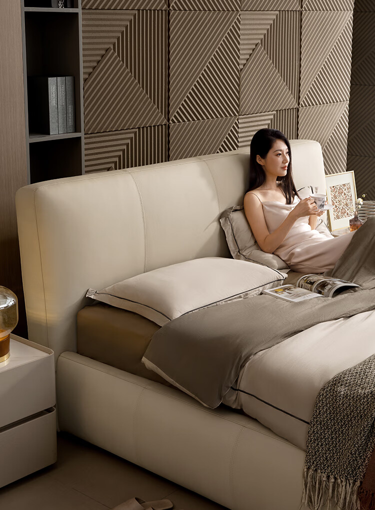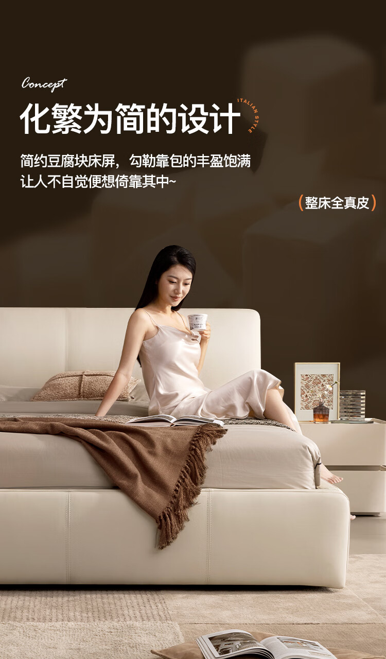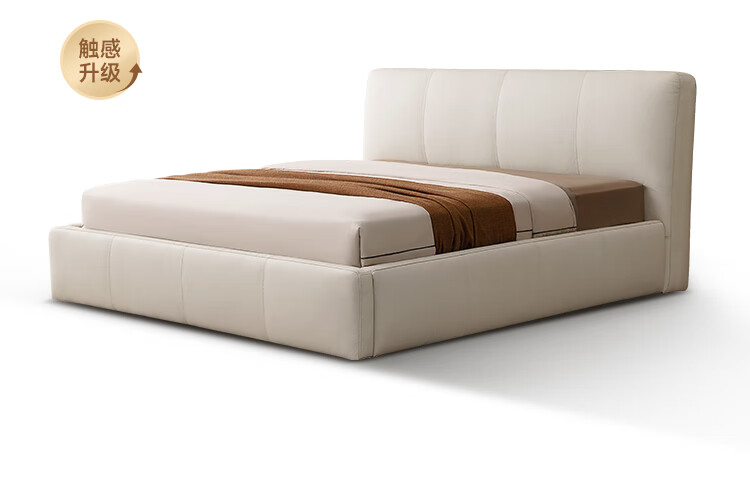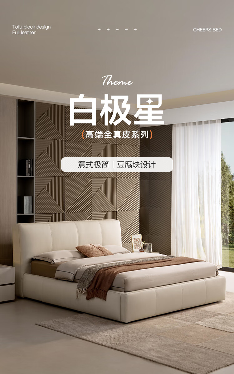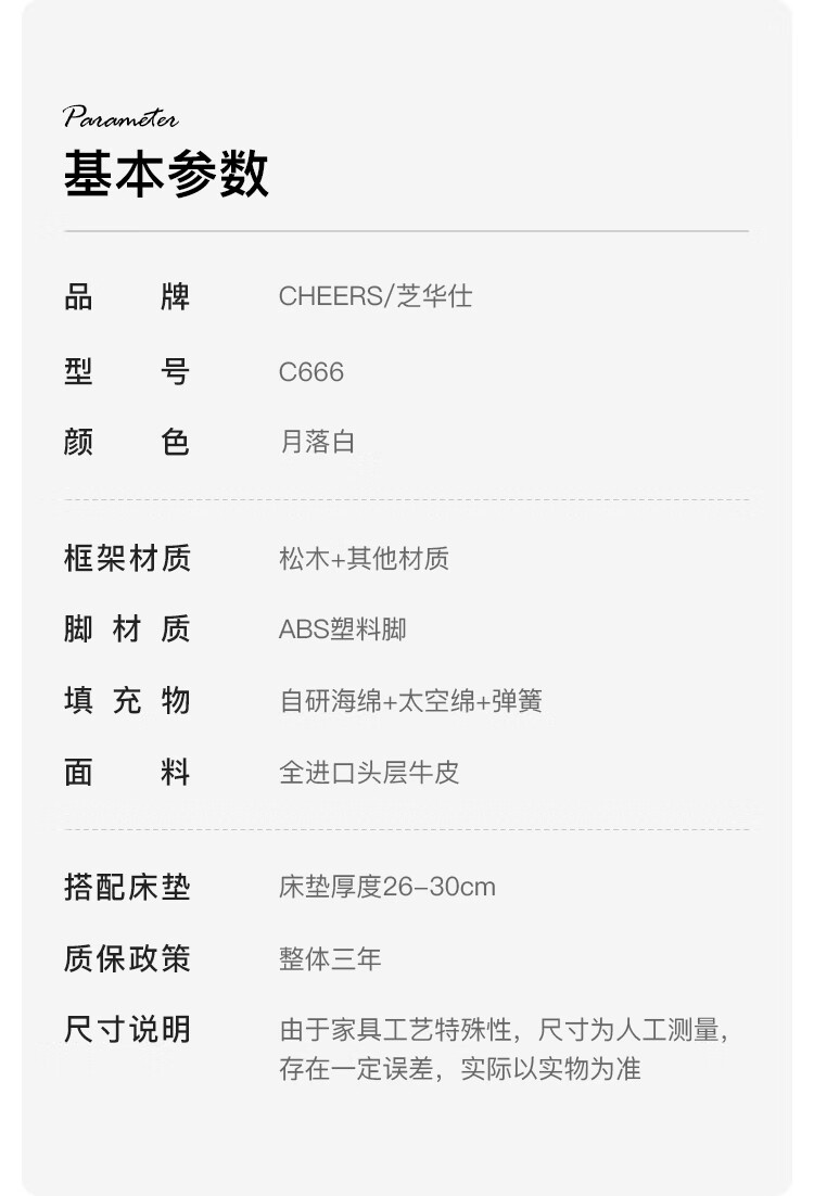 CHEERS Leather Art Bed Cream Style Full Genuine Leather Simple Tofu Block Soft Package Double Bed Package White Pole Star C666 White 1.8m