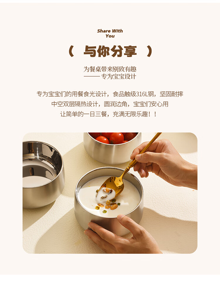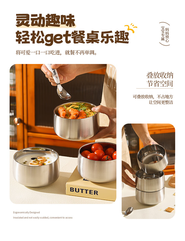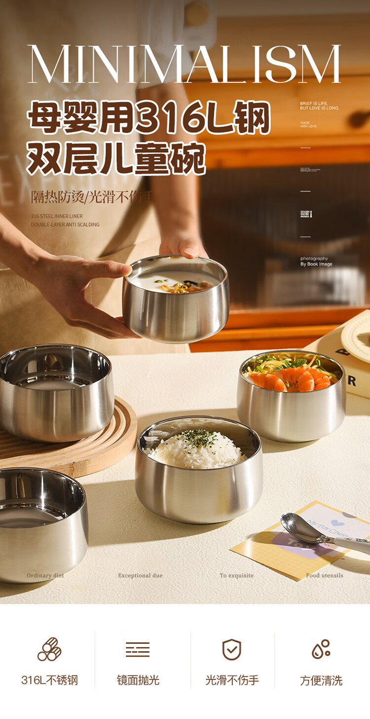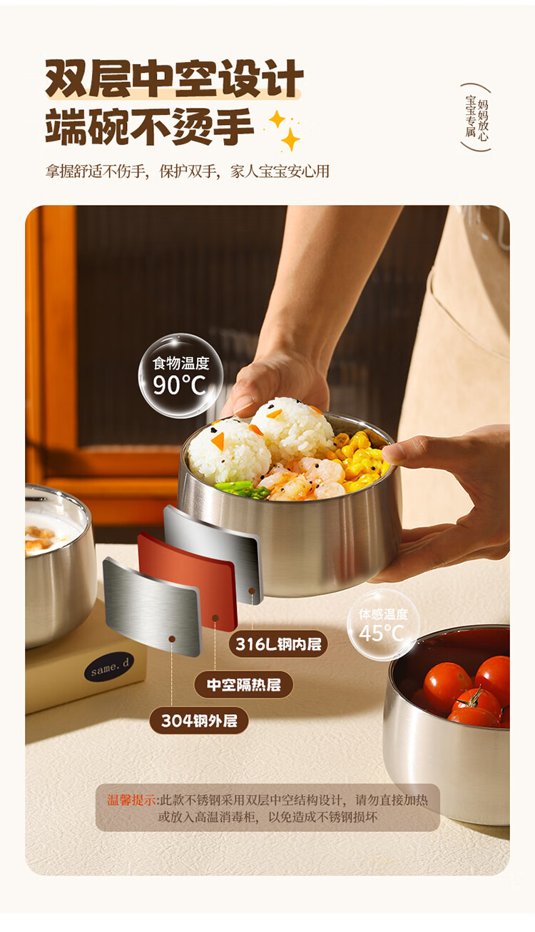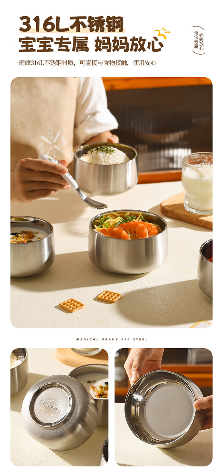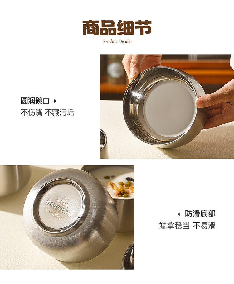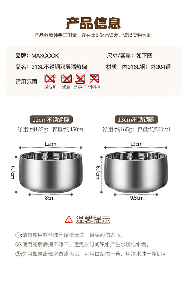 MAXCOOK stainless steel bowl 316L food grade double-layer insulated rice bowl household high-end small bowl 12cm MCWA2218
