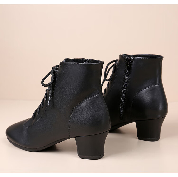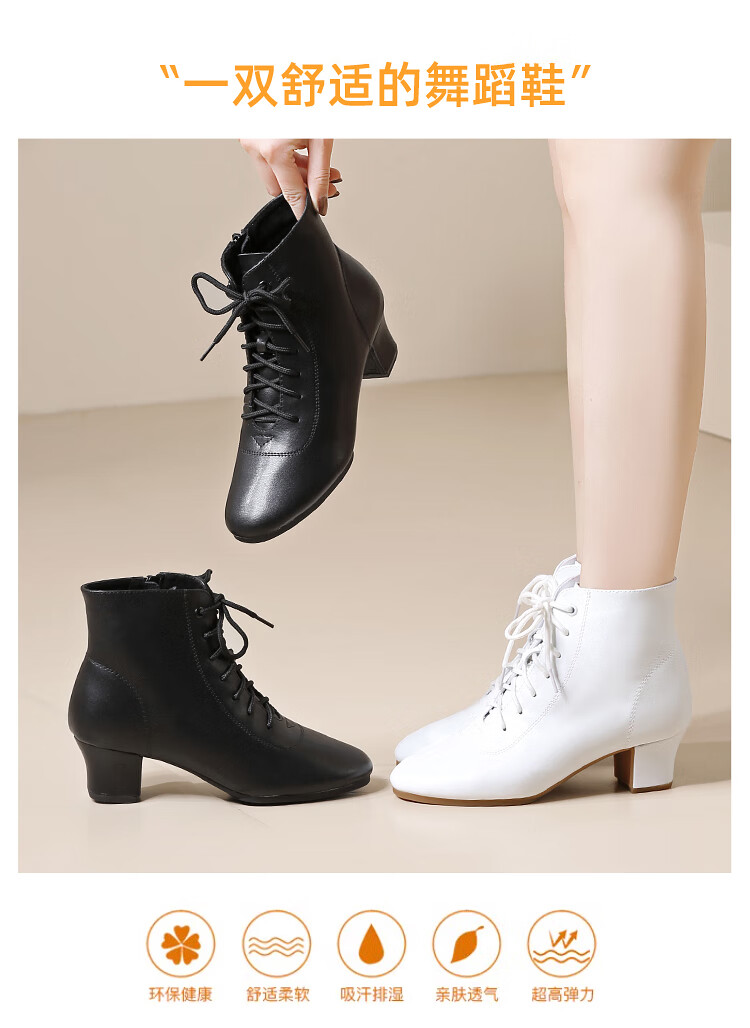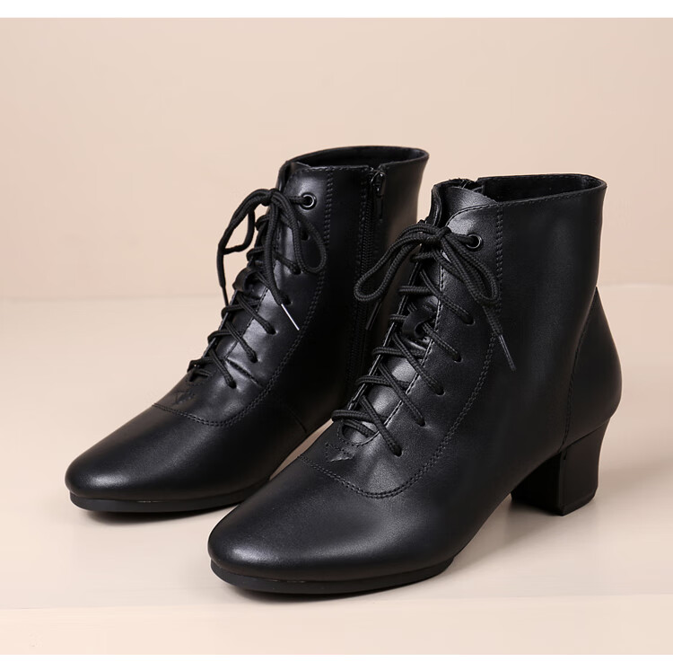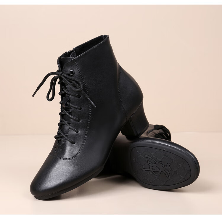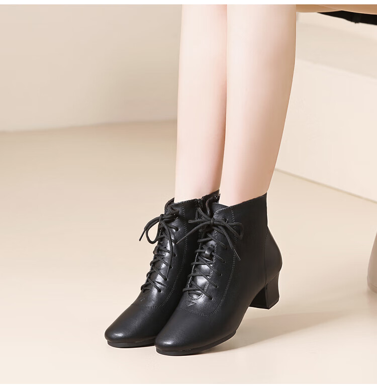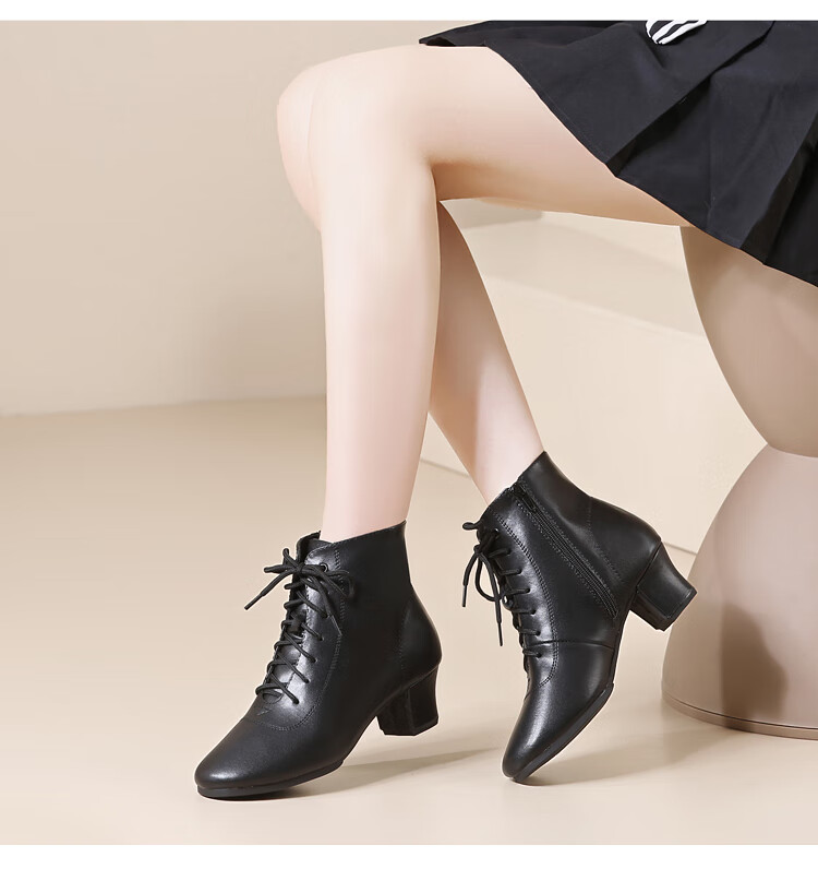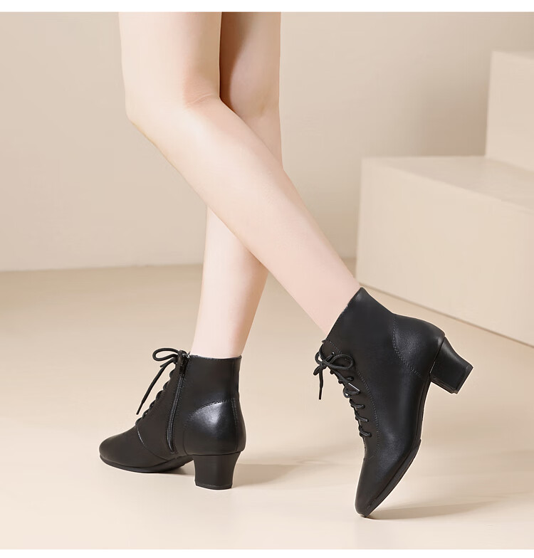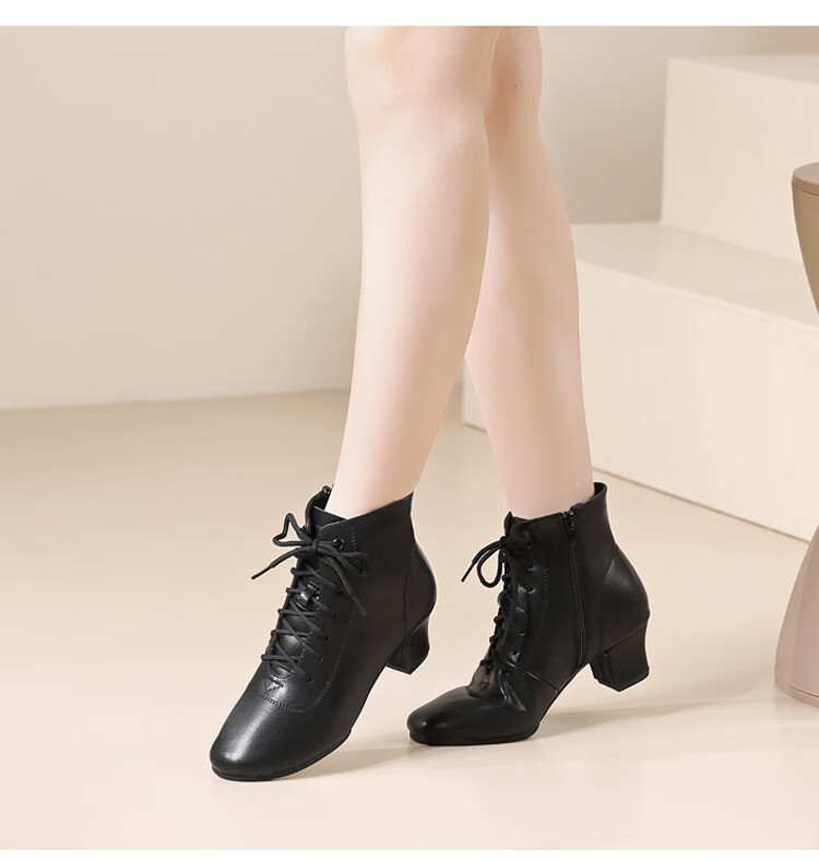 Tesili's autumn and winter square dance shoes, modern dance shoes, mid-heeled Latin dance shoes, cowhide mother's shoes, short boots, black plus velvet