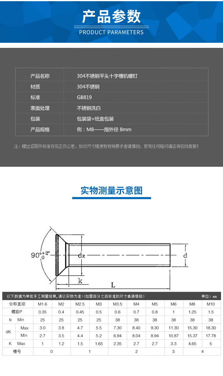 TONG Dongming 304 stainless steel cross countersunk head and screws GB819 M1.6-M2.5 M2.5 *8 (100 pieces/bag)