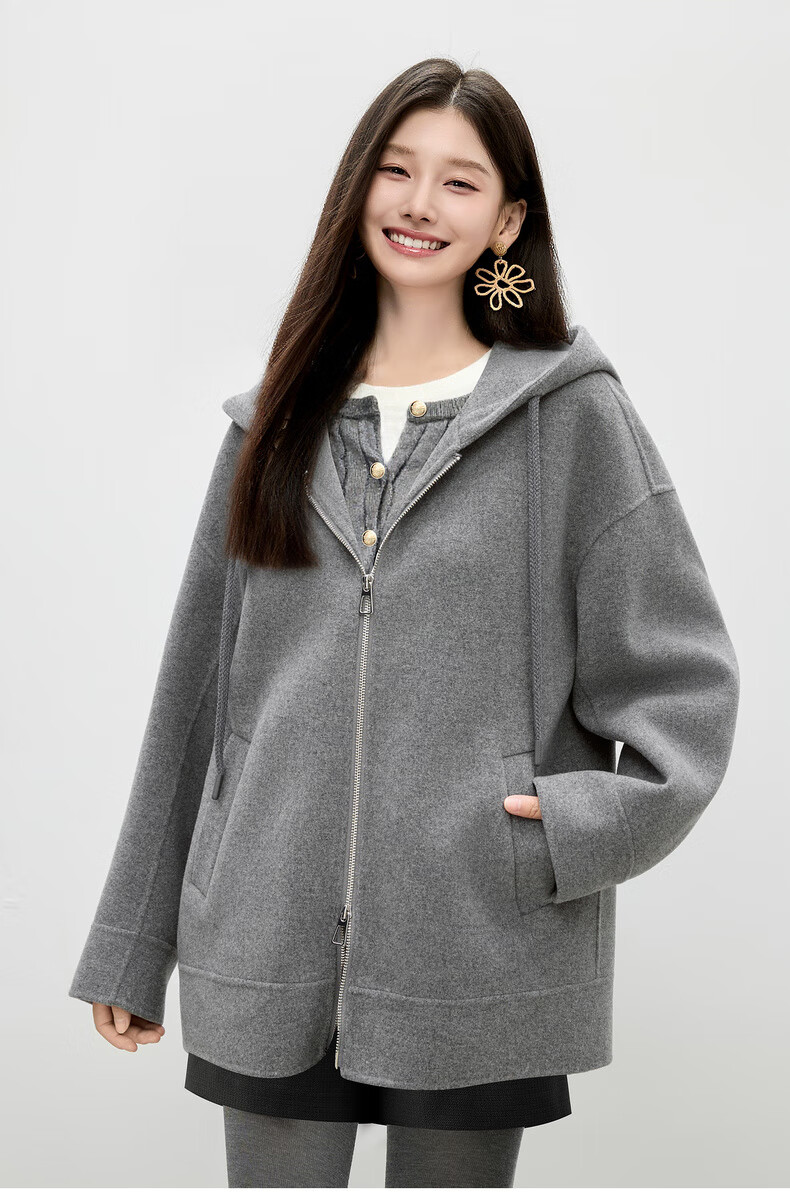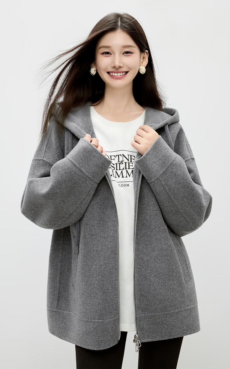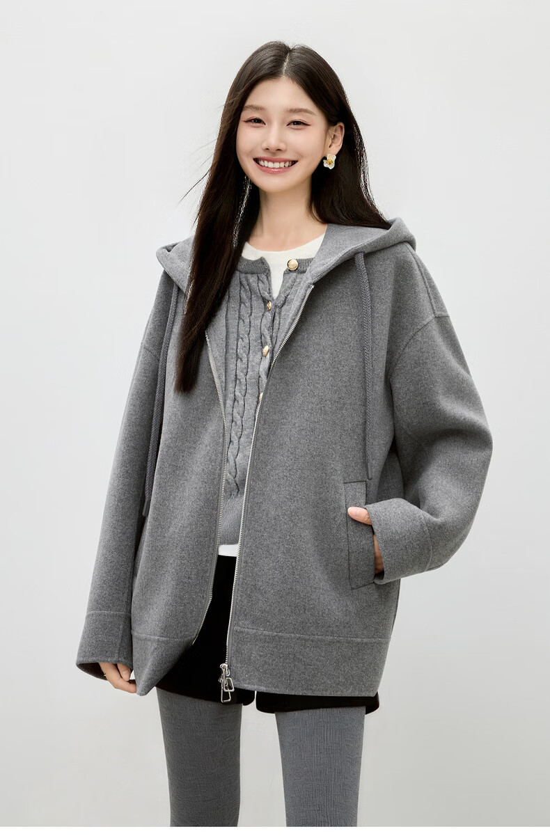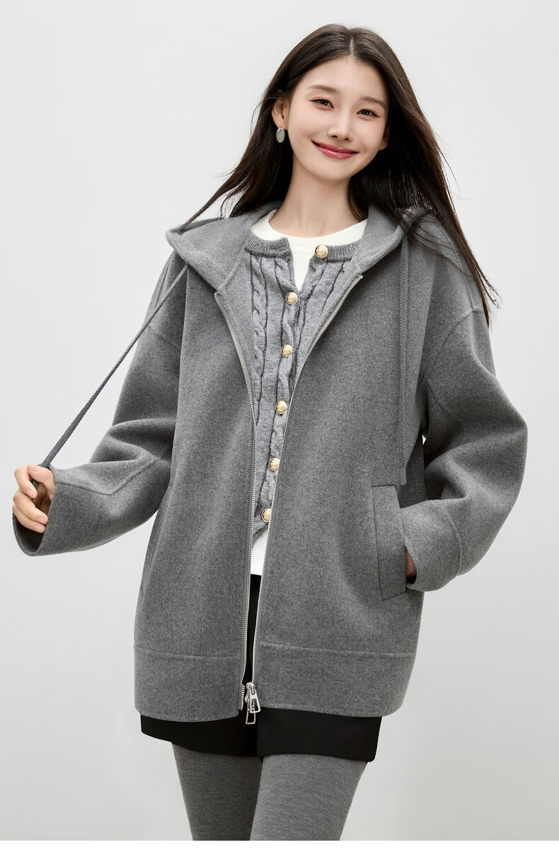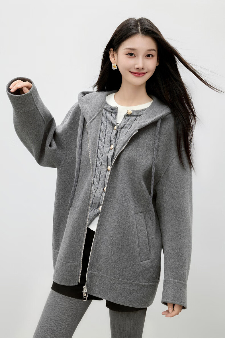 Qiushui Yiren Fashion 100% Sheep Wool Top 2025 Winter New Fall Shoulder Loose Hooded Woolen Jacket
