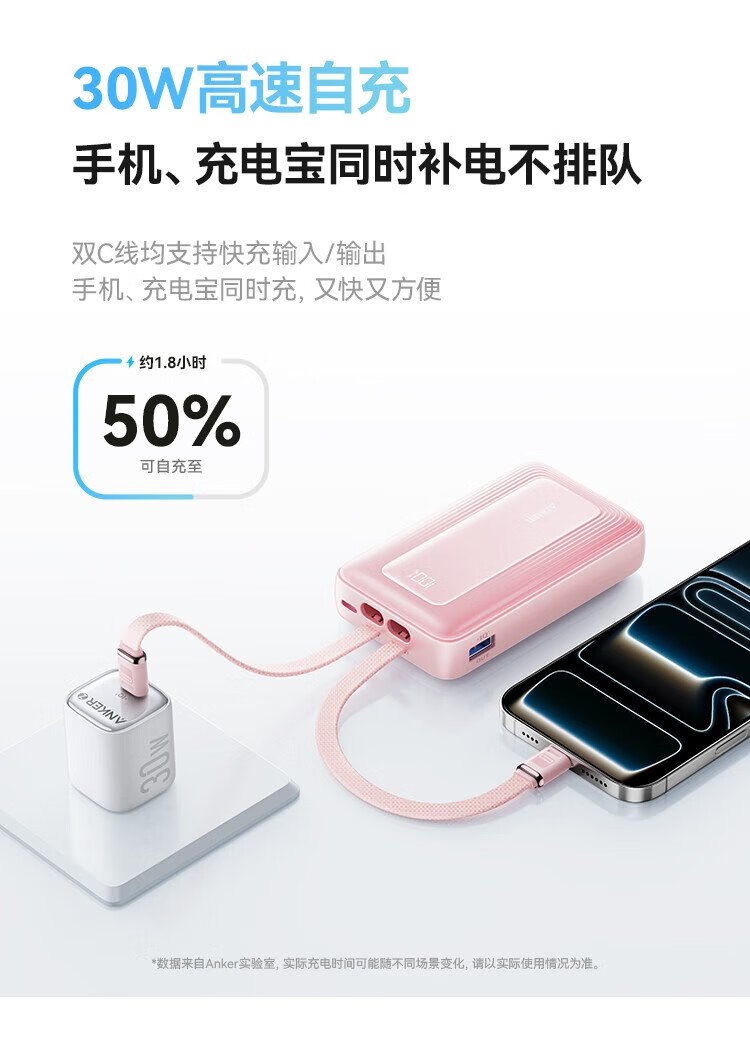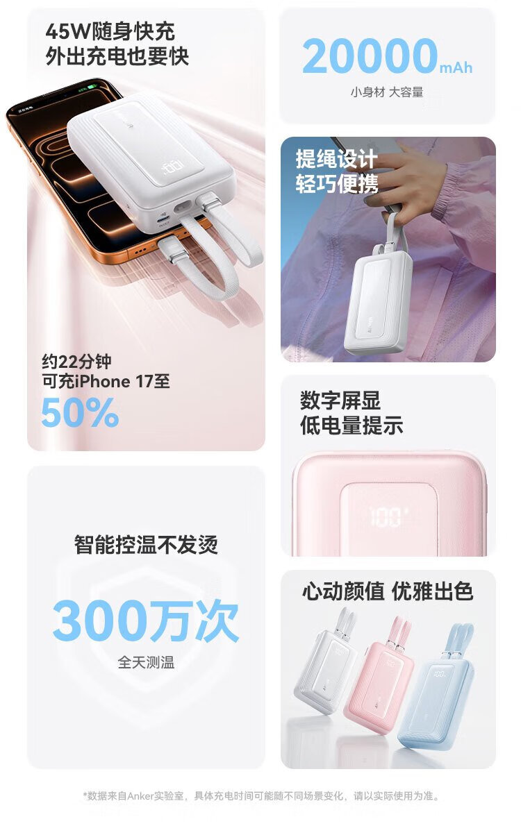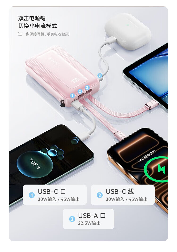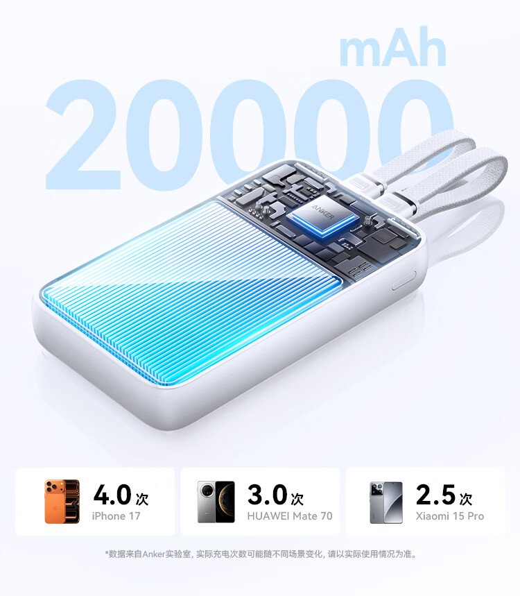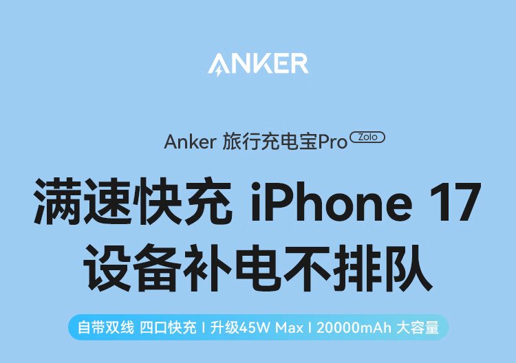 ANKER 3C certified travel power bank comes with dual C cable 45W 20000 mAh large capacity ultra-fast charging mobile power bank Android Apple Blue