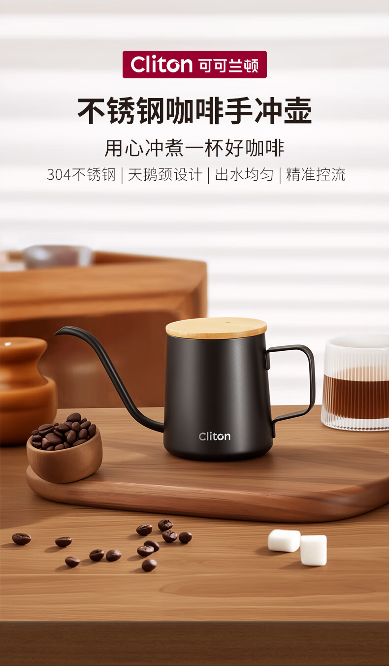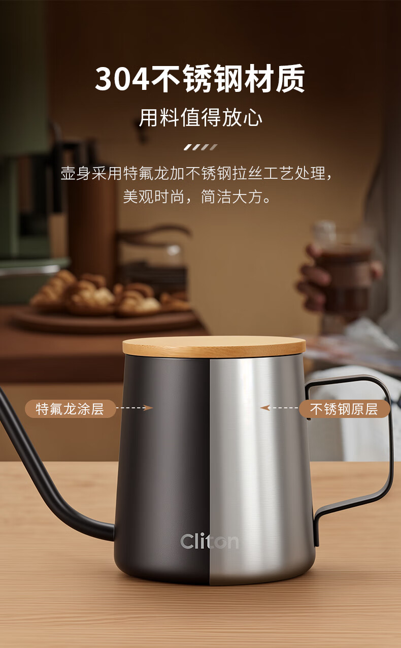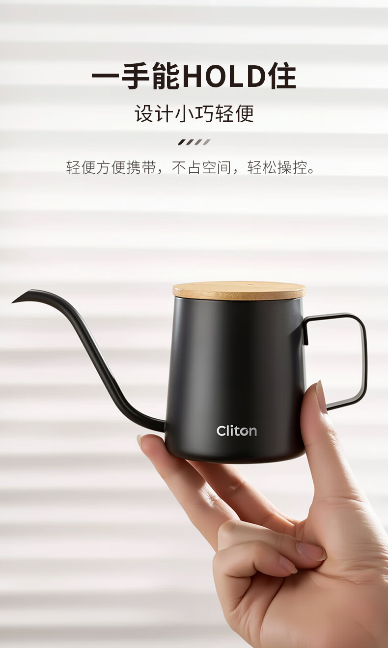 CLITON304 stainless steel hand brewed coffee pot travel office home hanging wooden handle ear coffee long mouth pot thin mouth pot with lid