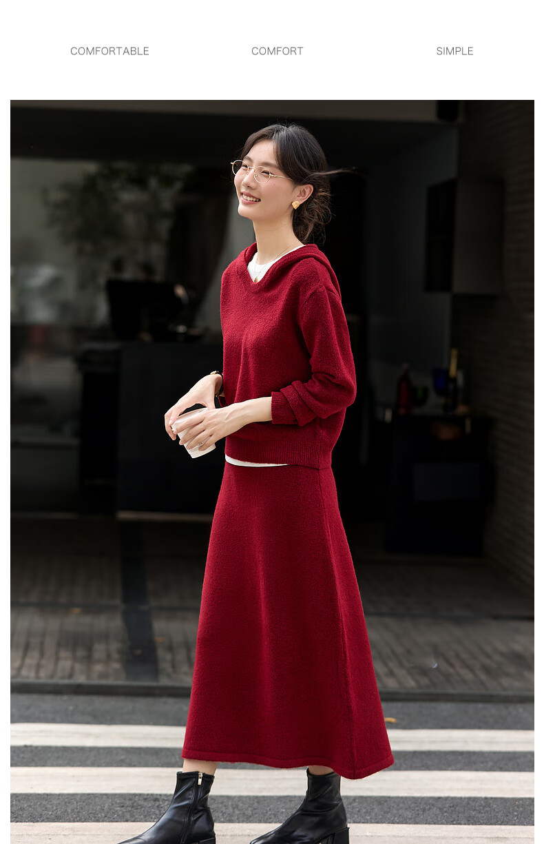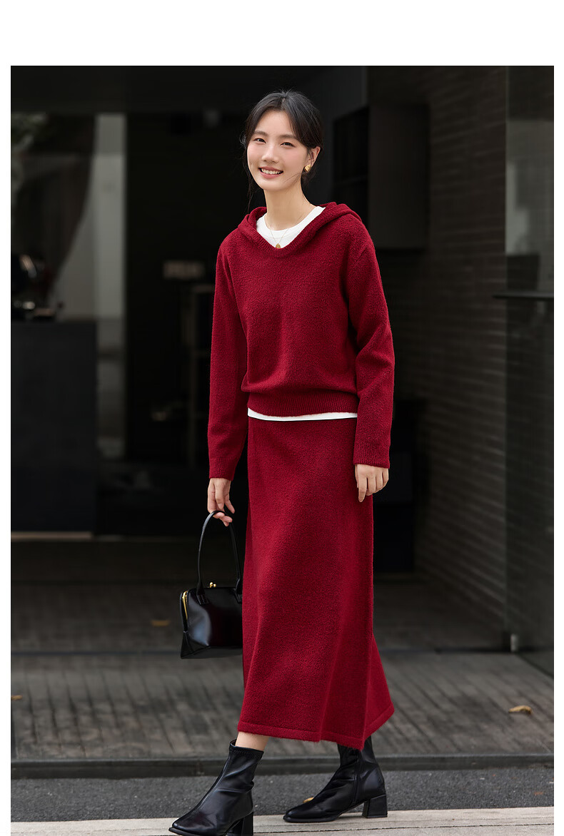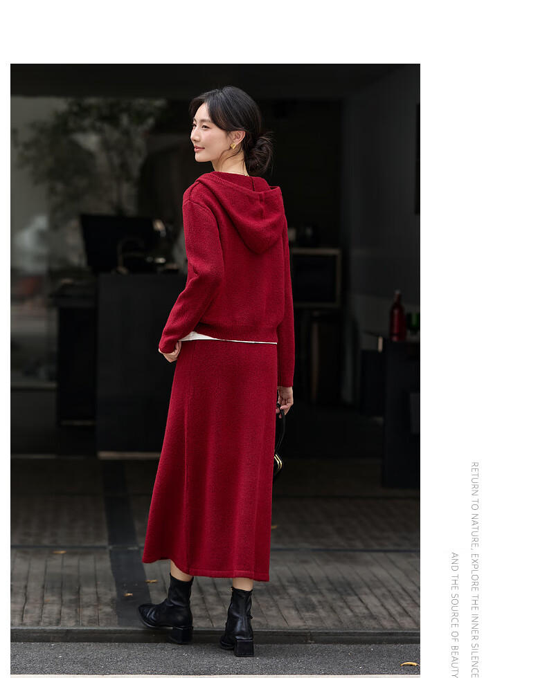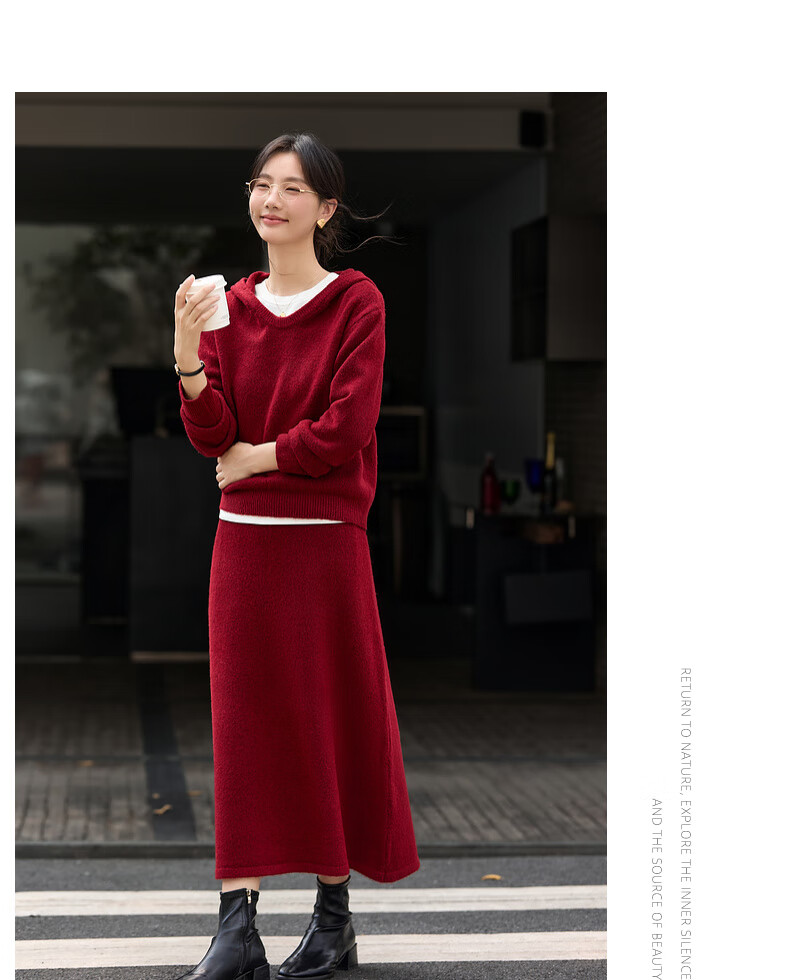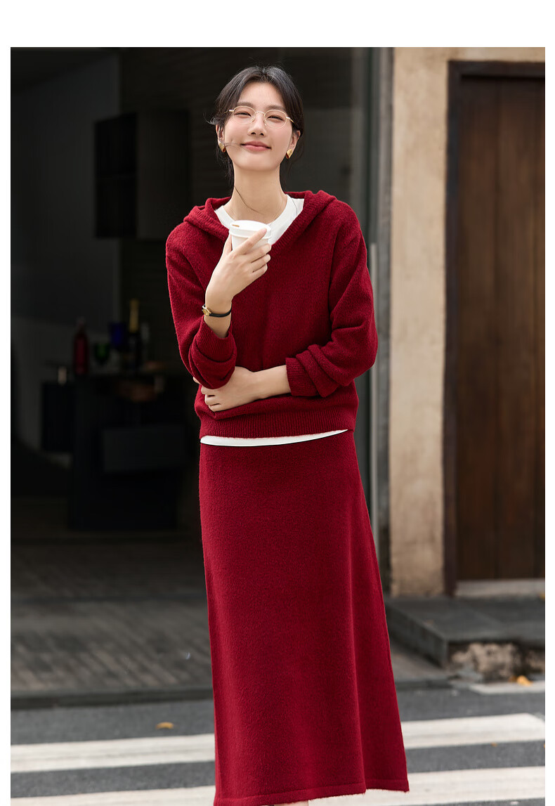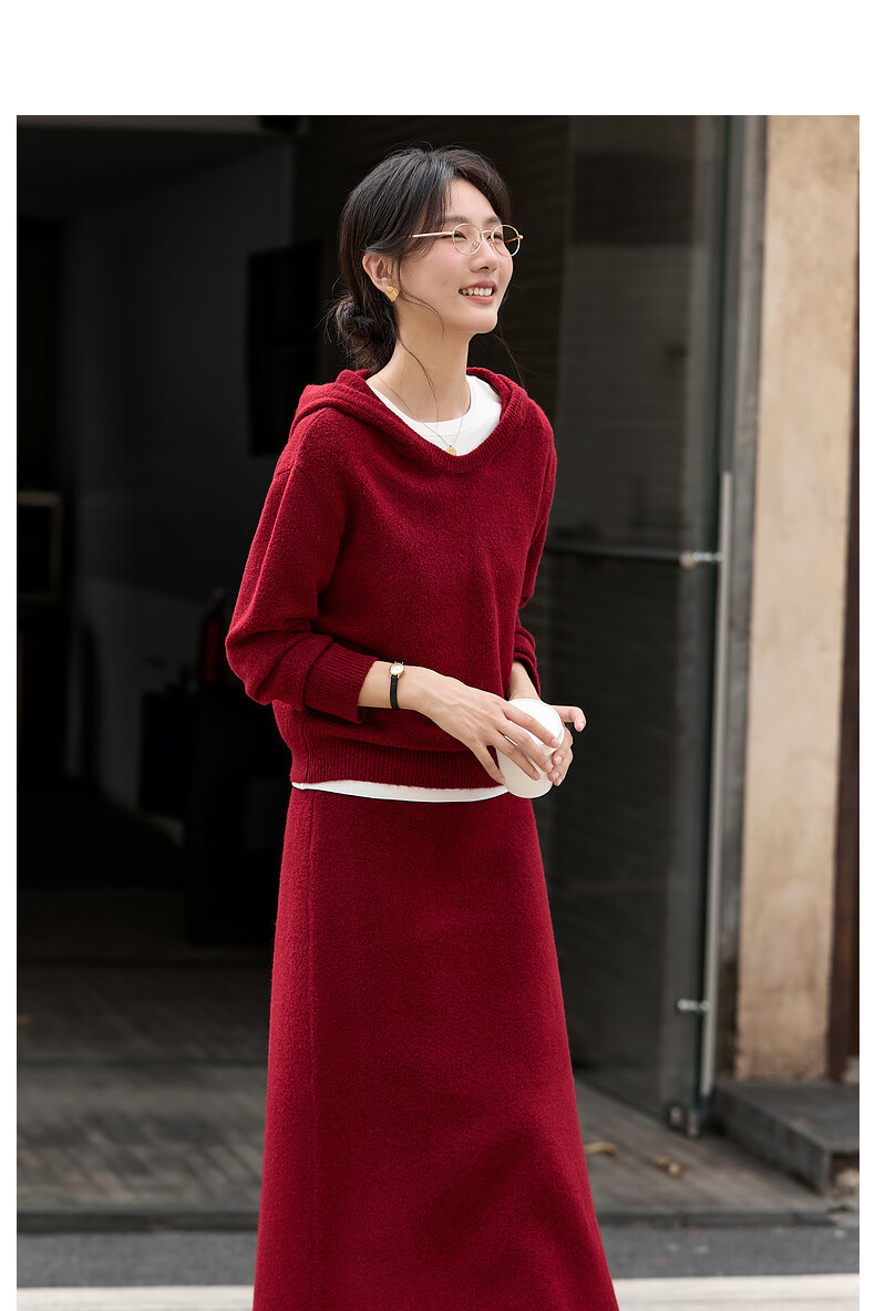 Fanximan Knitted Suit Women's Autumn New Hooded Knitwear A-Line Half-length Skirt Two-piece Set Millennium Red XL