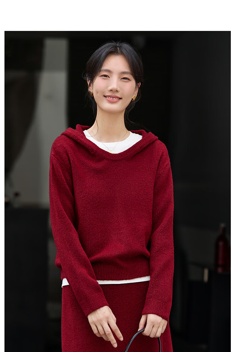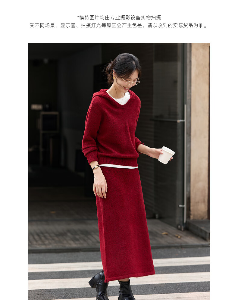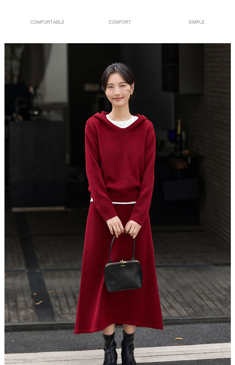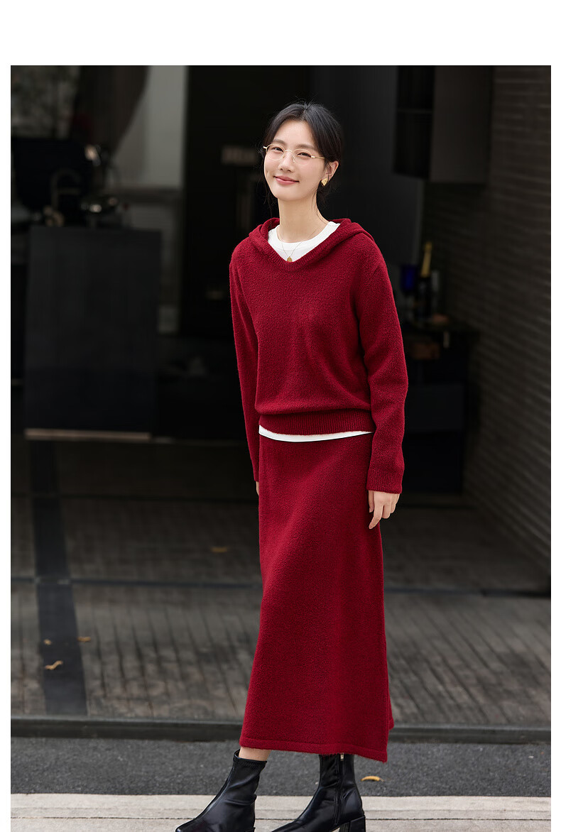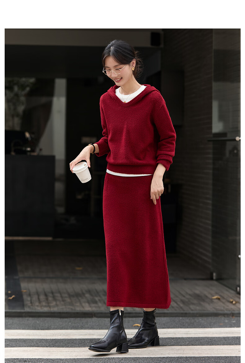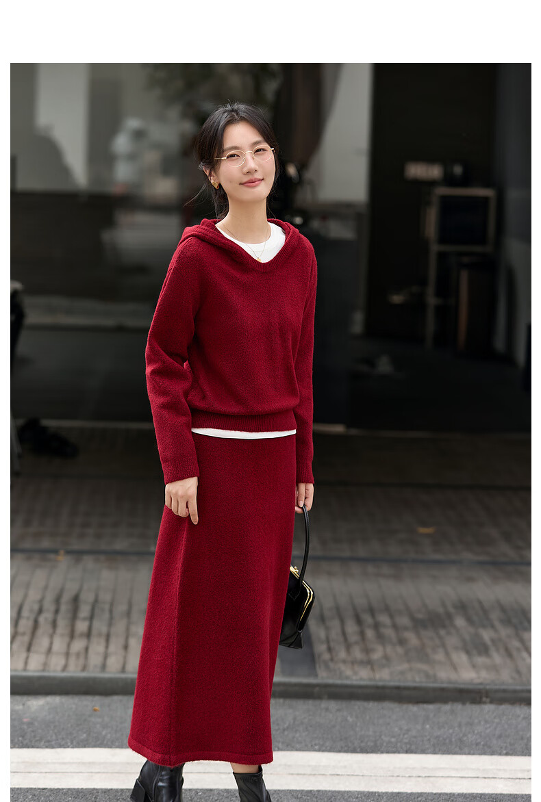 Fanximan Knitted Suit Women's Autumn New Hooded Knitwear A-Line Half-length Skirt Two-piece Set Millennium Red XL