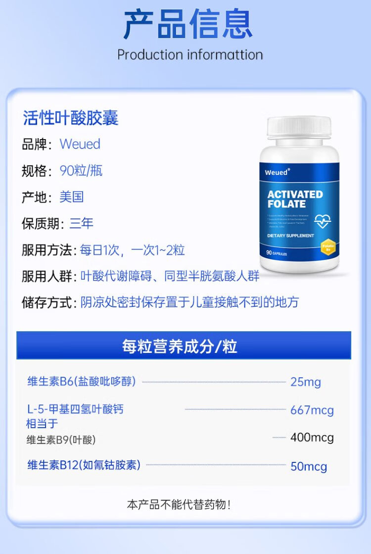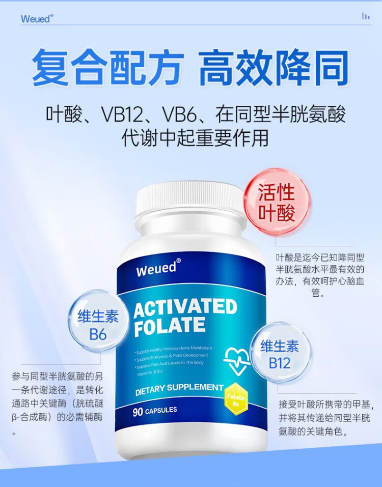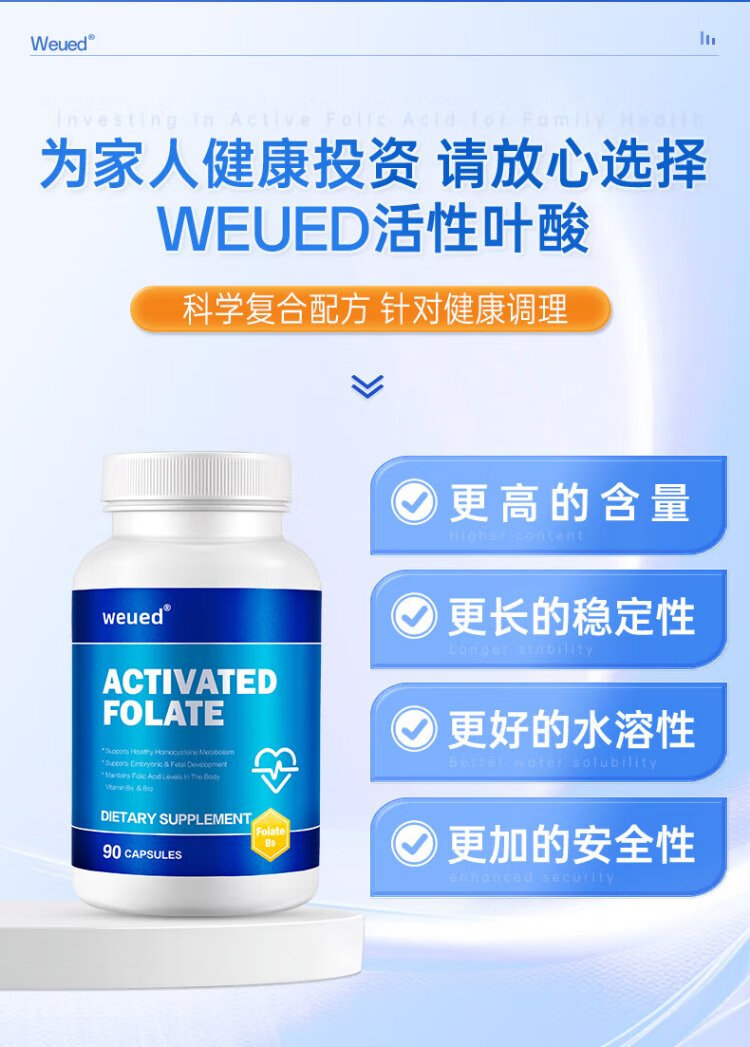 WEUED active folic acid tablets for men reduce homocysteine in middle-aged and elderly cardiovascular and cerebrovascular vitamin b9 imported from the United States