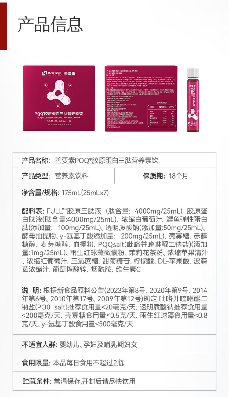 Good Elements Huadong Medicine PQQ Collagen Tripeptide Small Molecular Peptide Isinglass Fresh Collagen Oral Liquid