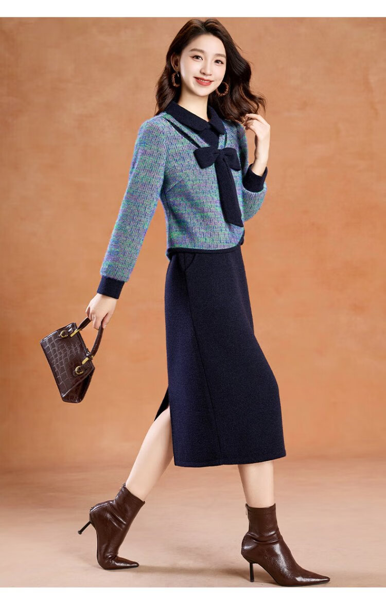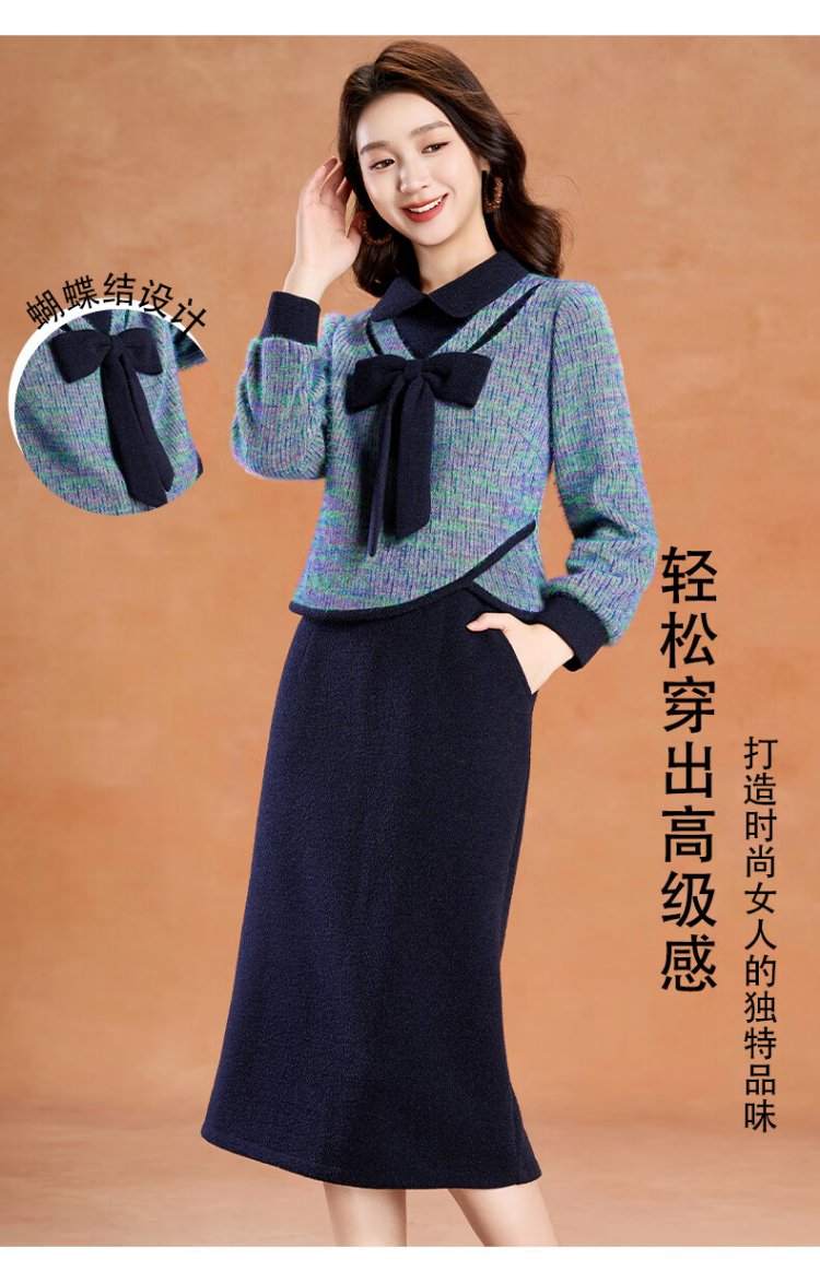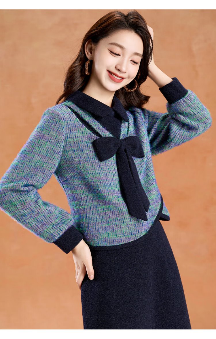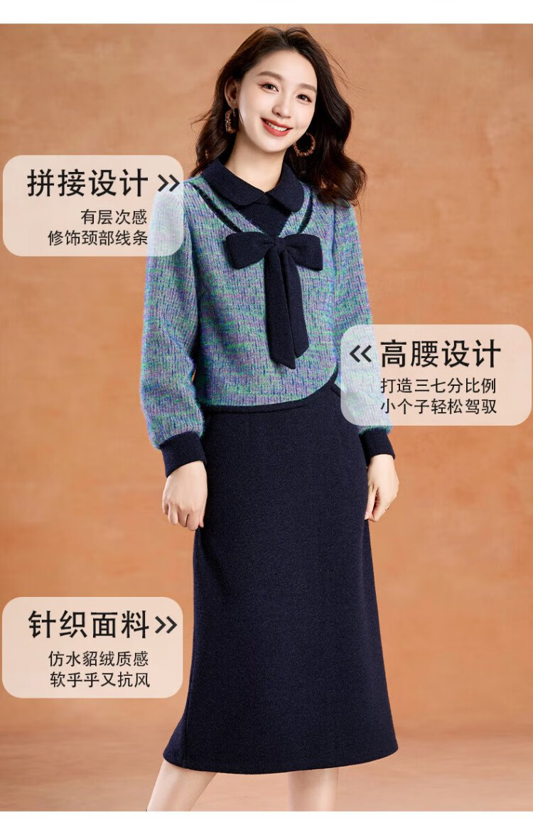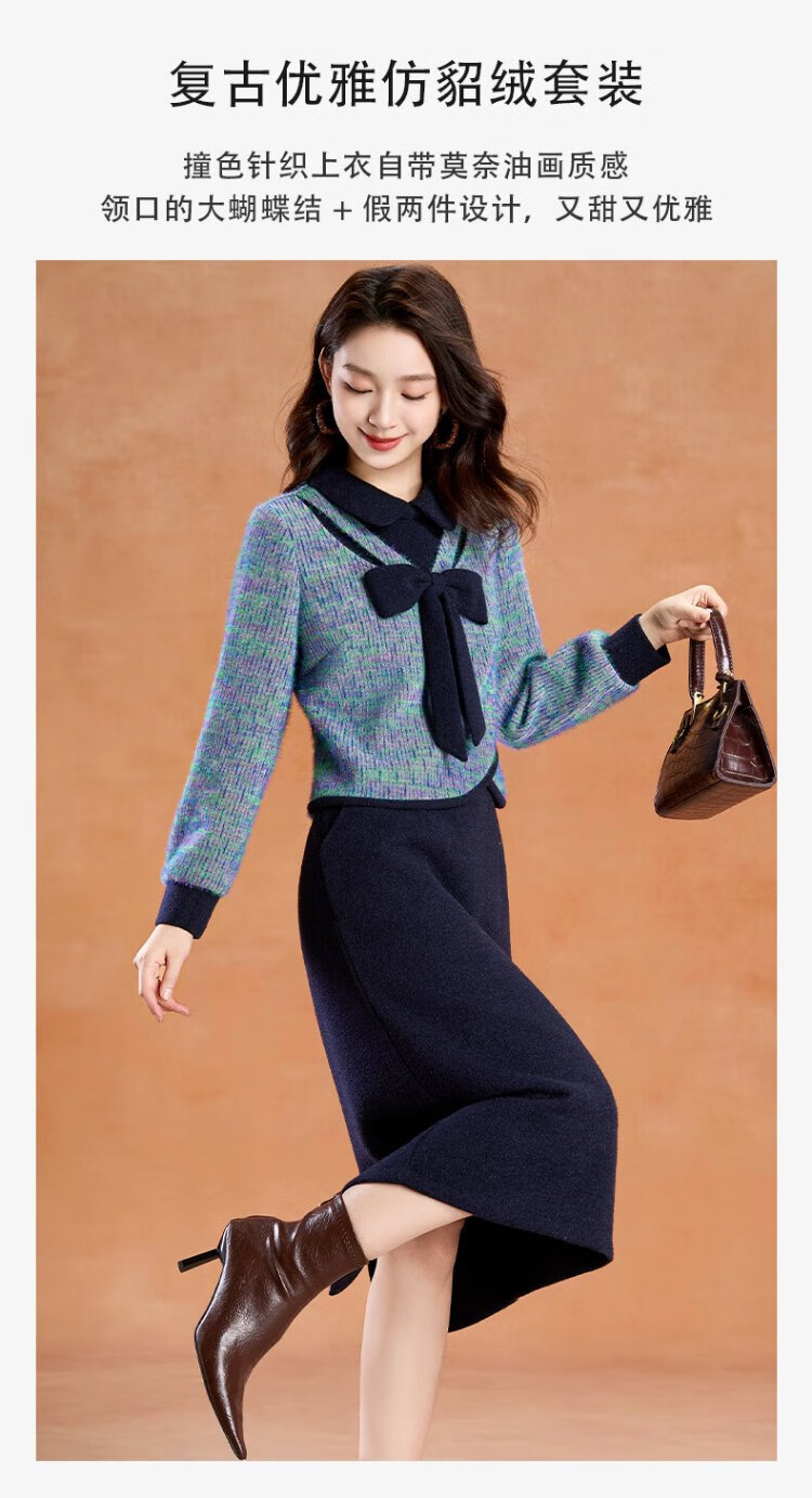 Kebel neckline bow design knitted skirt for women 2025 new winter imitation mink velvet contrasting color stitching two-piece set M