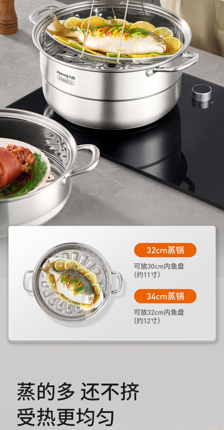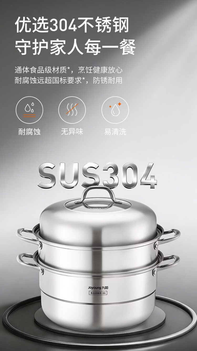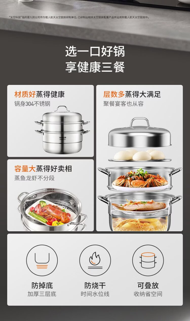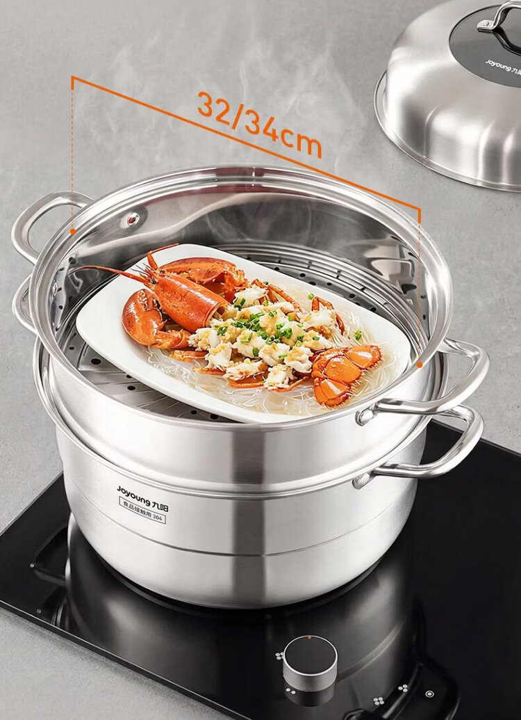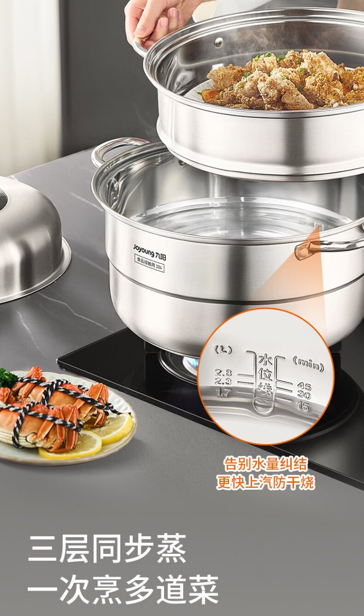 Joyoung steamer 304 stainless steel household thickened large-capacity steel handle stew soup pot gas induction cooker universal three-layer 32cm