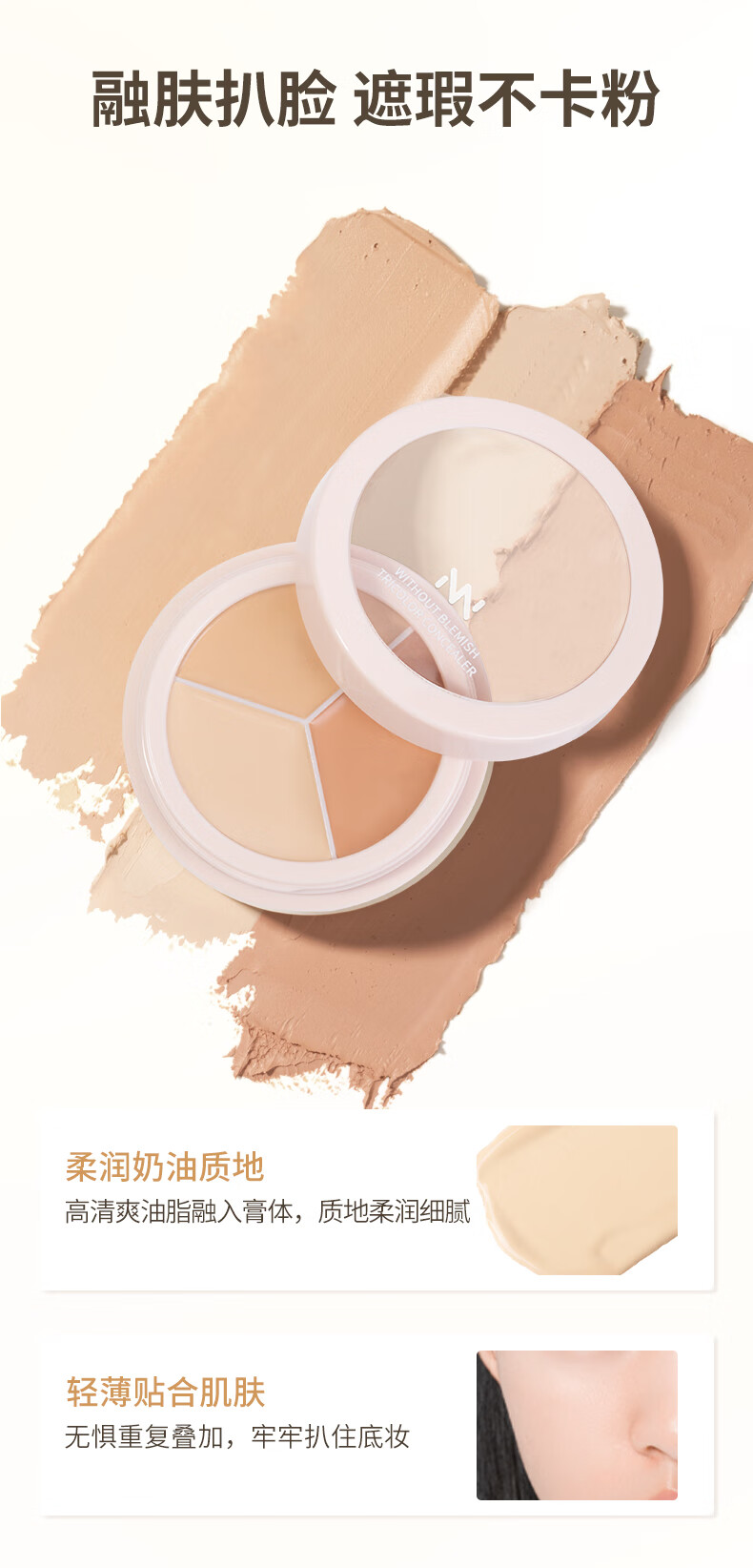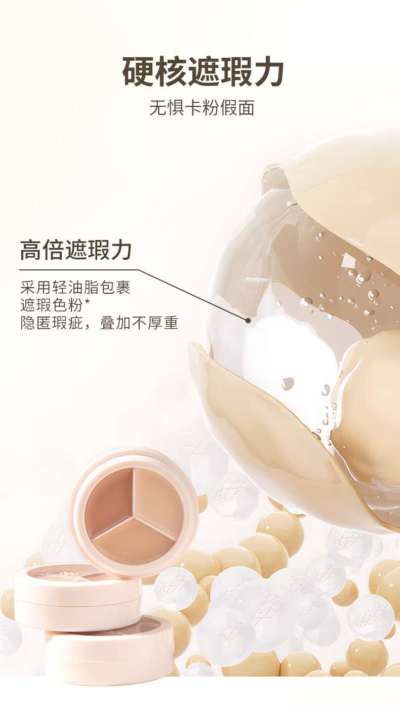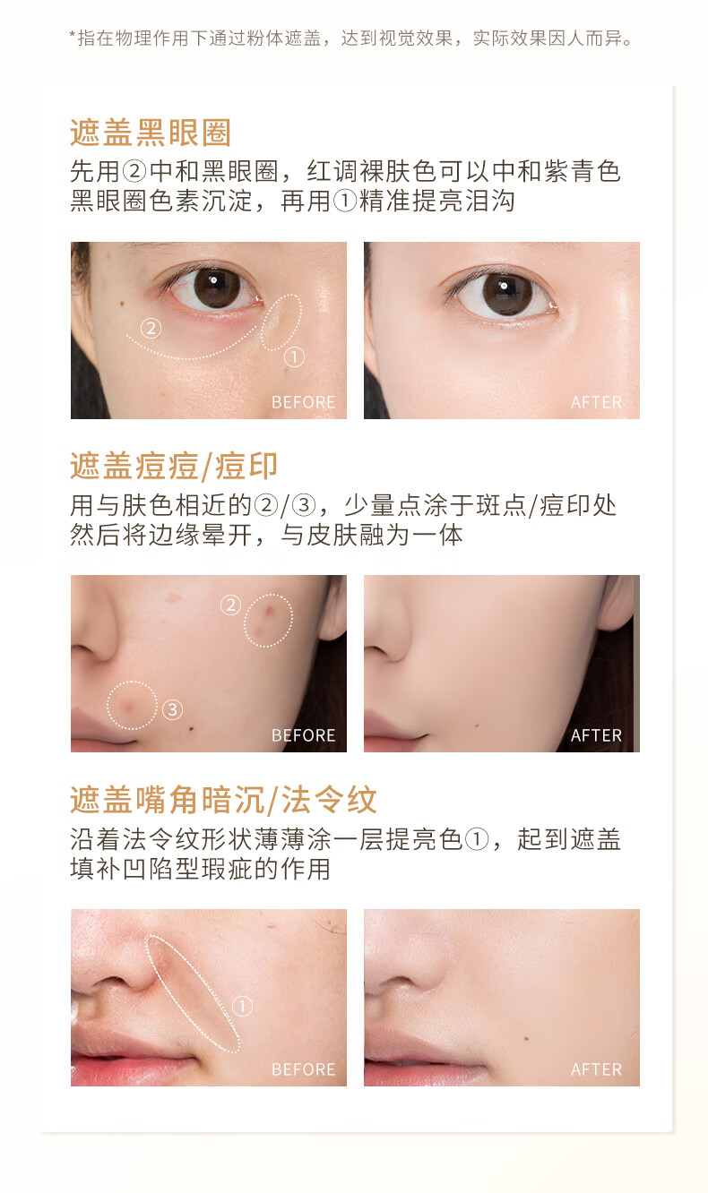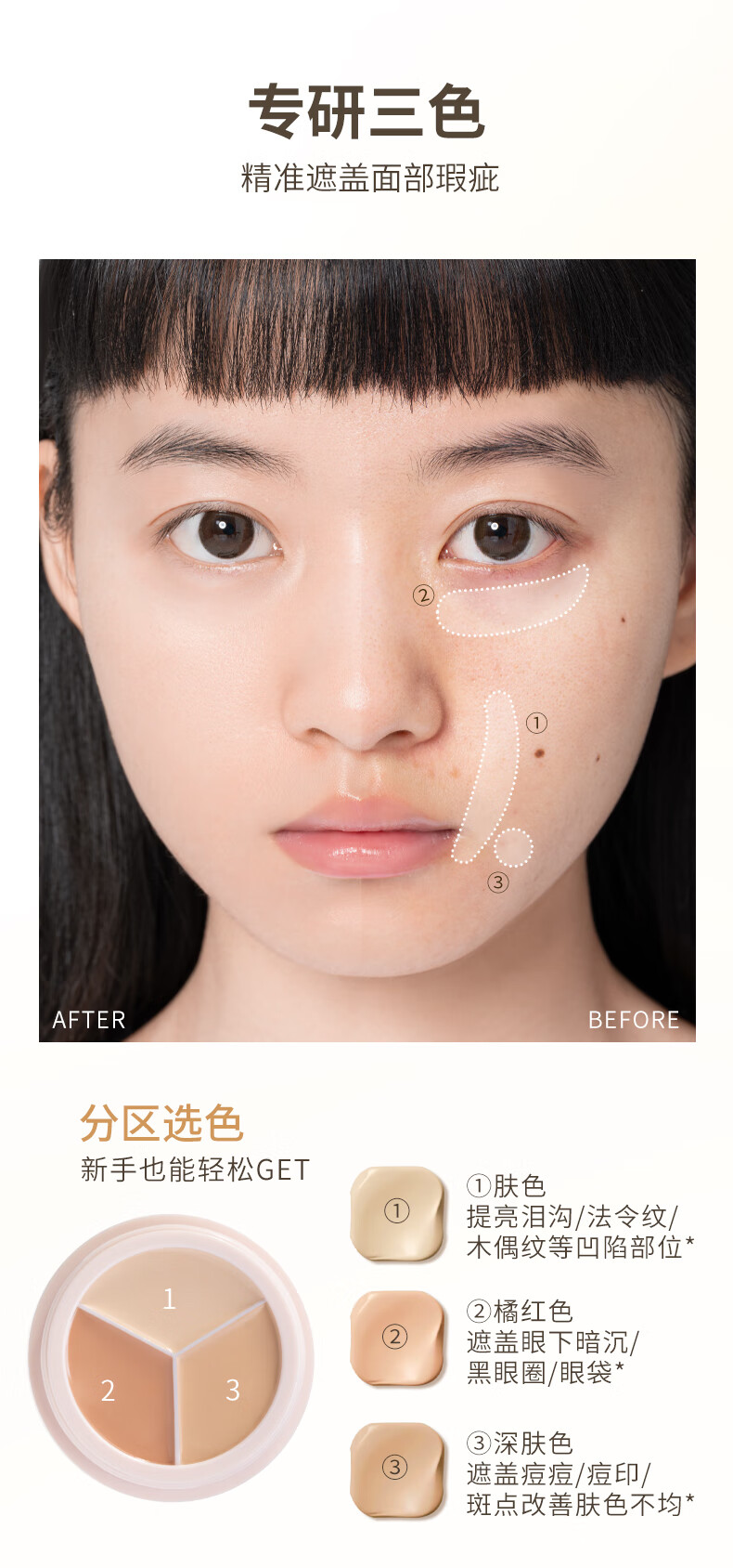 Miele's three-color concealer covers dark circles, tear troughs, acne marks, and does not stick to the nasolabial folds. The powder provides high coverage and is natural.