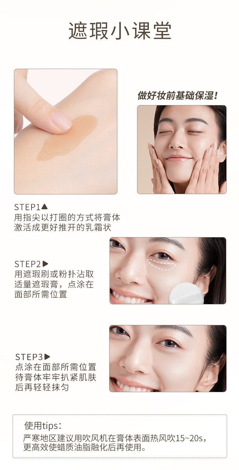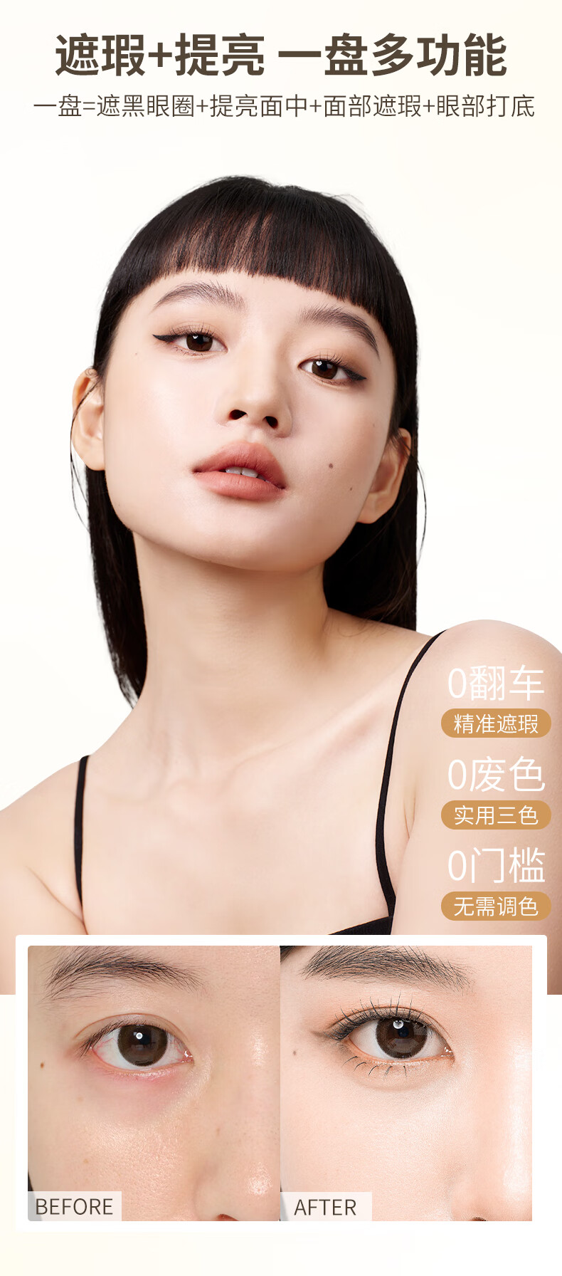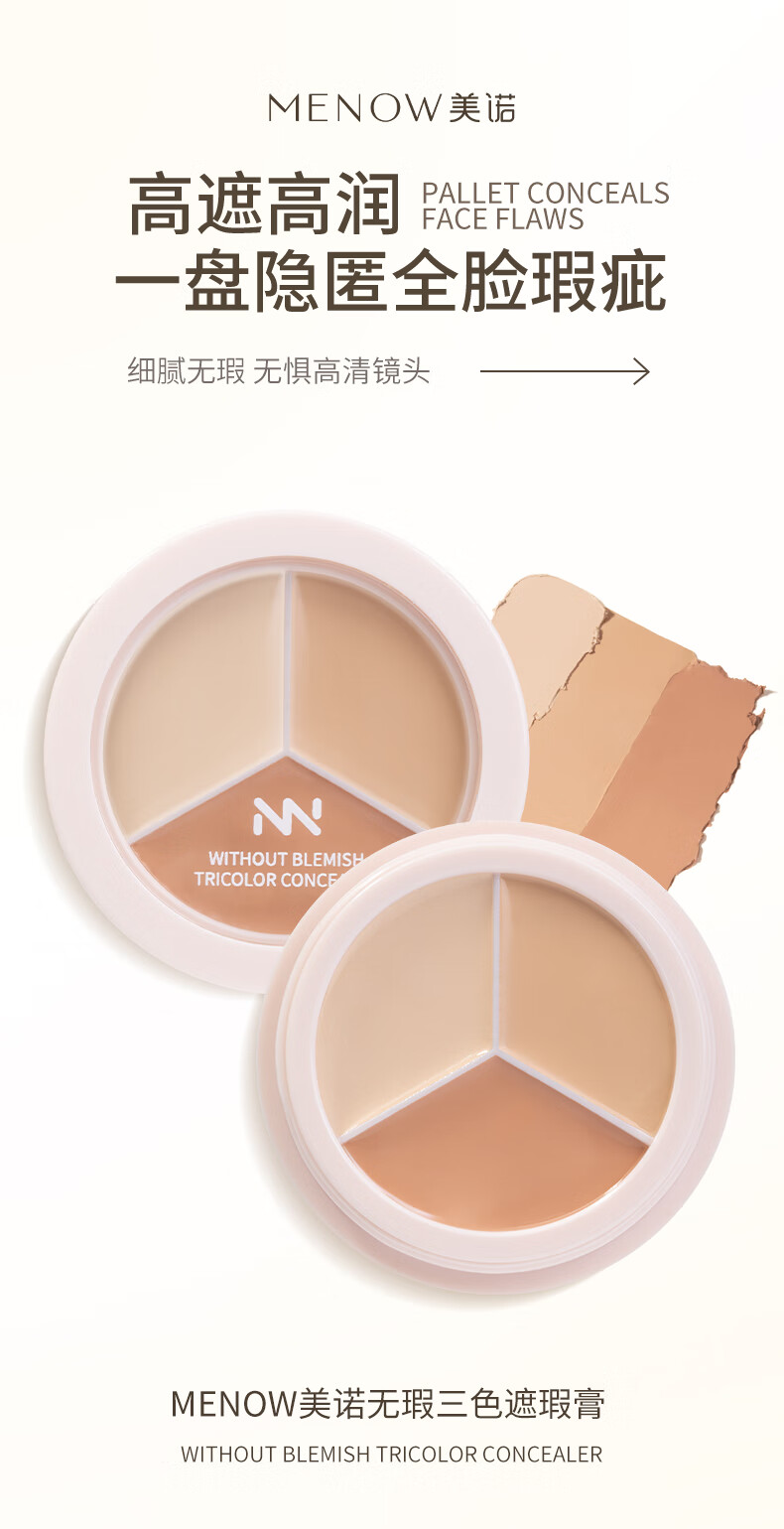 Miele's three-color concealer covers dark circles, tear troughs, acne marks, and does not stick to the nasolabial folds. The powder provides high coverage and is natural.