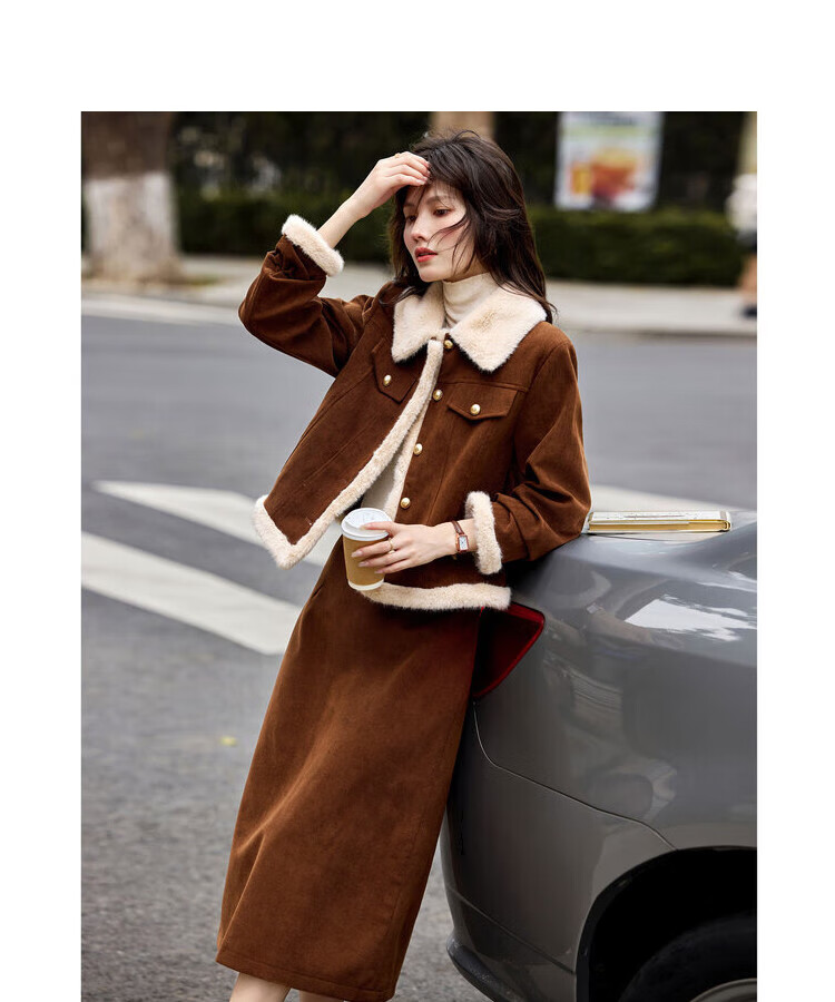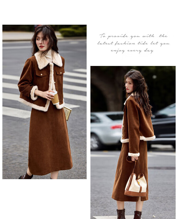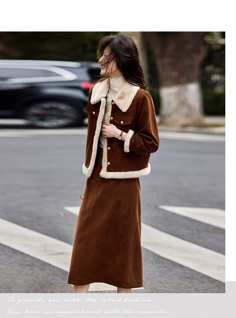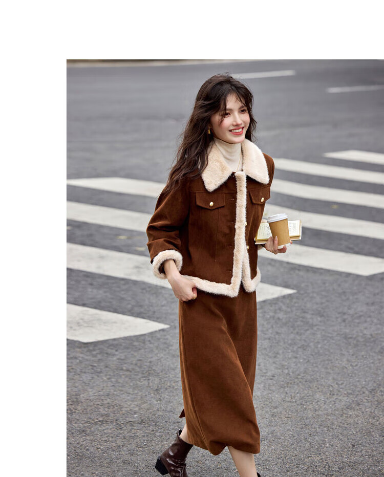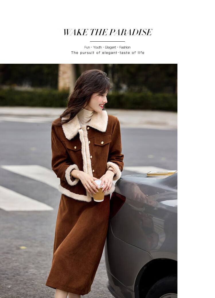 Awakening Paradise Winter Retro Modern Style Spliced Button Lapel Jacket Skirt Commuting Two-piece Suit Women Brown M