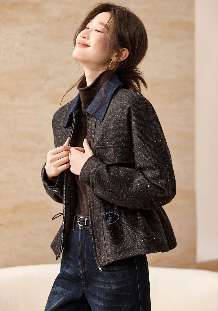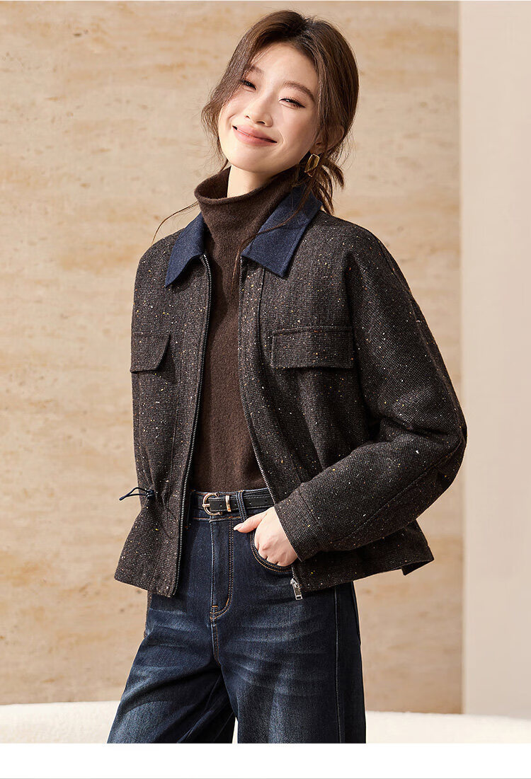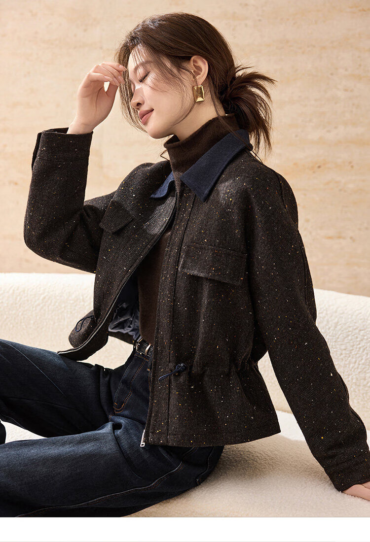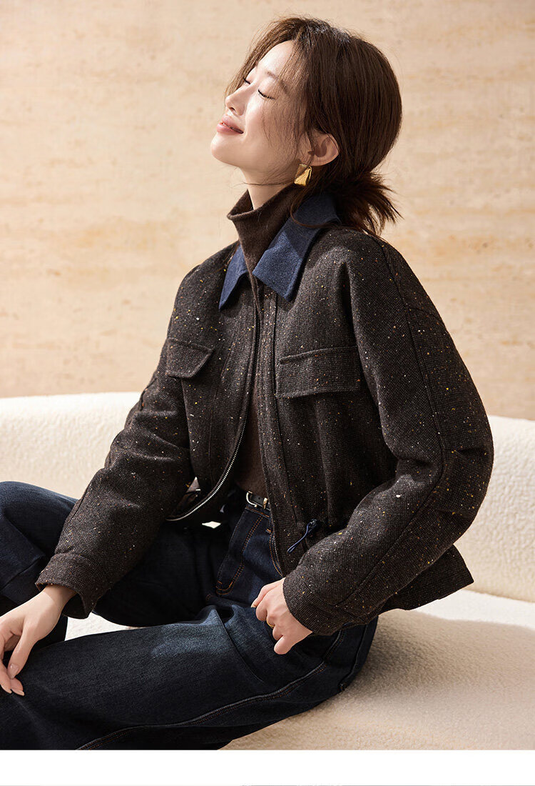Mohan Yimei 25 new winter style wool color-blocked lapel waist and dropped shoulders micro cocoon style workwear style short down jacket
