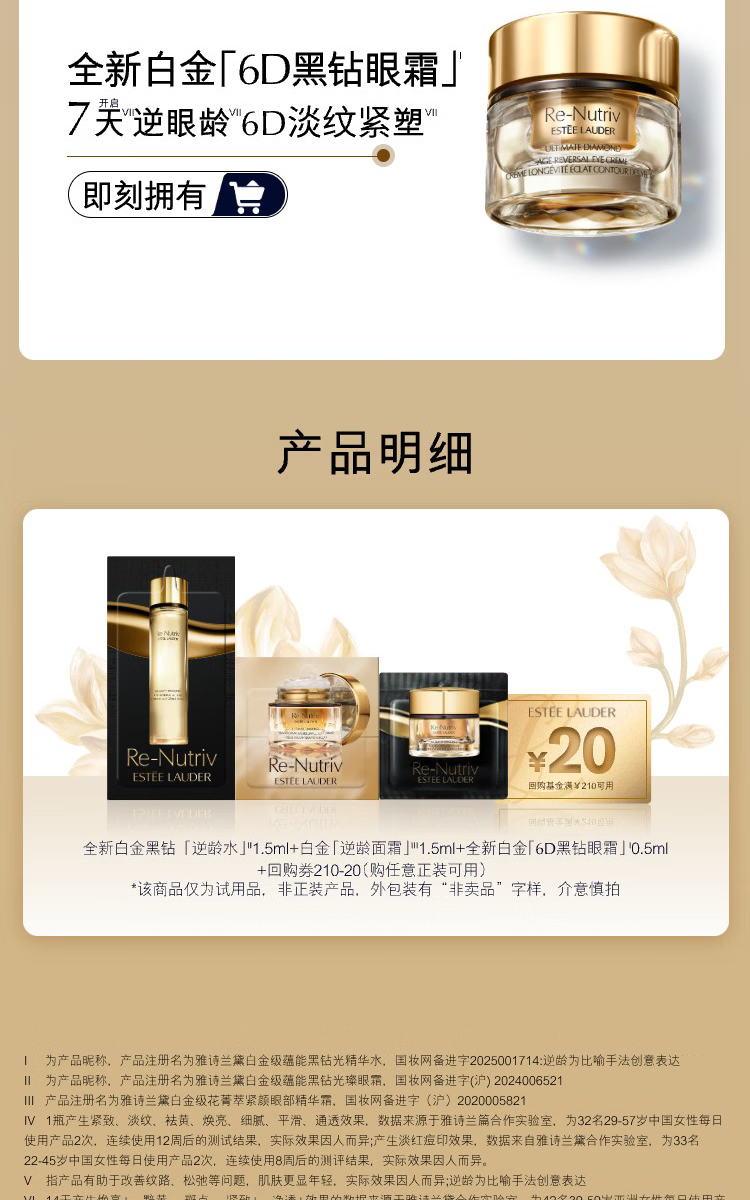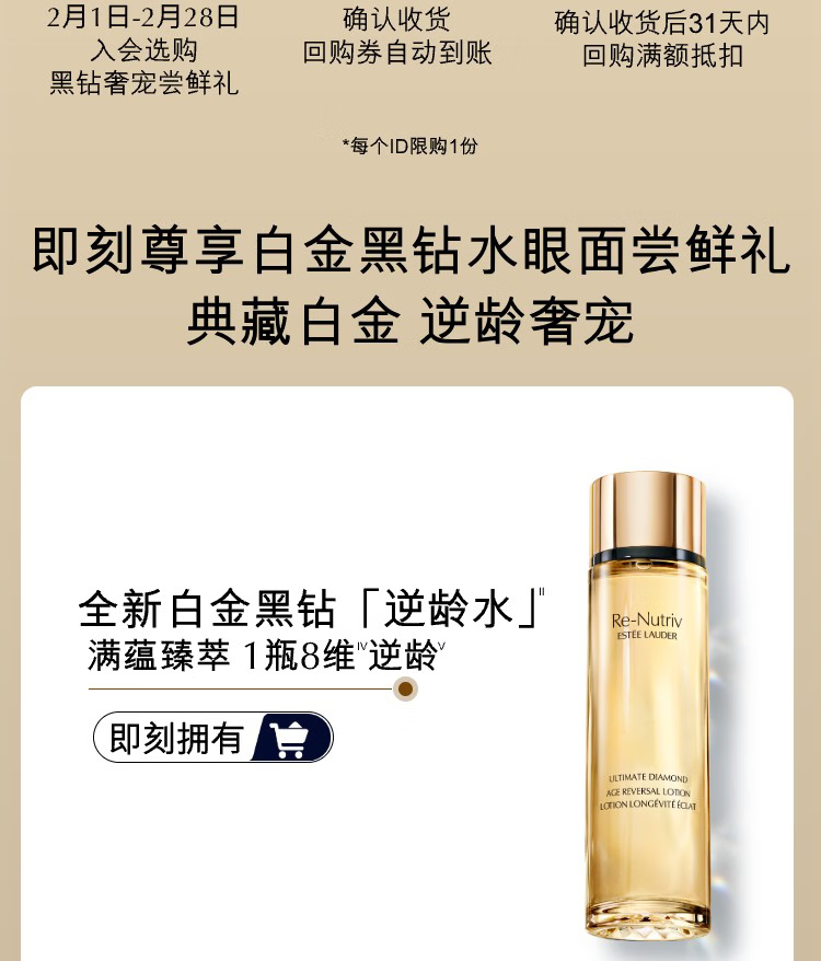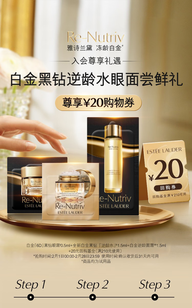 Estee Lauder 20 yuan coupon for new platinum and black diamond age-defying water for eyes and face. The early adopter gift is valid until April 27