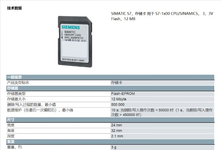 Siemens 6ES79548LE040AA0 SIMATIC S7 memory card 12 MB for S7-1x00 CPU