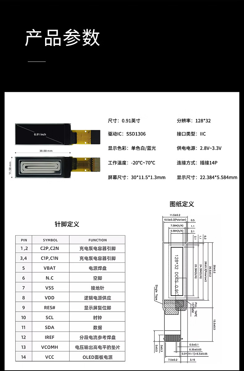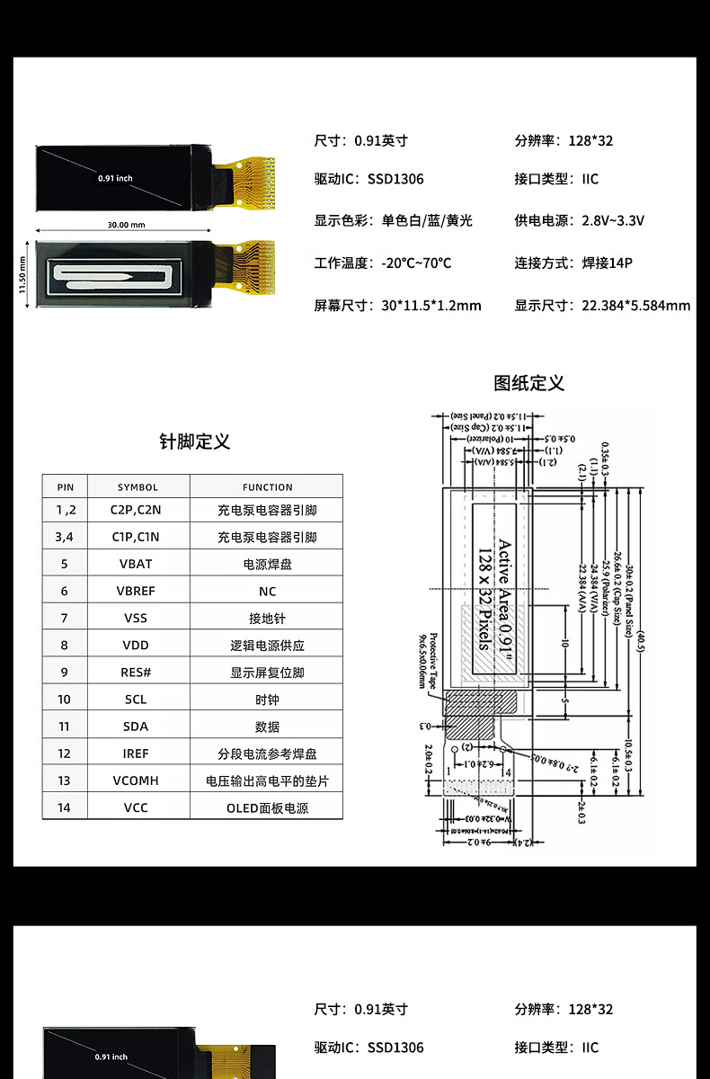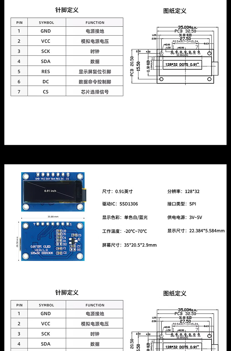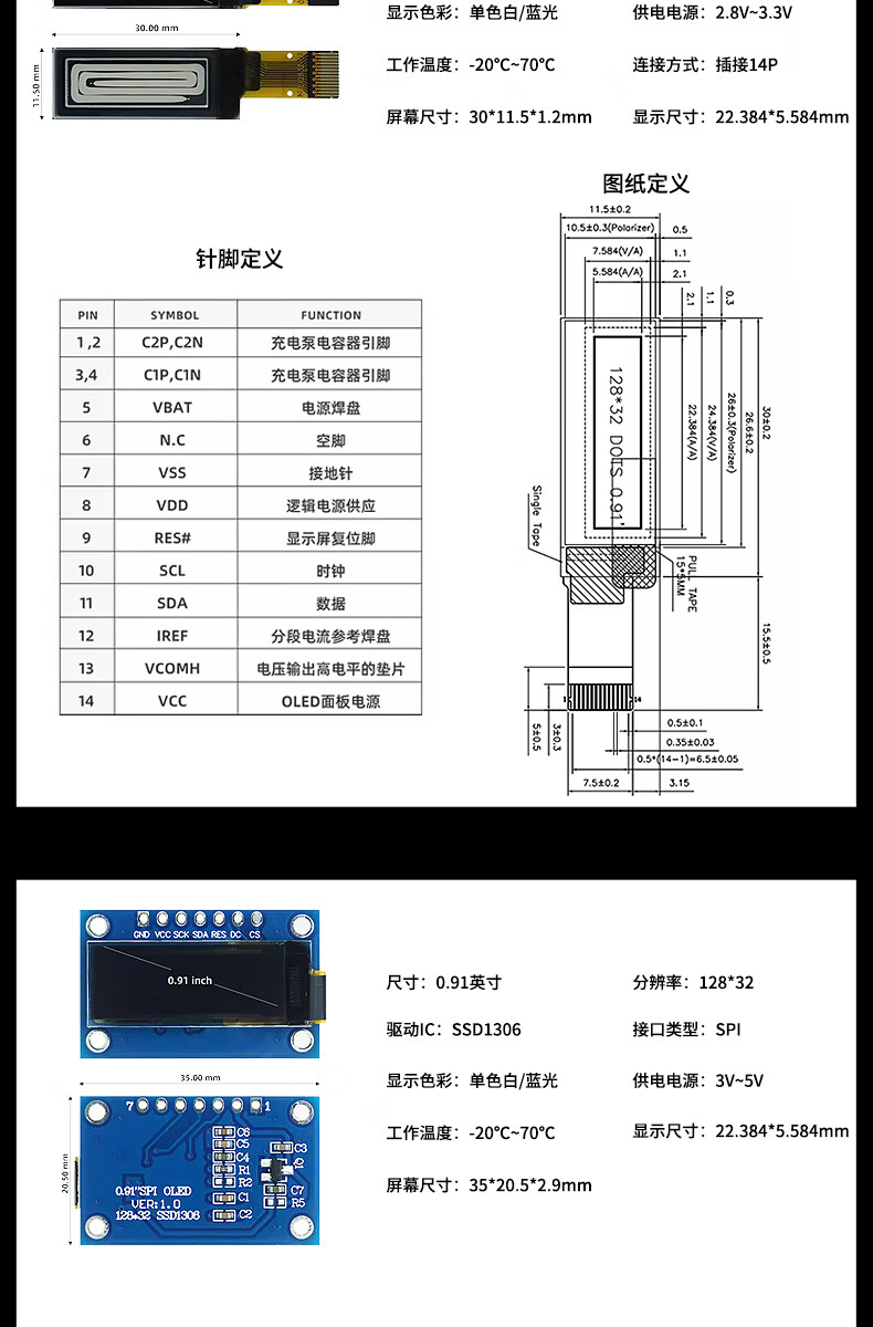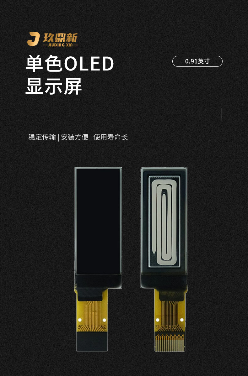 Jiudingxin monochrome OLED LCD screen development board bare screen small screen 128*32 IC chip SSD1306 0.91 inch non-soldering pin 7-pin module Blu-ray 2 pieces JDX-OLE09110