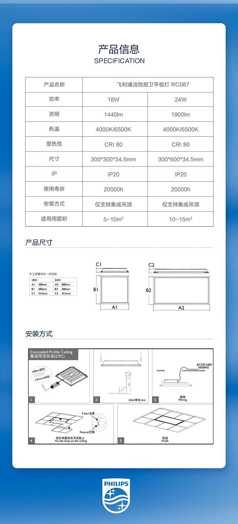 Philips (PHILIPS) LED integrated ceiling light flat light aluminum gusset light fixture waterproof IP44 18W white light 300x300