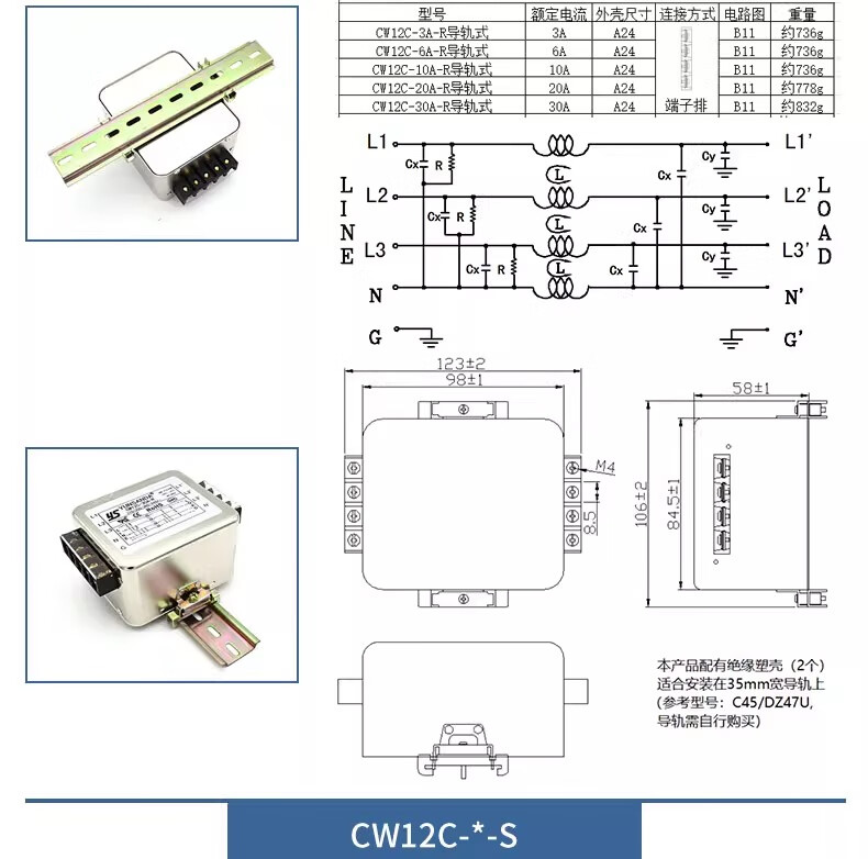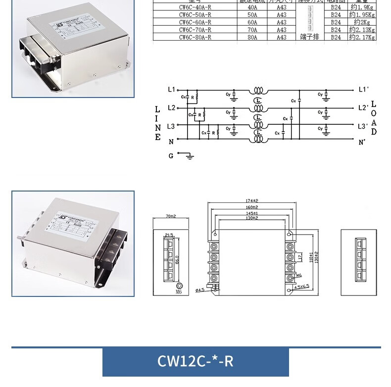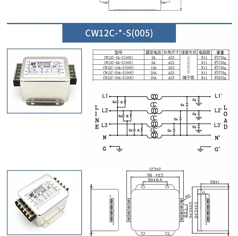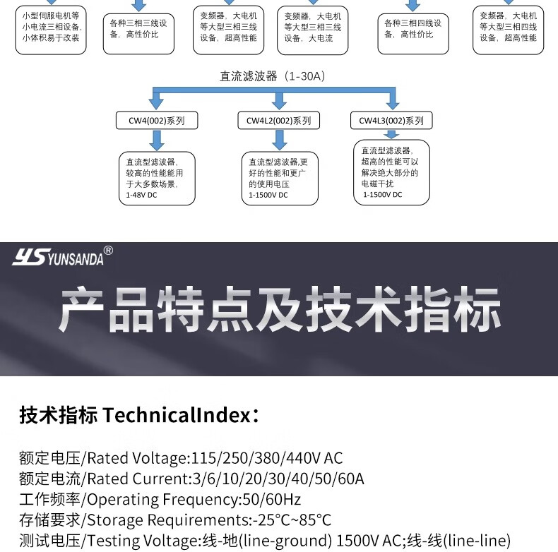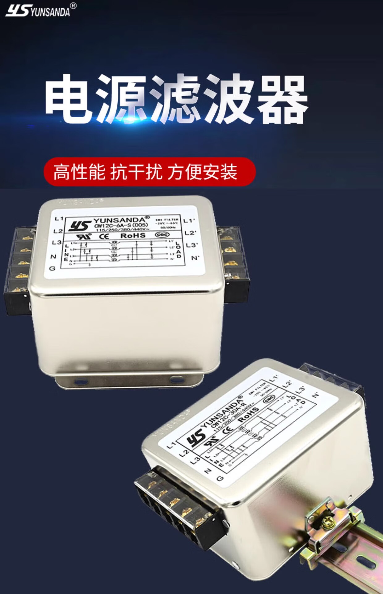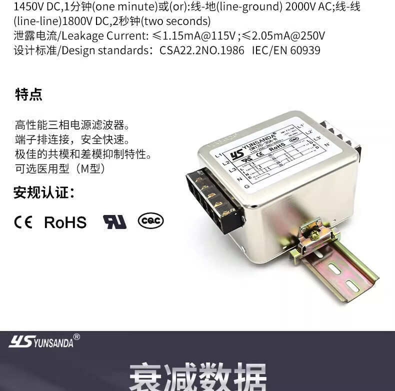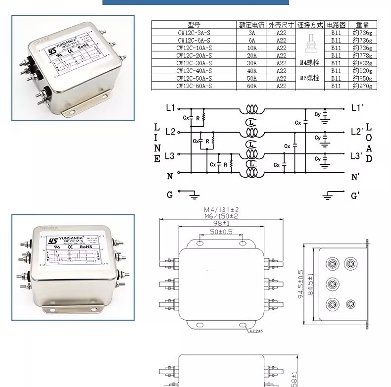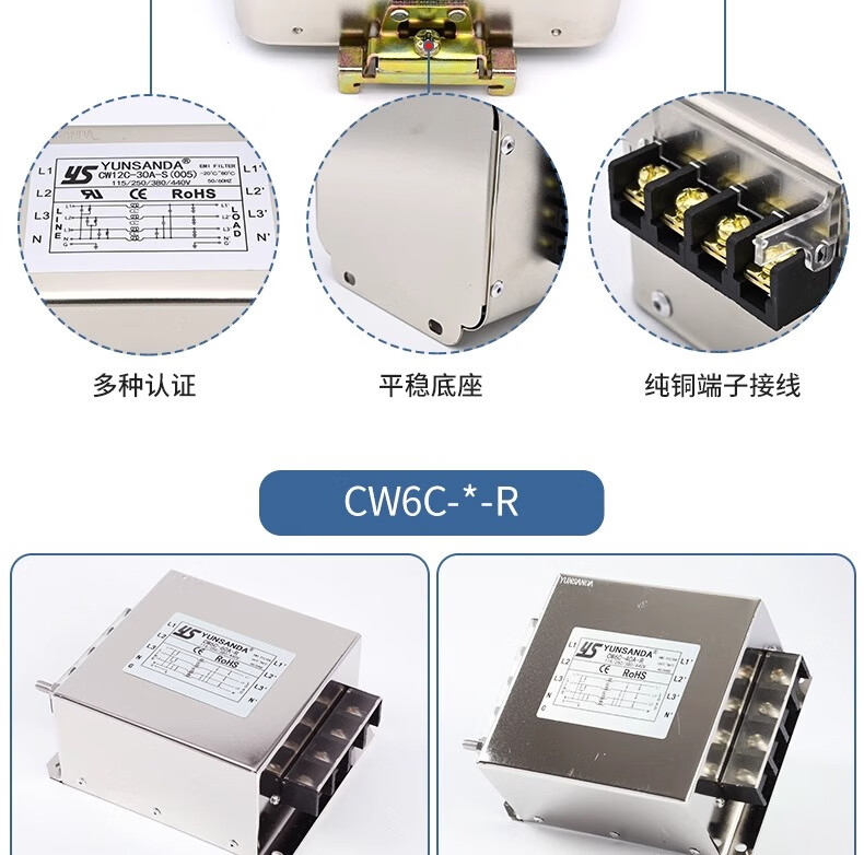 YS YUNSANDA AC purification 380v three-phase four-wire inverter power filter CW12C-50A-S screw connection